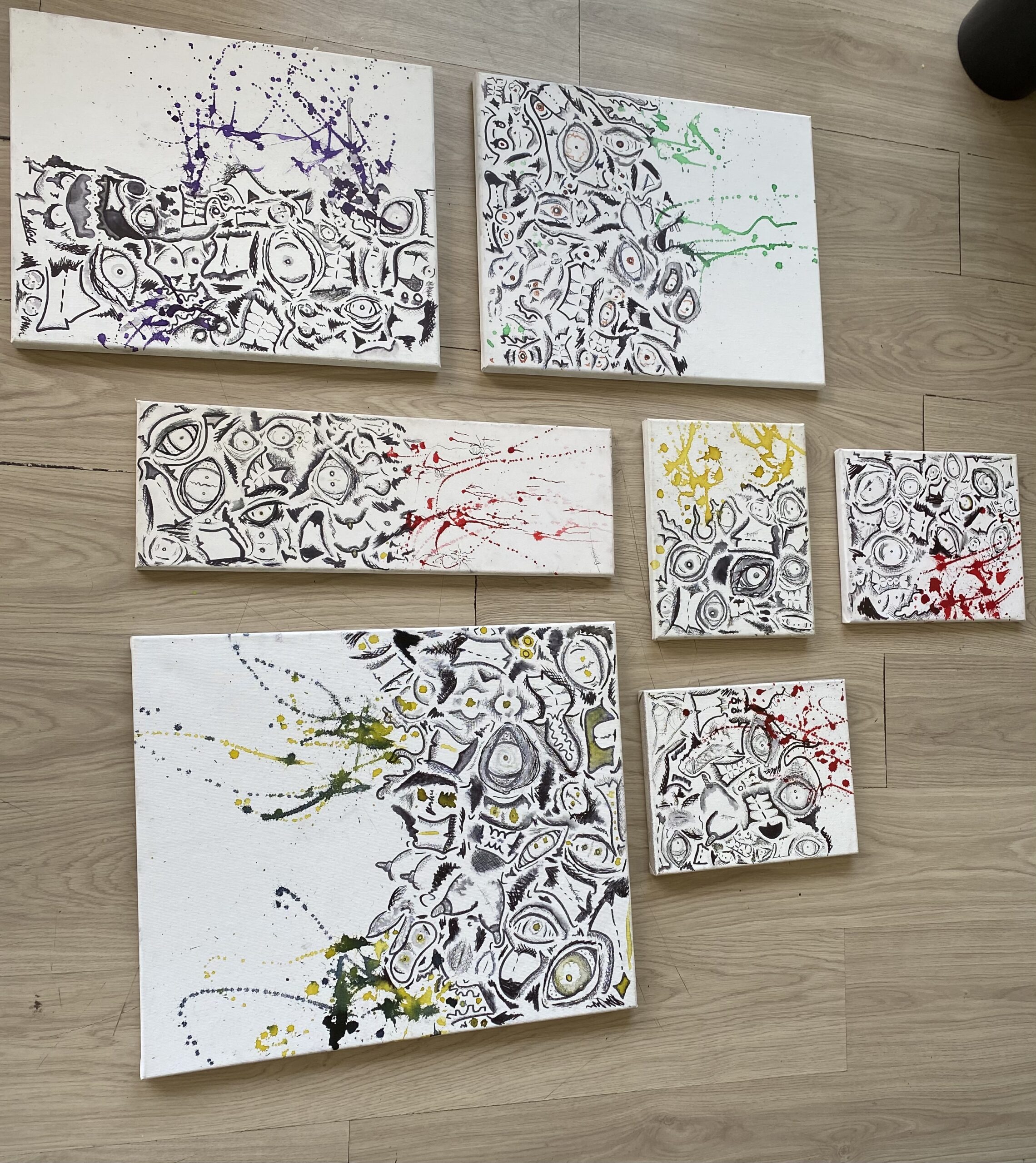 Deze serie bestaat uit verwerkingen van zwart wit tekeningen met kleur spatten daaraan toegevoegd.