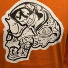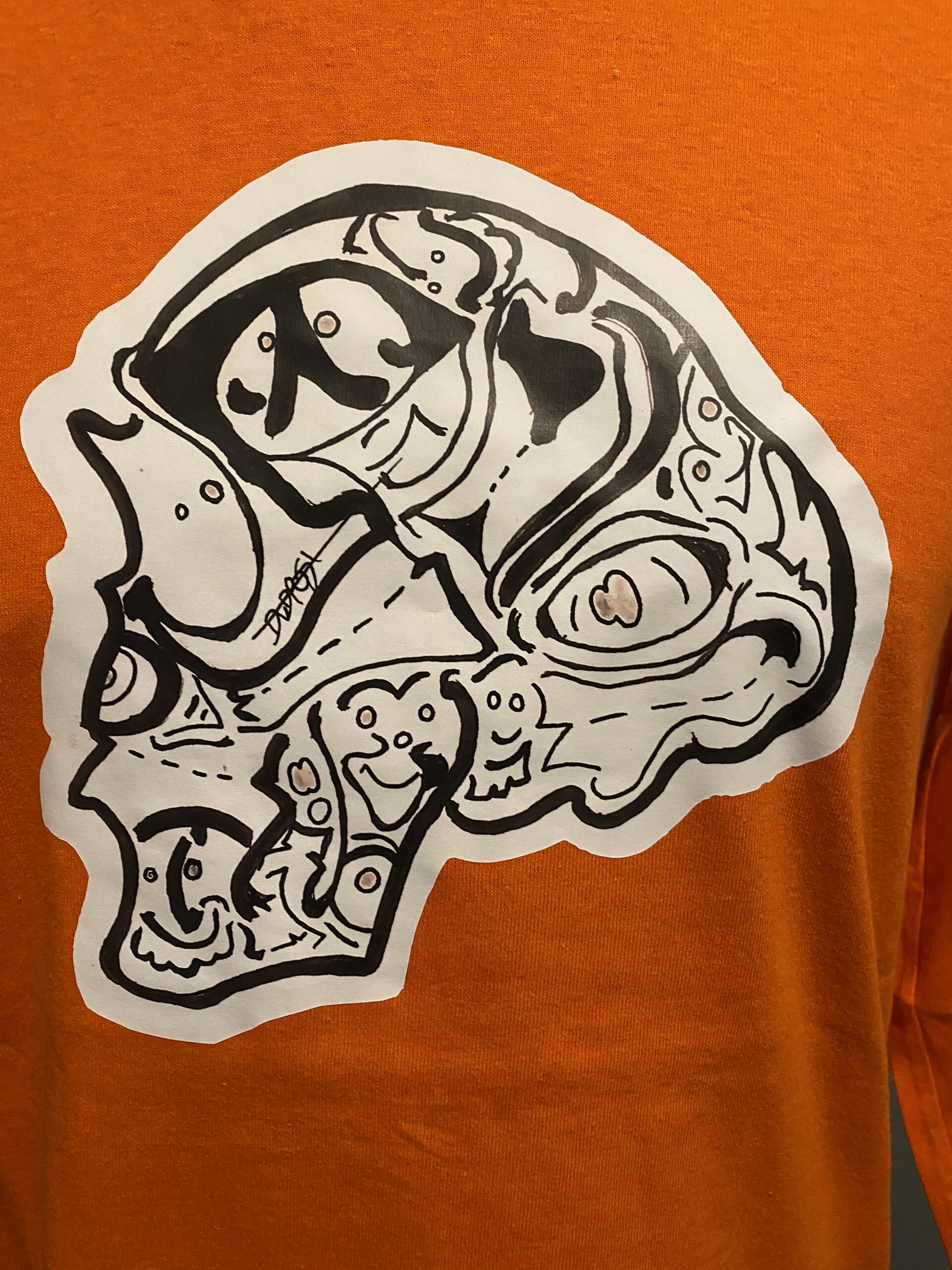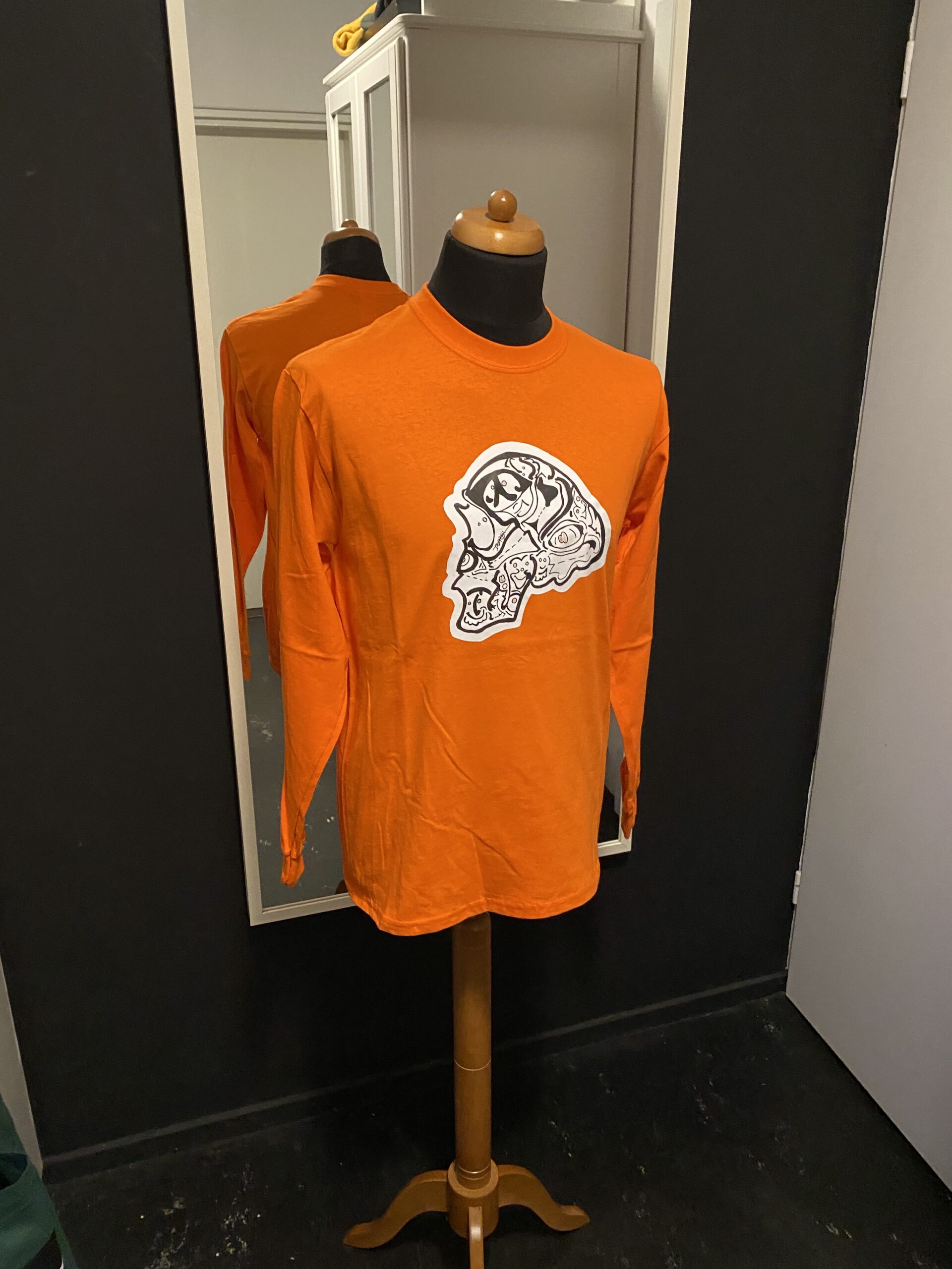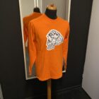 Oranje ultra cotton shirt met lange mouwen. Op de voorkant een fantasie design schedel van de artiest Djethro van der Post. Die zijn inspiratie haalde uit de oude catacomben in Rome, waar de slachtoffers van de zwarte pest geborgen werden. Geïnspireerd door de oude verhalen van de pest, over de slachtoffers die op karren uit de stad Rome werden gereden. De mannen met de vogel maskers op die de doden verzamelden en naar de begraafplaatsen droegen.