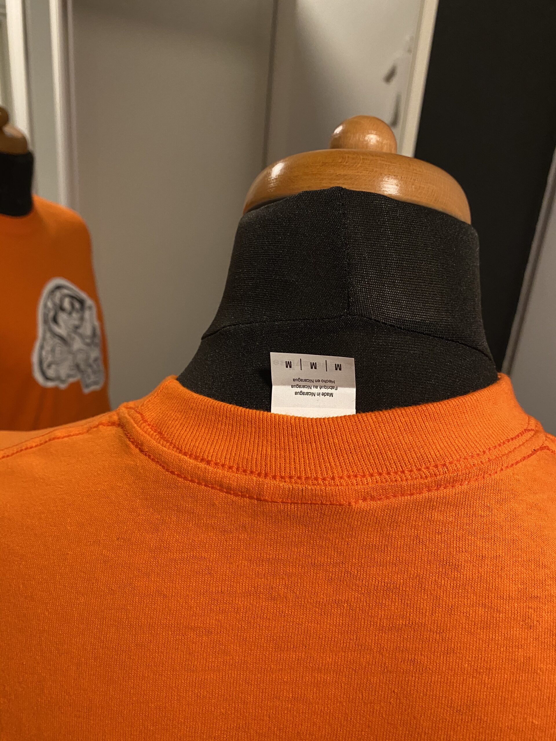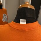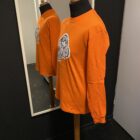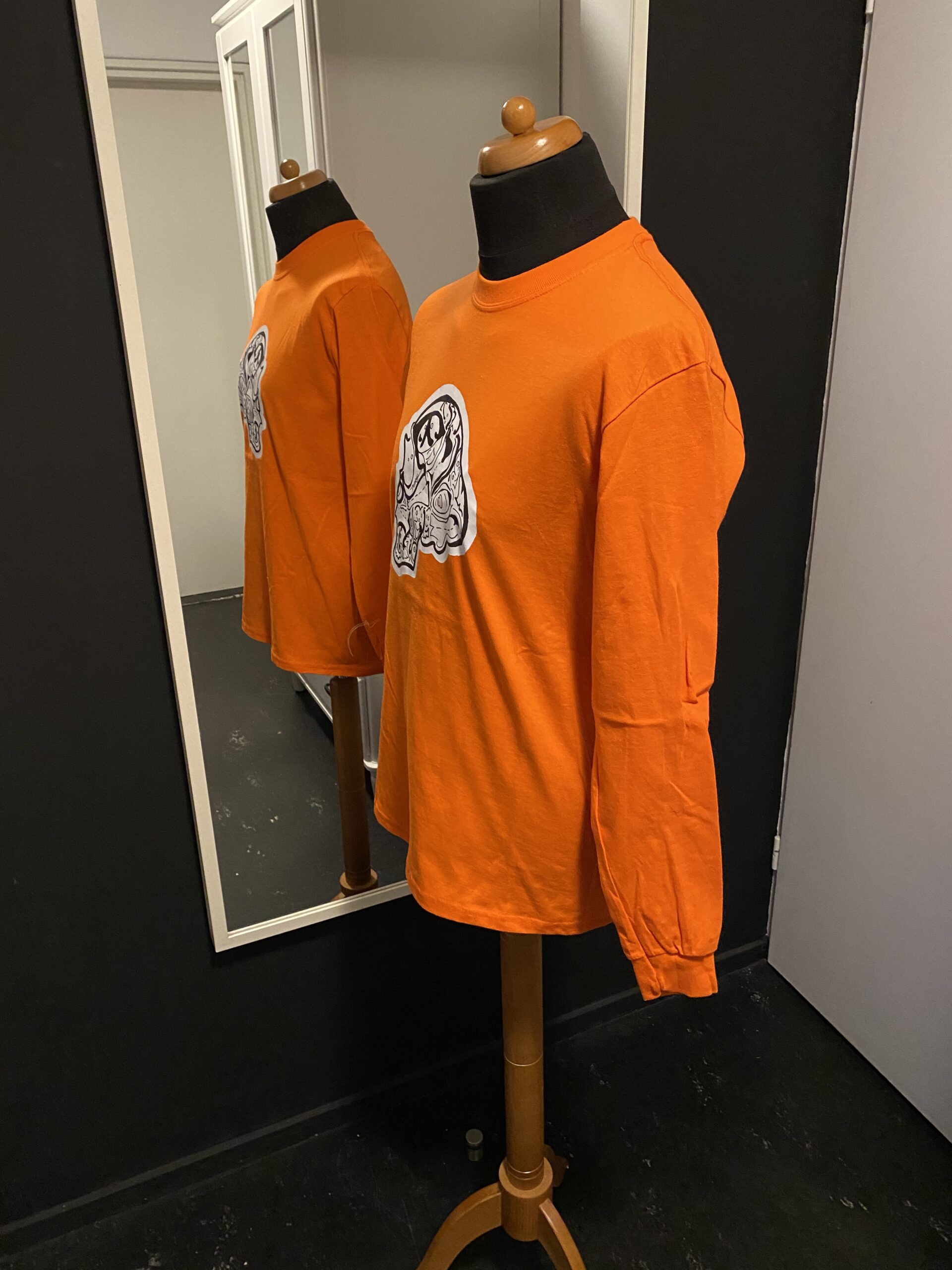 Orange, ultra cotton long sleeves shirt. On the front a fantasy design from the artist Djethro van der Post. He was inspired by the old catacombs in Rome, were they buried victims of the Black Death. Inspired by the stories of the Black Death, and the chariots on which they laid down the victims to ride them out of Rome. Those man with bird like masks , who collected the dead and carried them out to the cemetery.