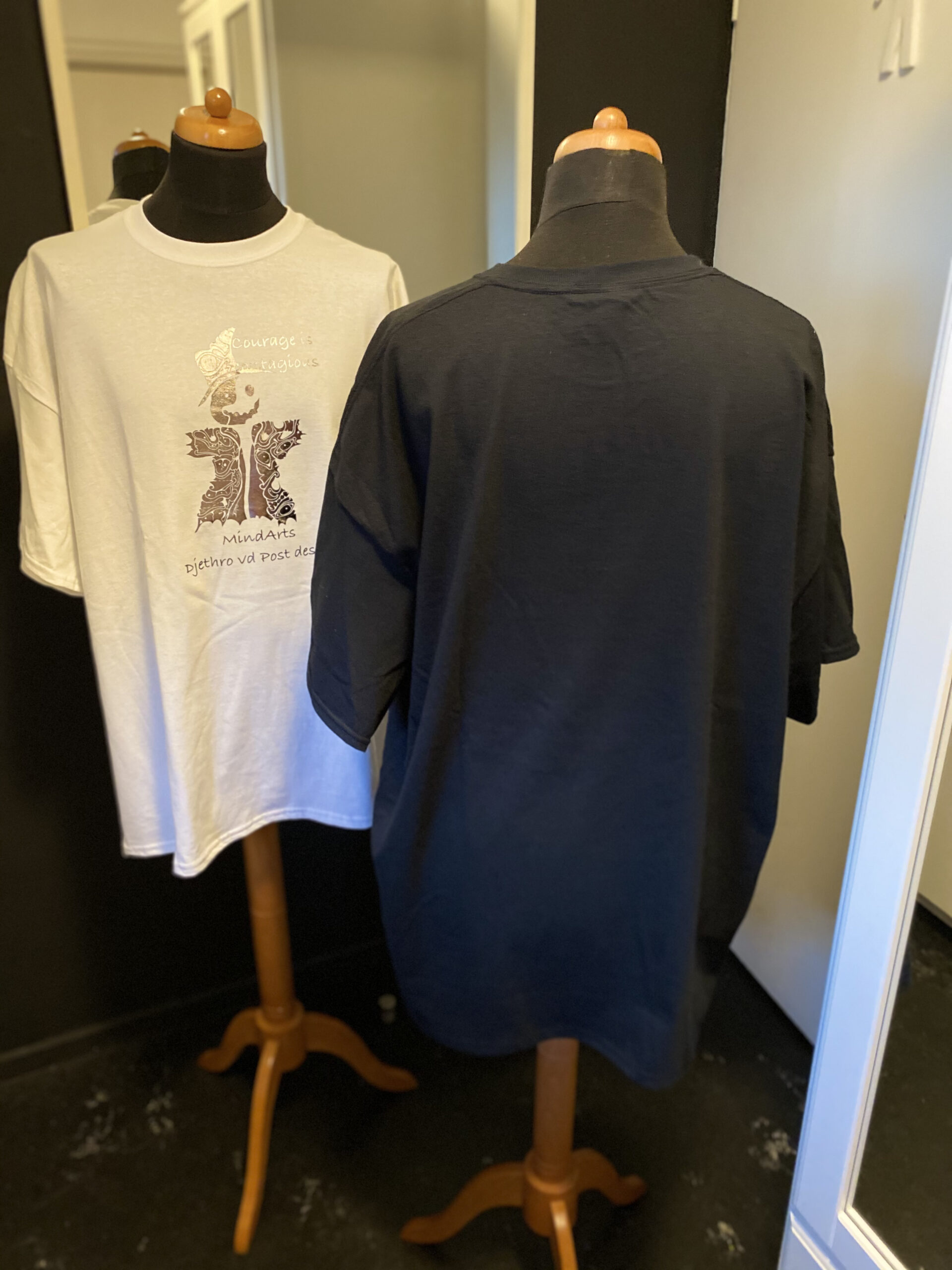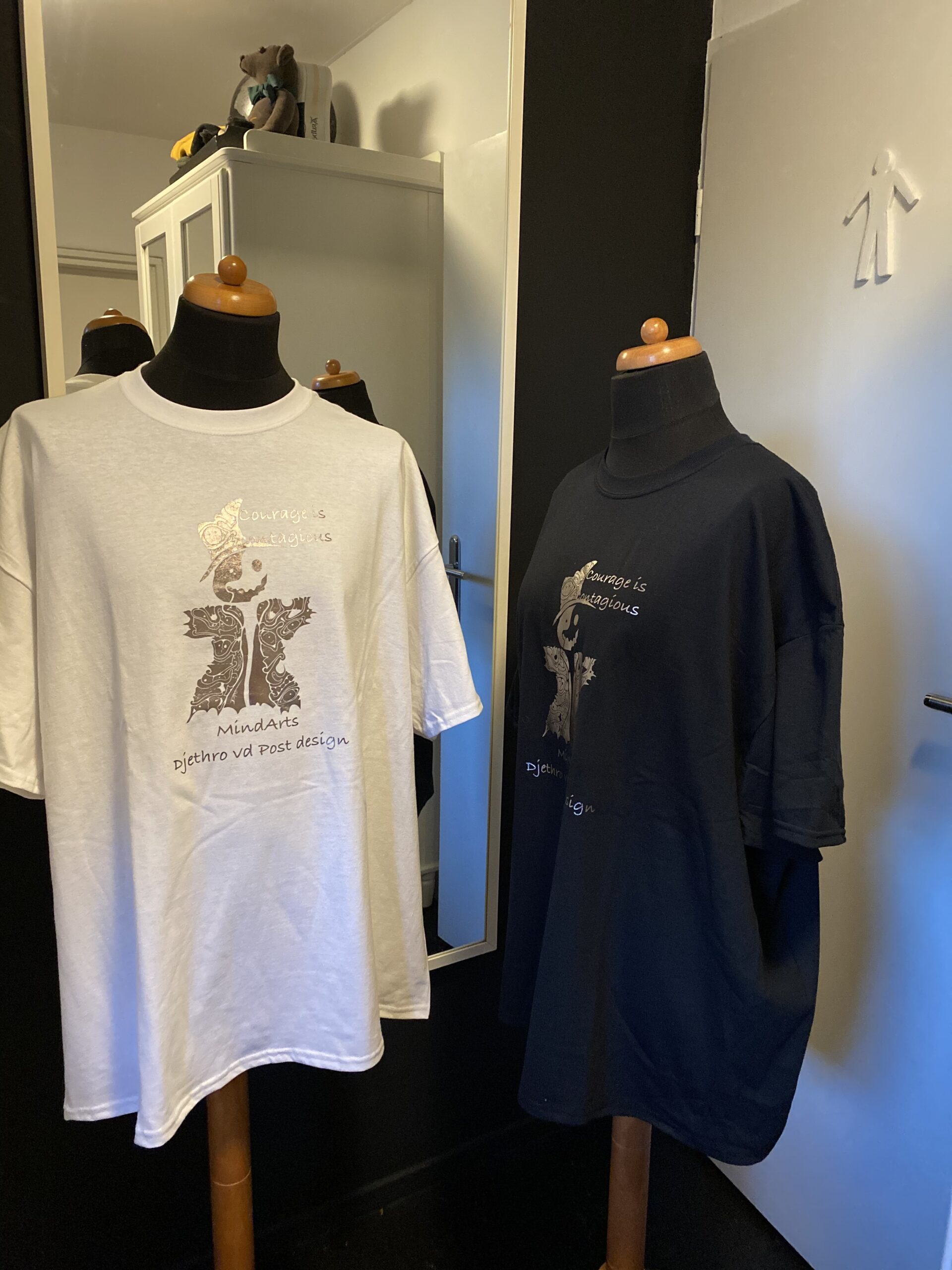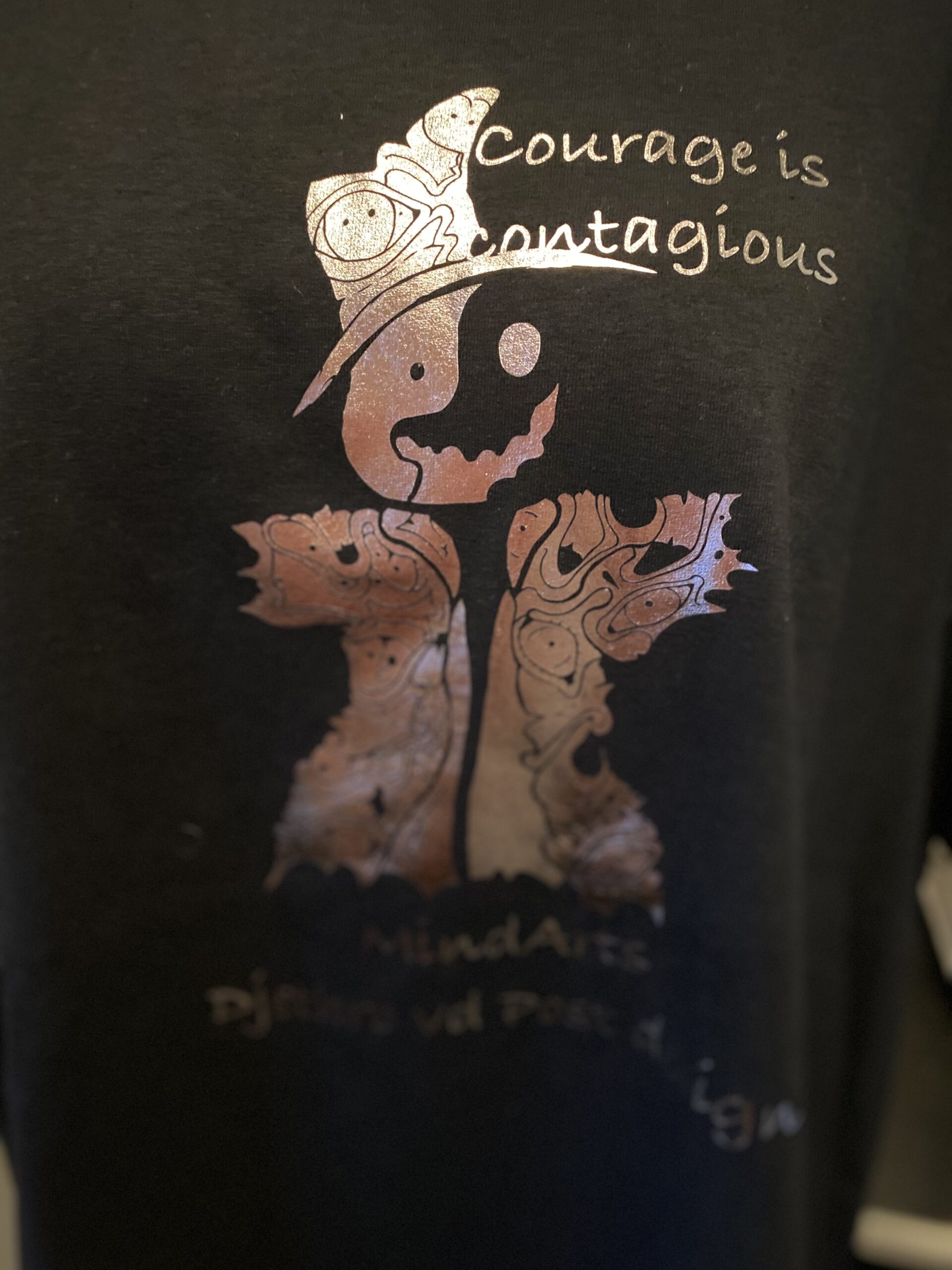 Dit shirt heeft een print met een verbeelding van een geest. Deze geest staat voor angst. Angst is besmettelijk, als iedereen bang is neem je gemakkelijk mensen mee in de angst. Voor ons is het van belang dat Moed, Courage, even besmettelijk is. Als je er met elkaar voor gaat en je angst overwint, kun je samen groots worden. En elkaar een hart onder de riem steken.