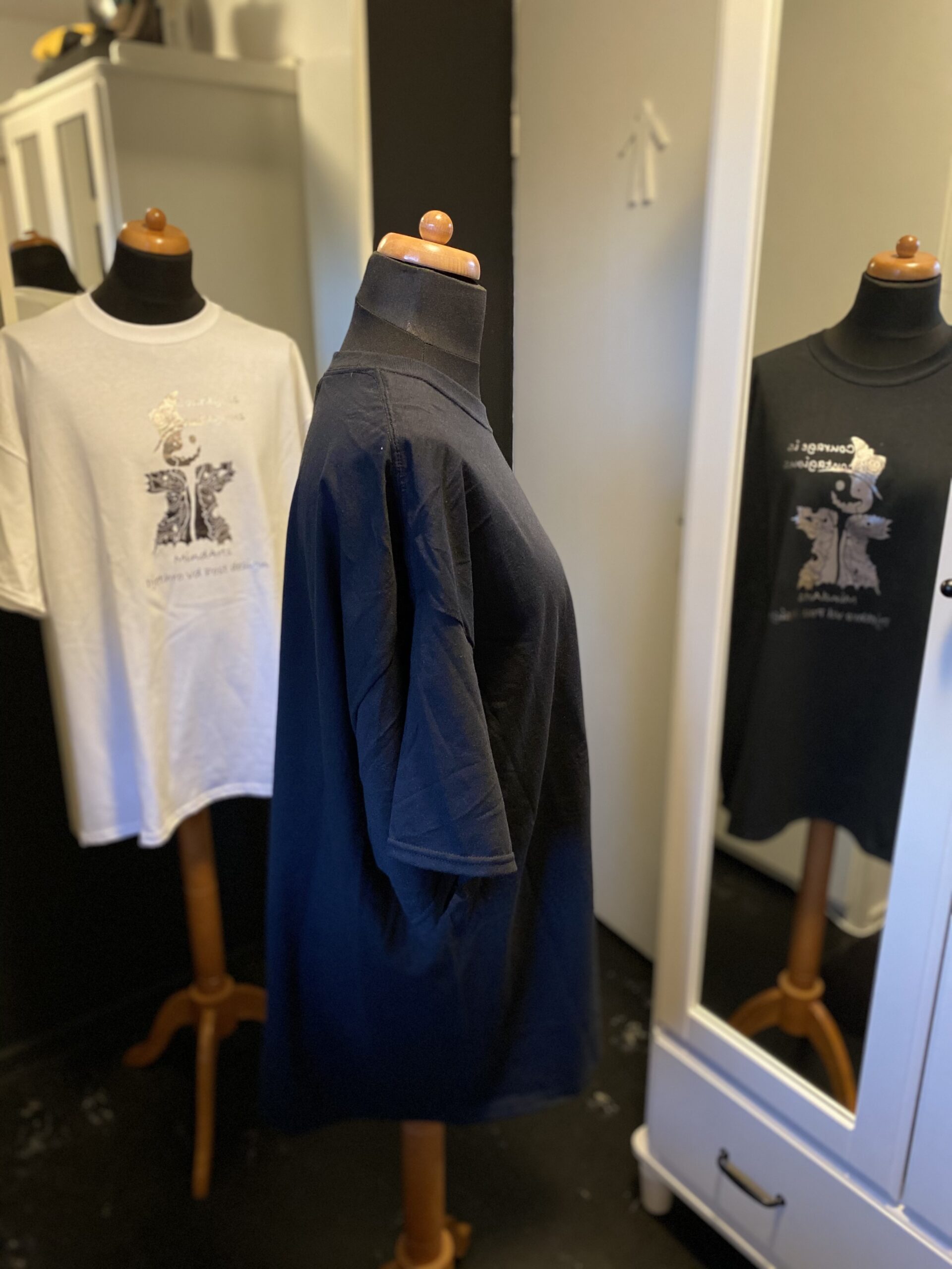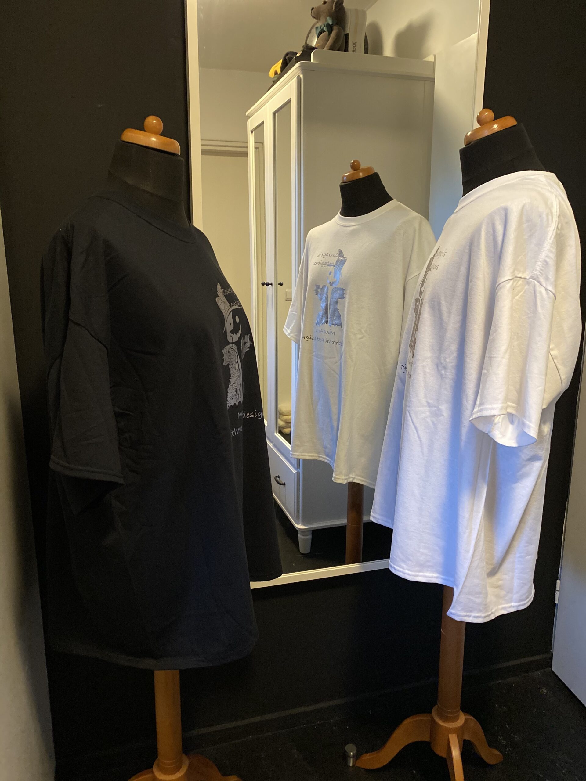 This shirt has a print with a ghostly design. This ghost represents fear. Fear is contagious, if everybody is afraid it’s easy to follow in fear. For us it’s just as important how much contagious Courage is.  If you walk together and overcome our fear, we’ll grow together and give each other courage.