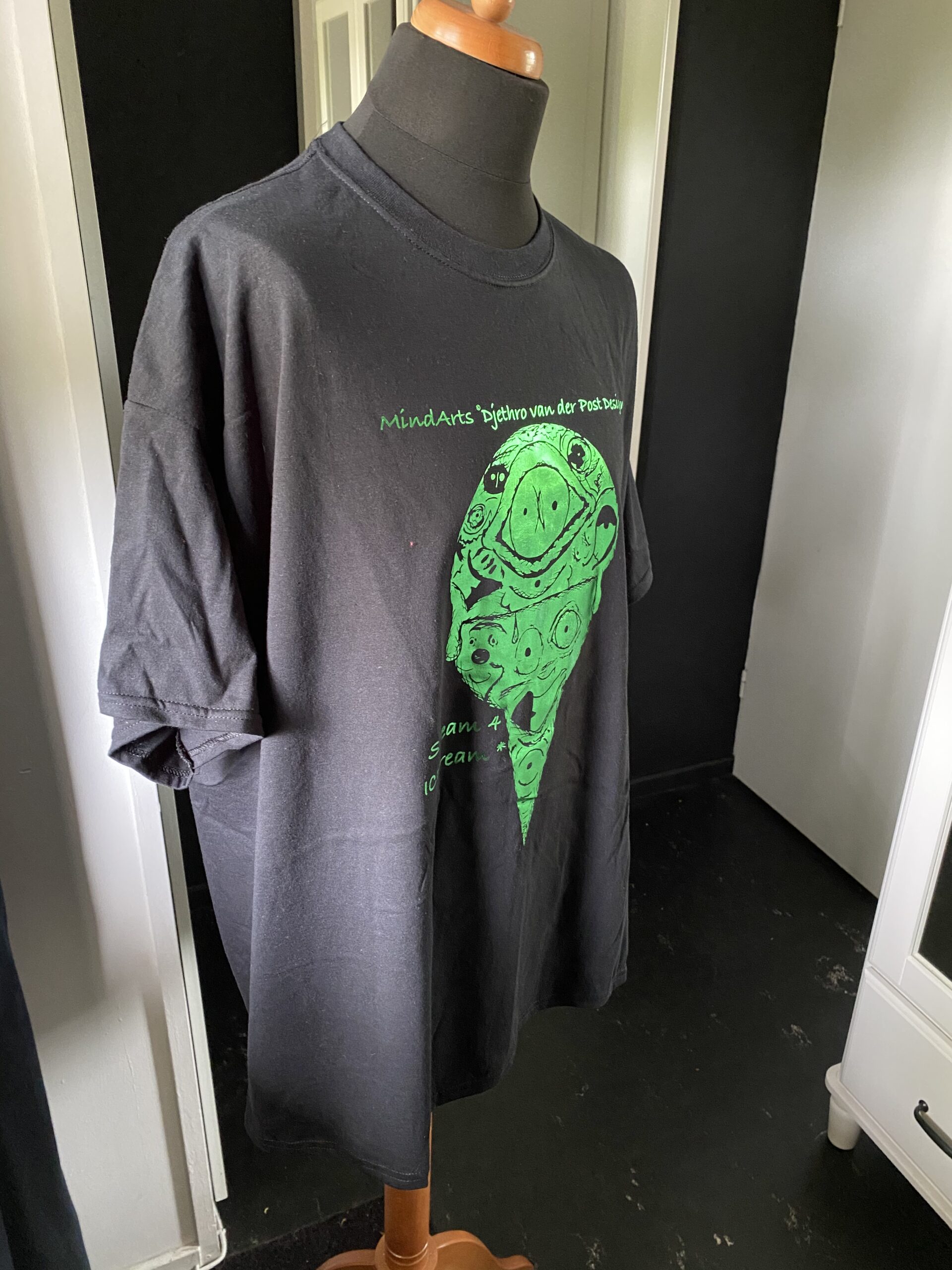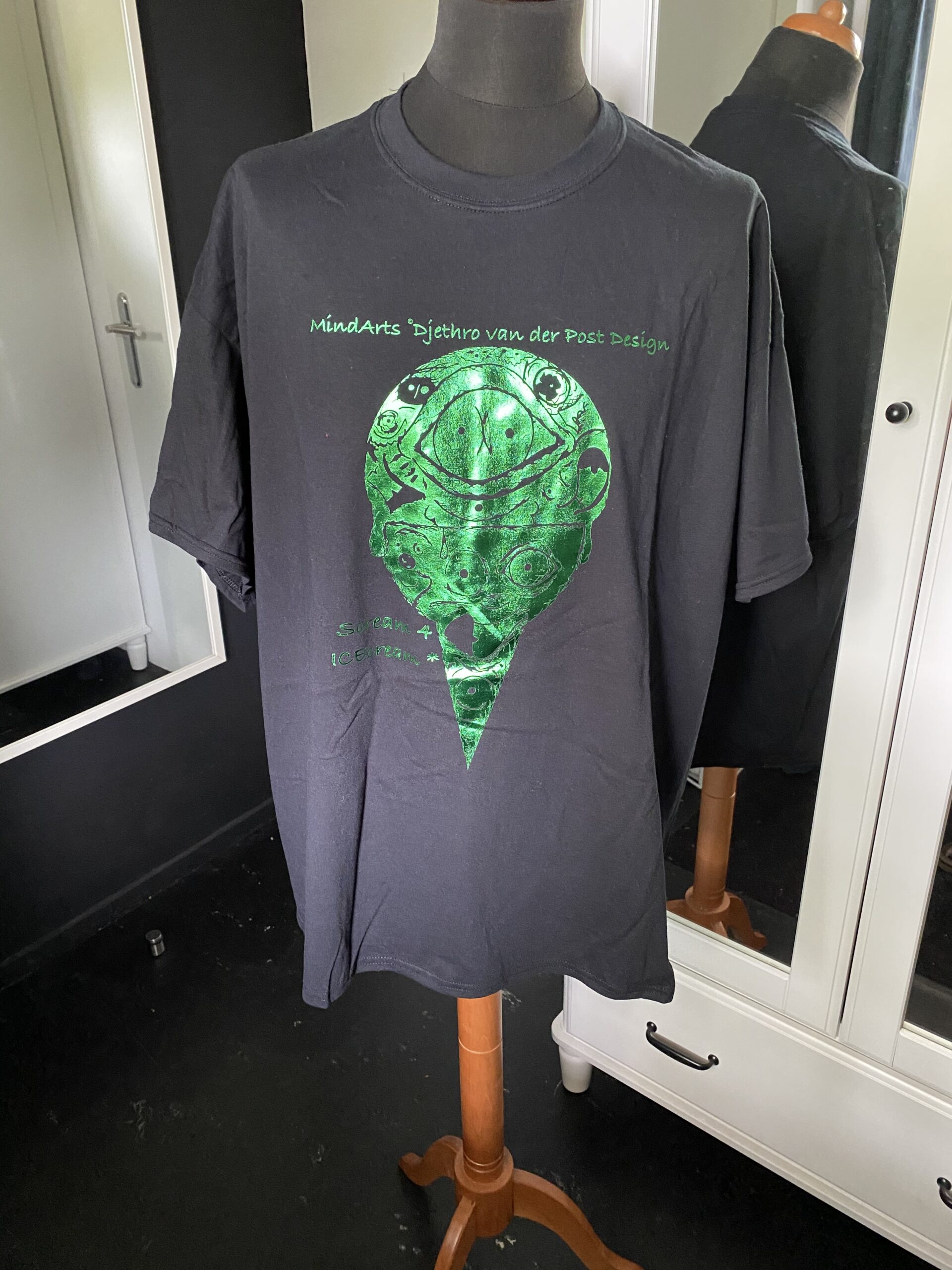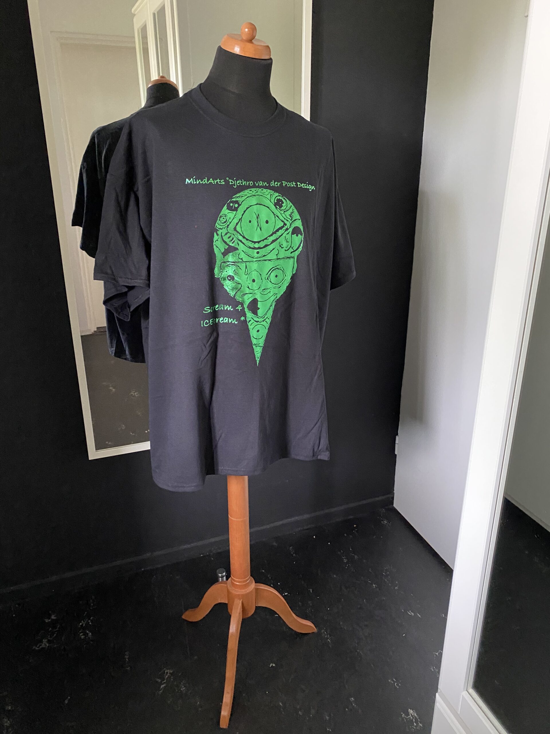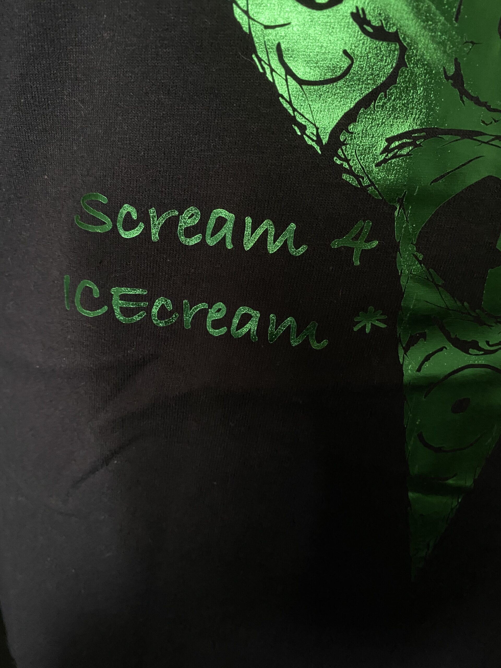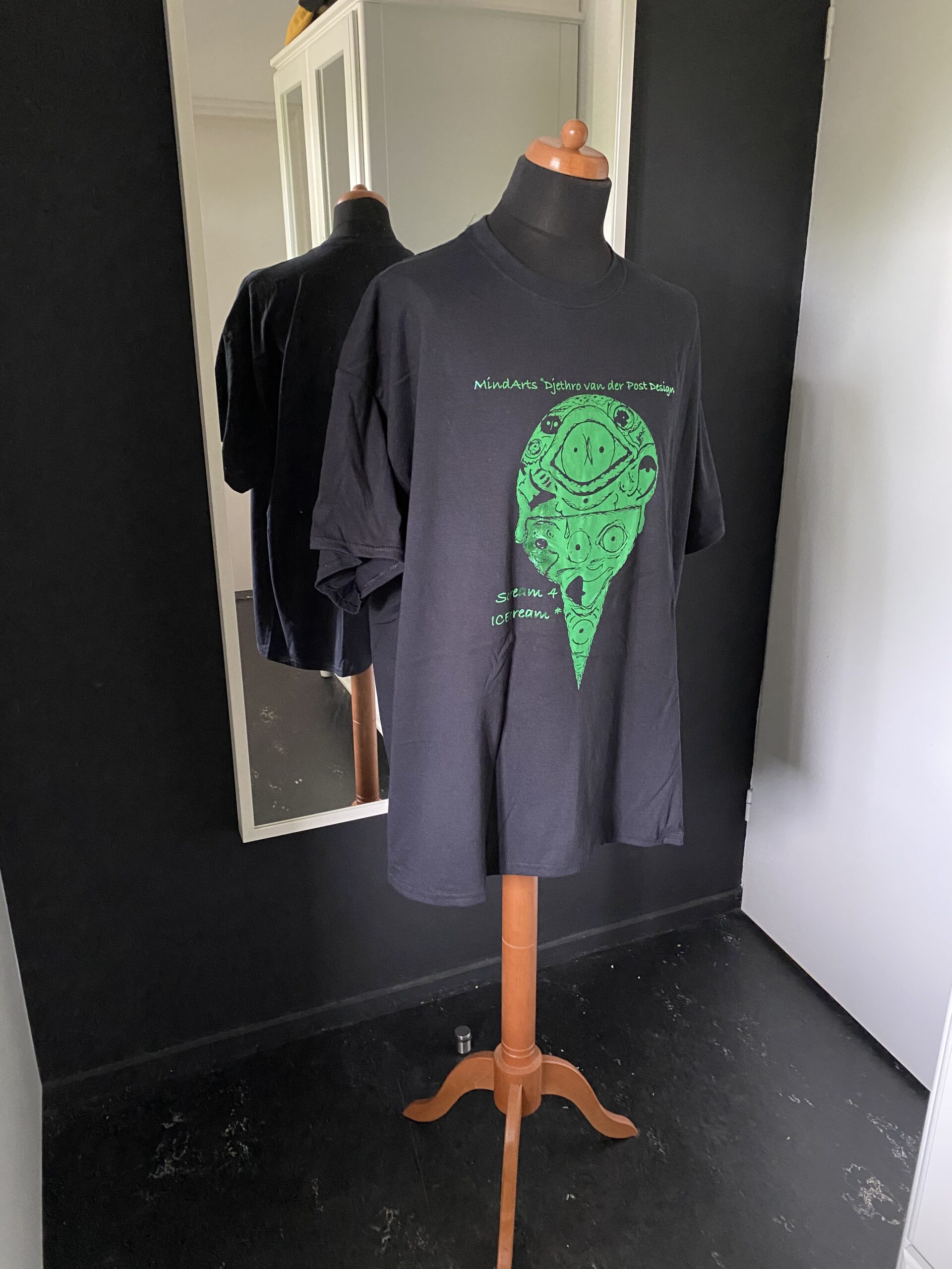 Ice cream shirt to melt away, in the very recognisable style by Djethro van der Post the Dutch artist a lovely icy shirt too melt away. In a surprisingly metallic green colour on a black shirt. You almost begin to salivate looking at this ice cream. And maybe feeling as fresh as ice wearing this shirt. Anyway “ We love ice cream!”