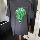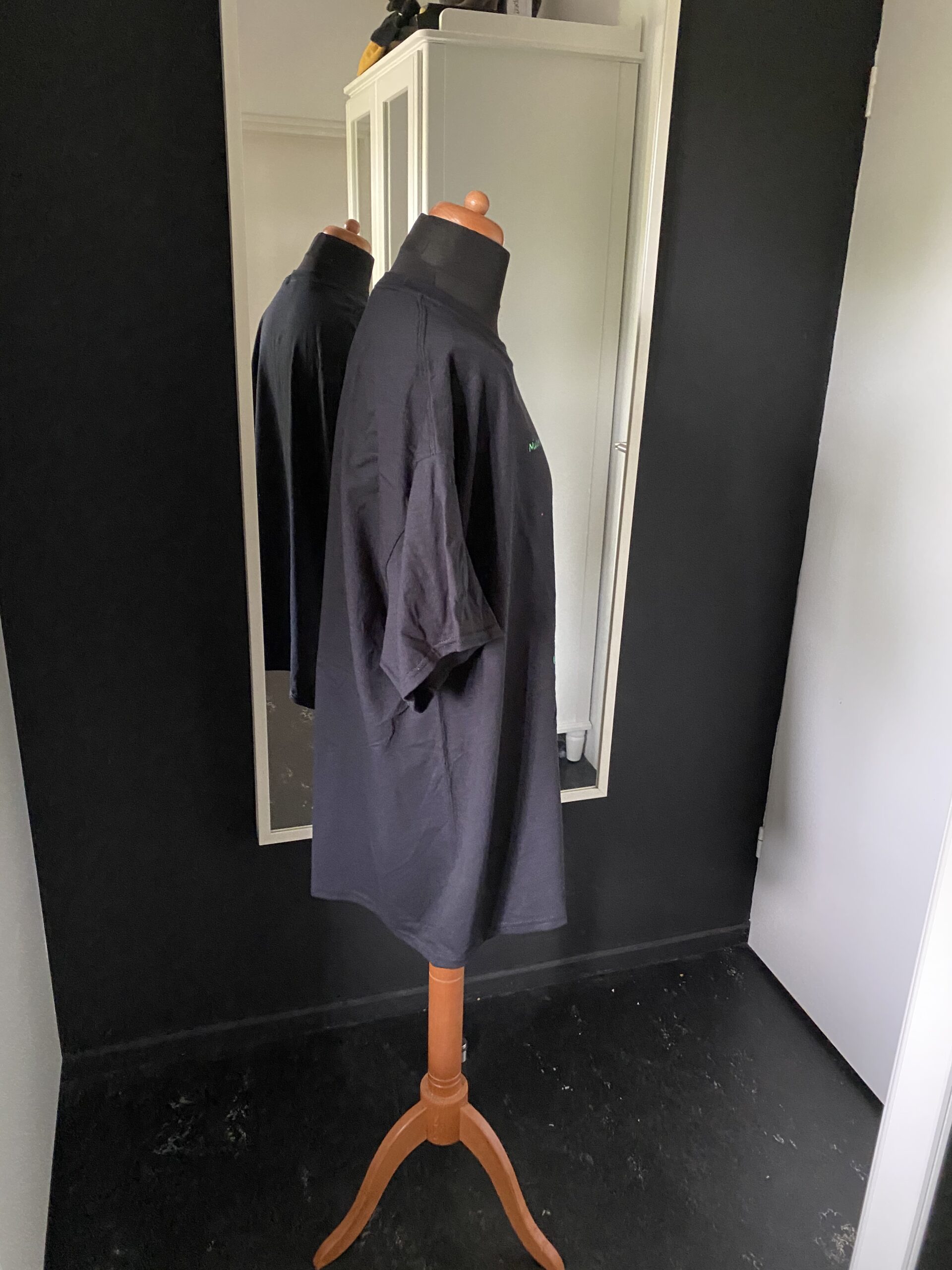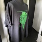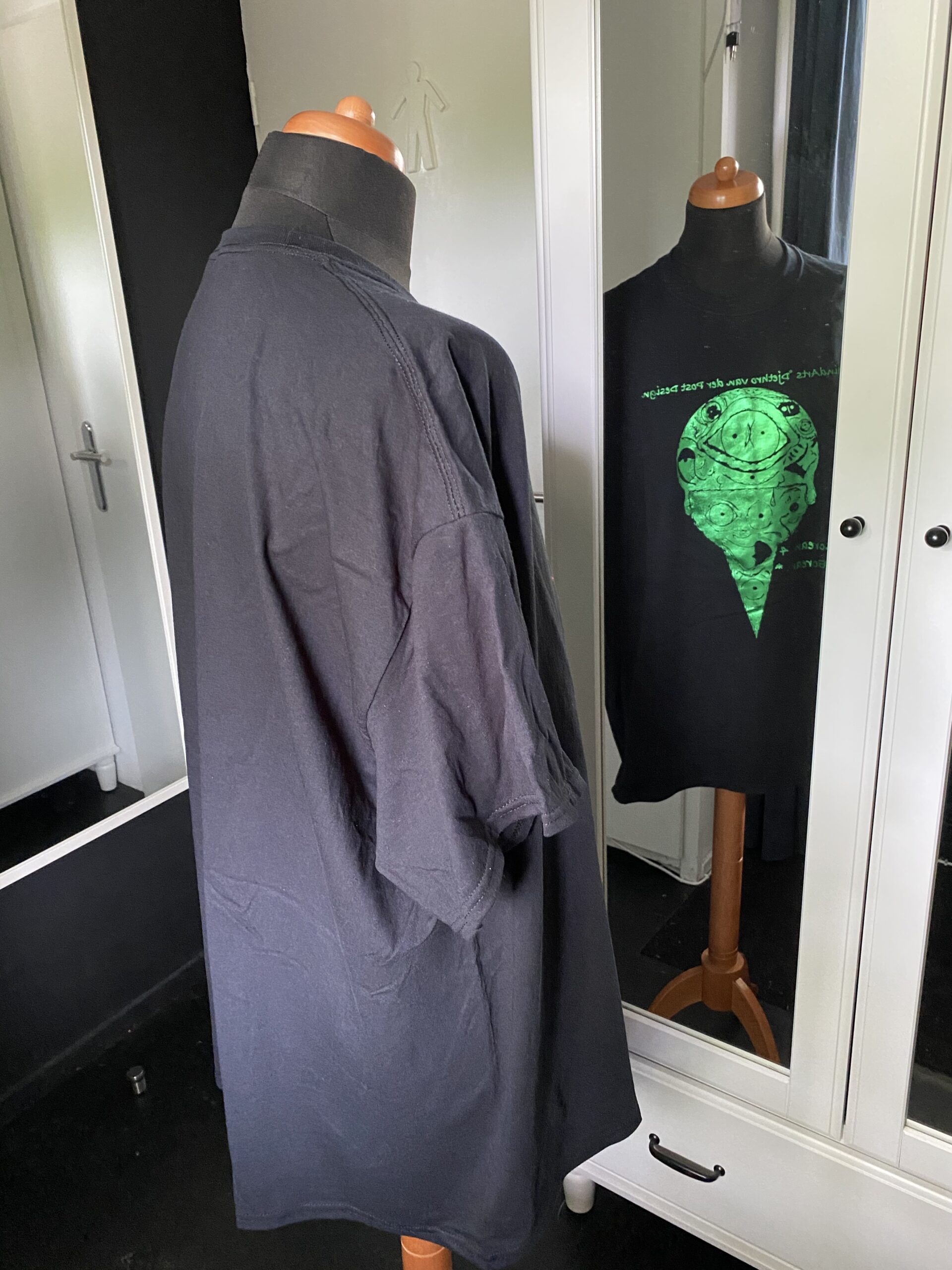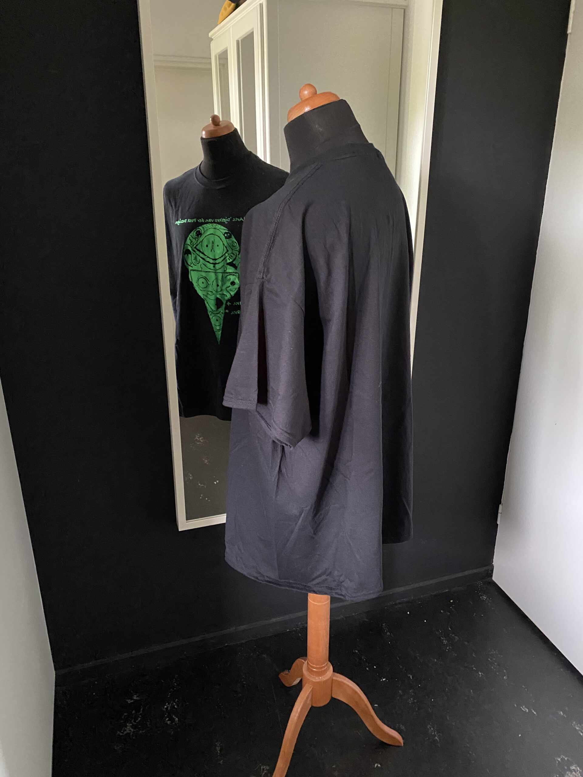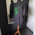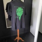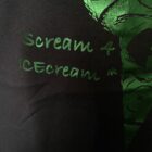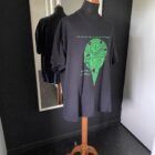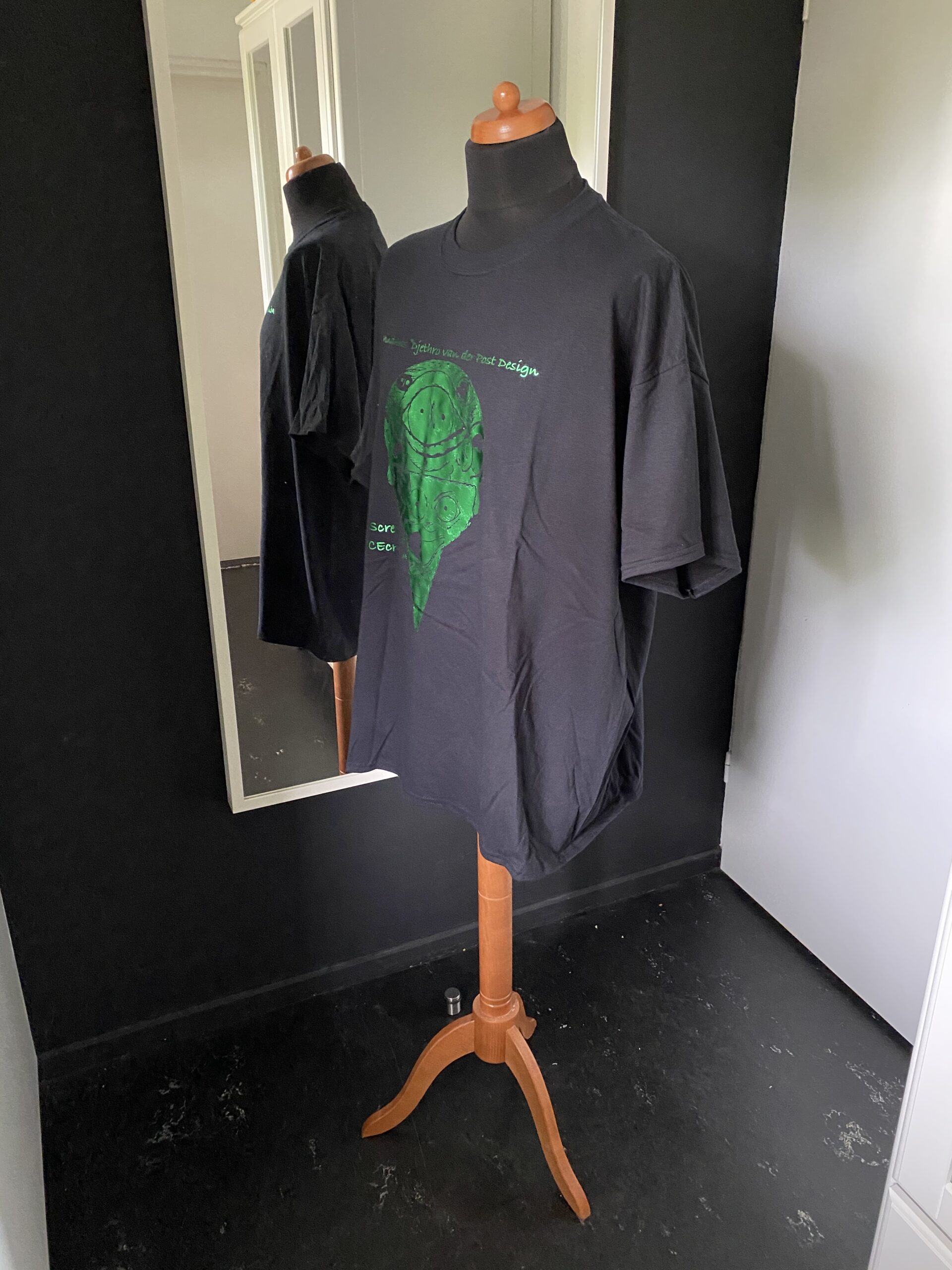 Ice cream shirt to melt away, in the very recognisable style by Djethro van der Post the Dutch artist a lovely icy shirt too melt away. In a surprisingly metallic green colour on a black shirt. You almost begin to salivate looking at this ice cream. And maybe feeling as fresh as ice wearing this shirt. Anyway “ We love ice cream!”
