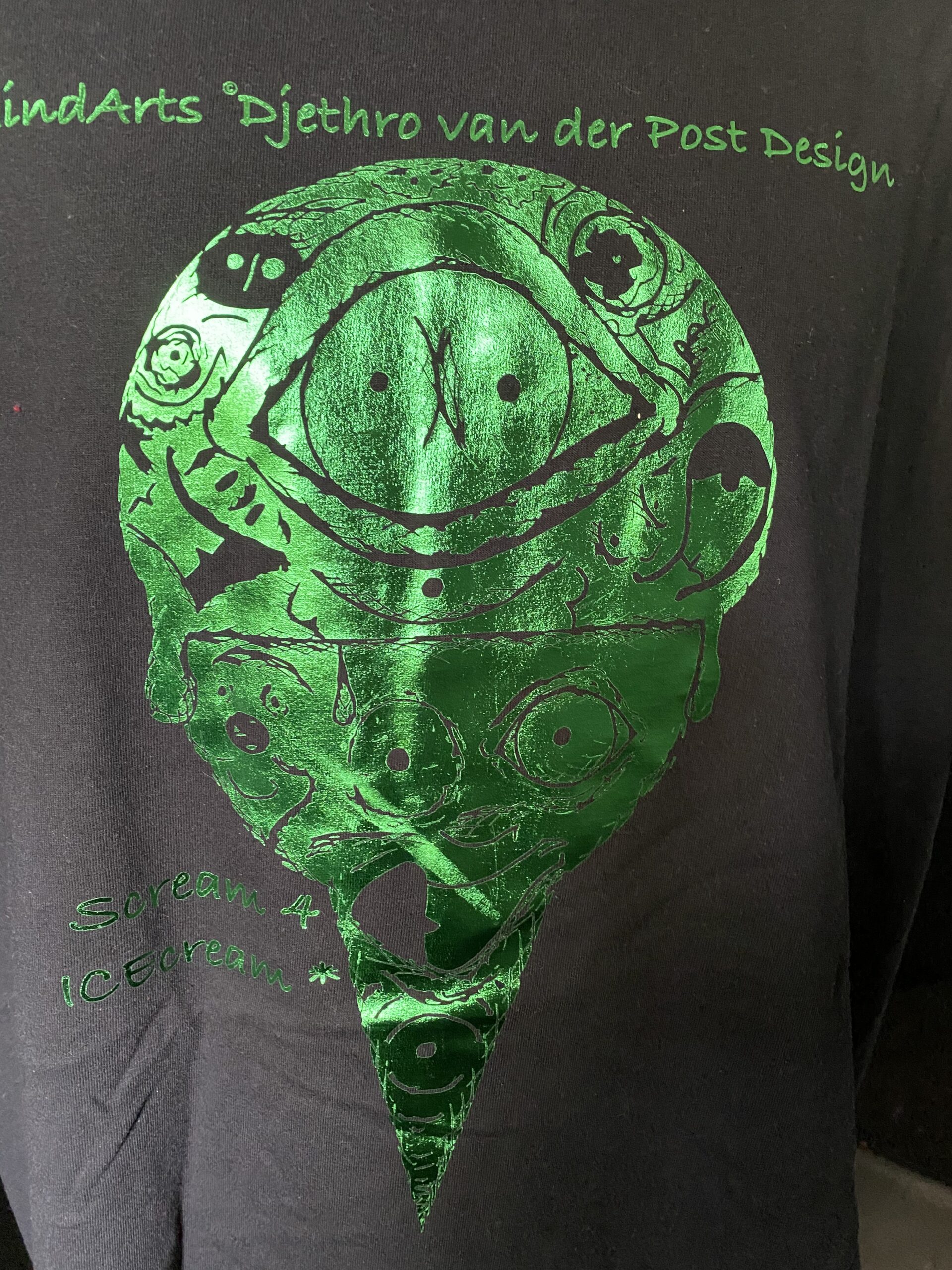 In de zeer herkenbare stijl van de Nederlandse artiest Djethro van der Post een heerlijk ijselijk shirt waar je bij weg smelt. In de verassende kleur metallic groen op een zwart shirt. Je begint te watertanden wanneer je het ijsje ziet. En misschien voel je jezelf zo fris als ijs, als je het shirt draagt. In elk geval “Wij houden van ijsco’s! “