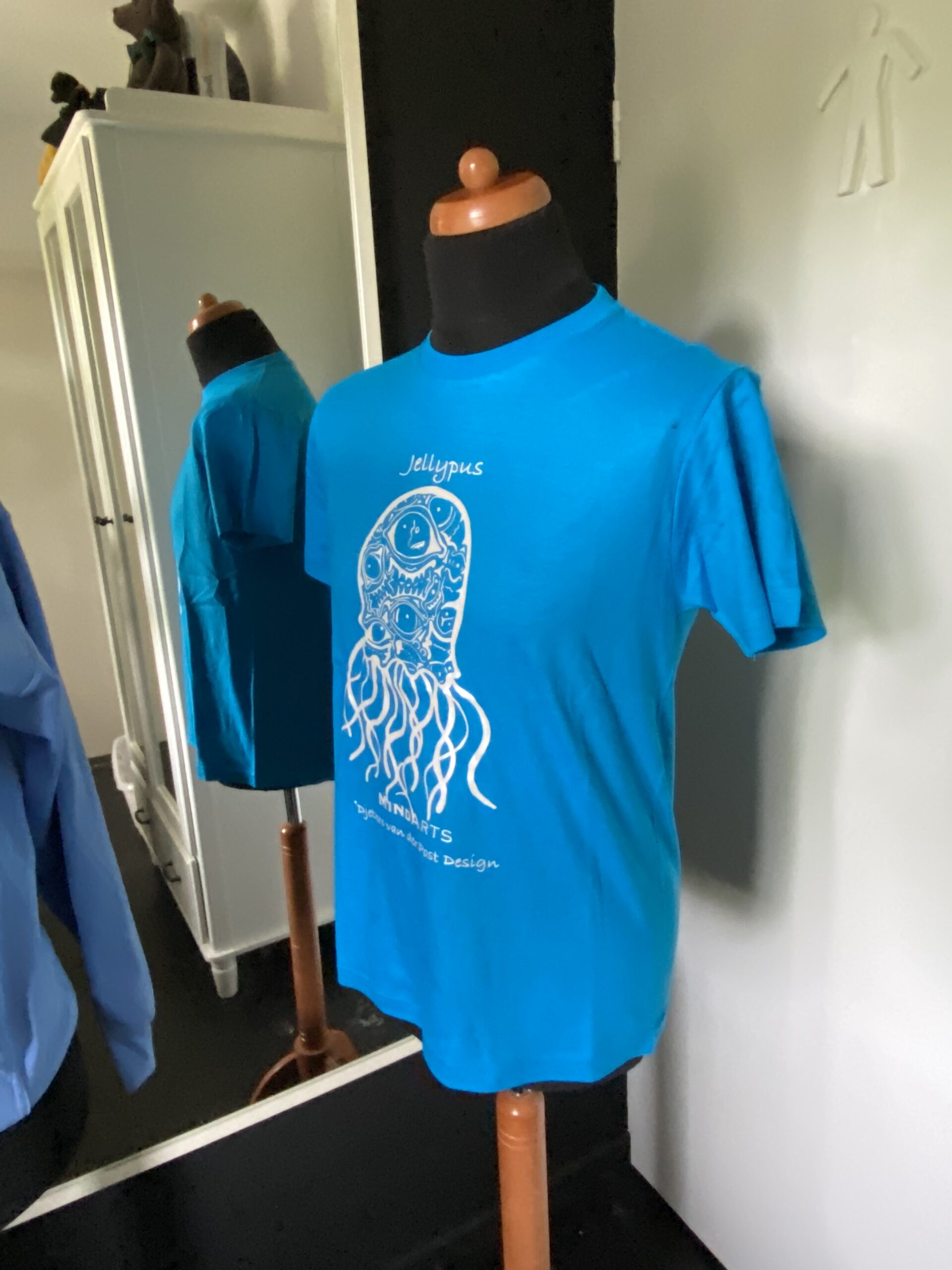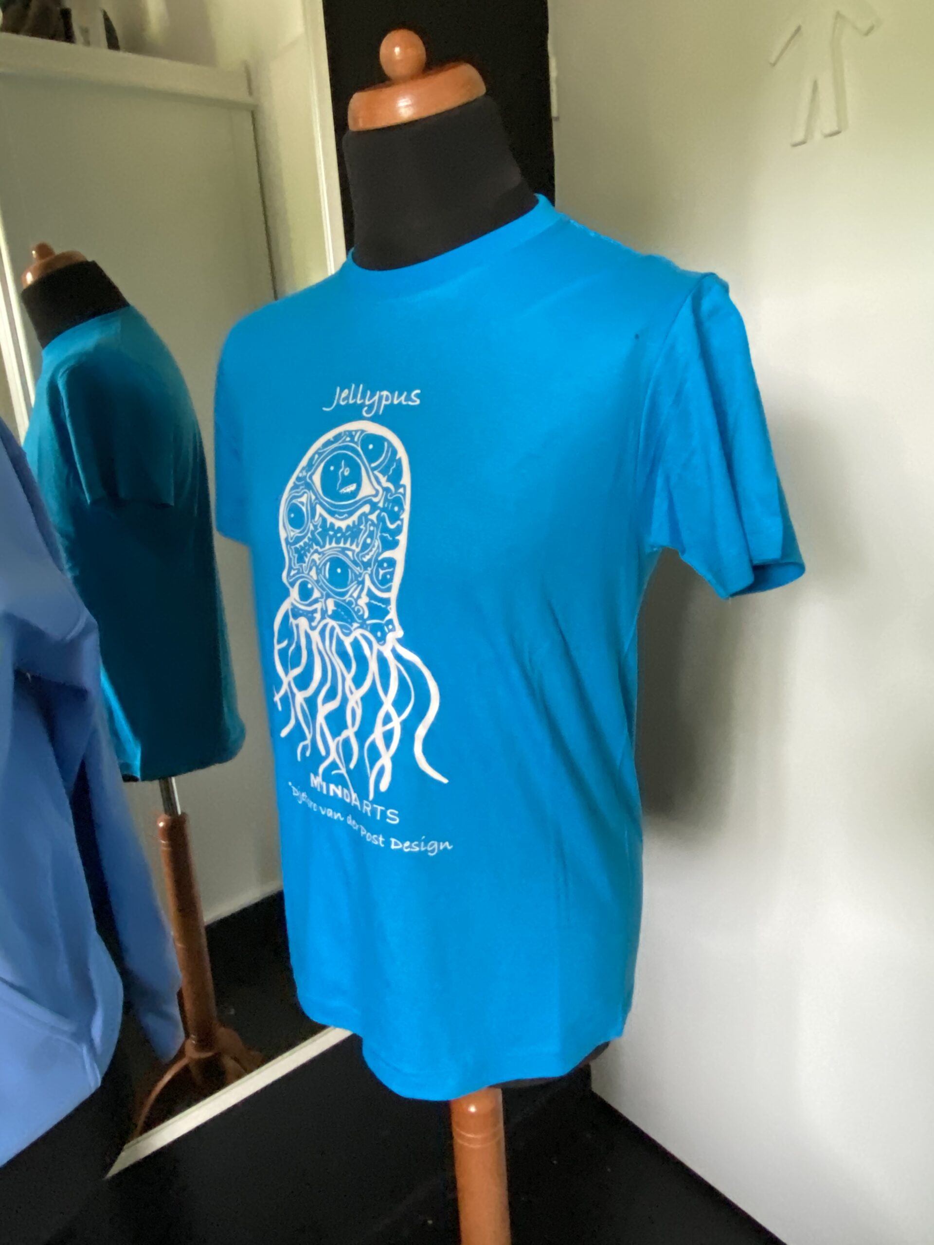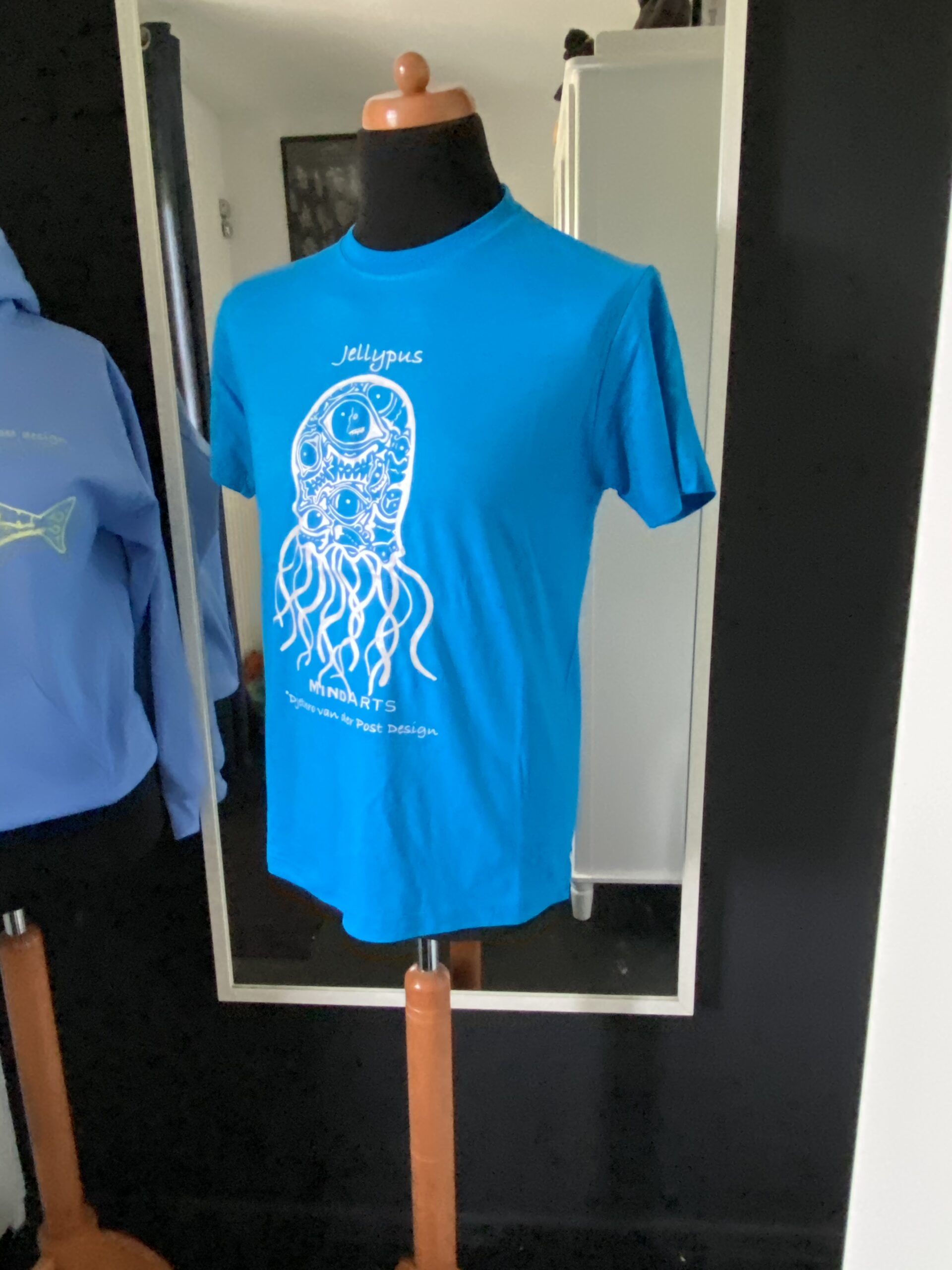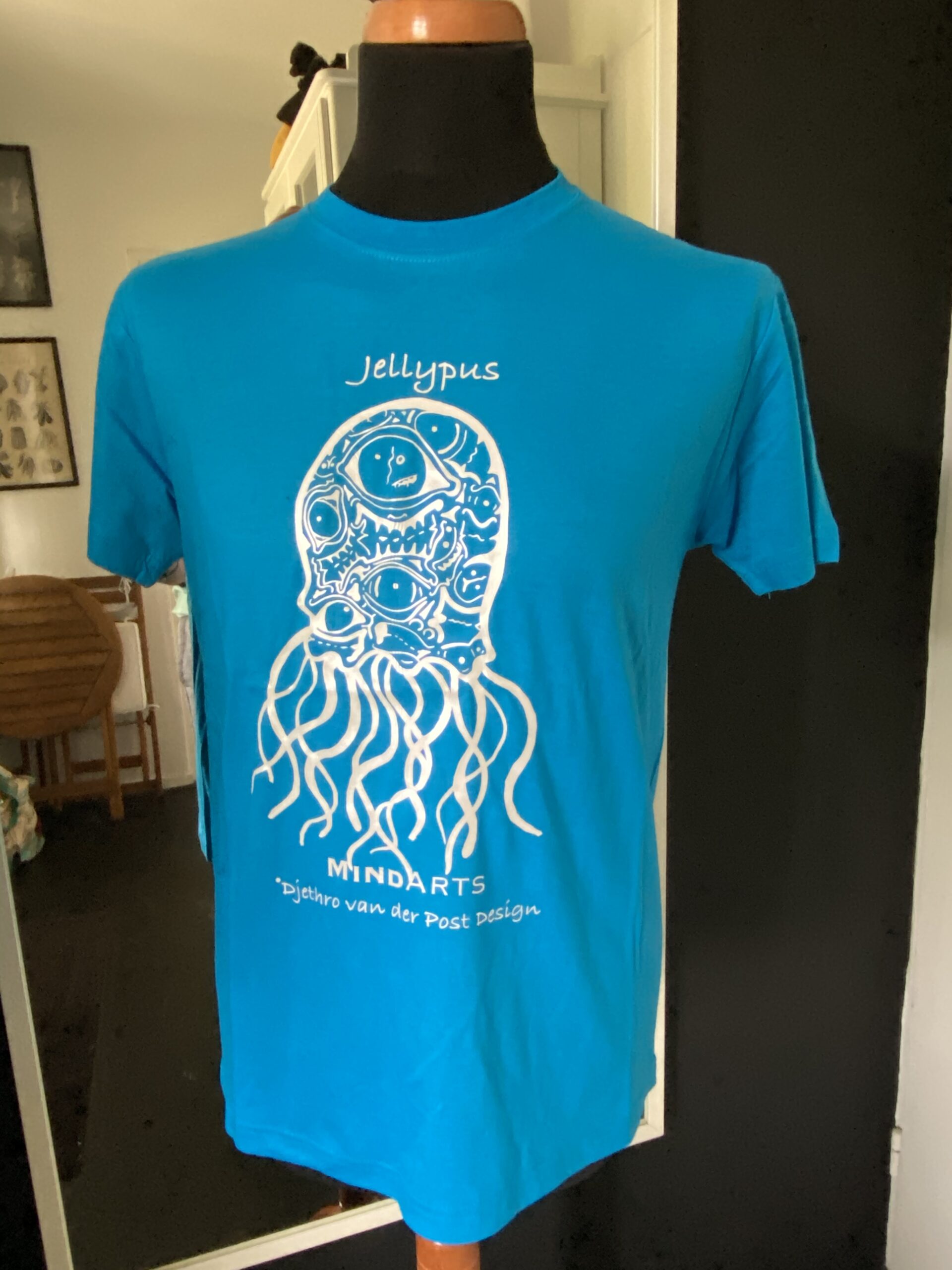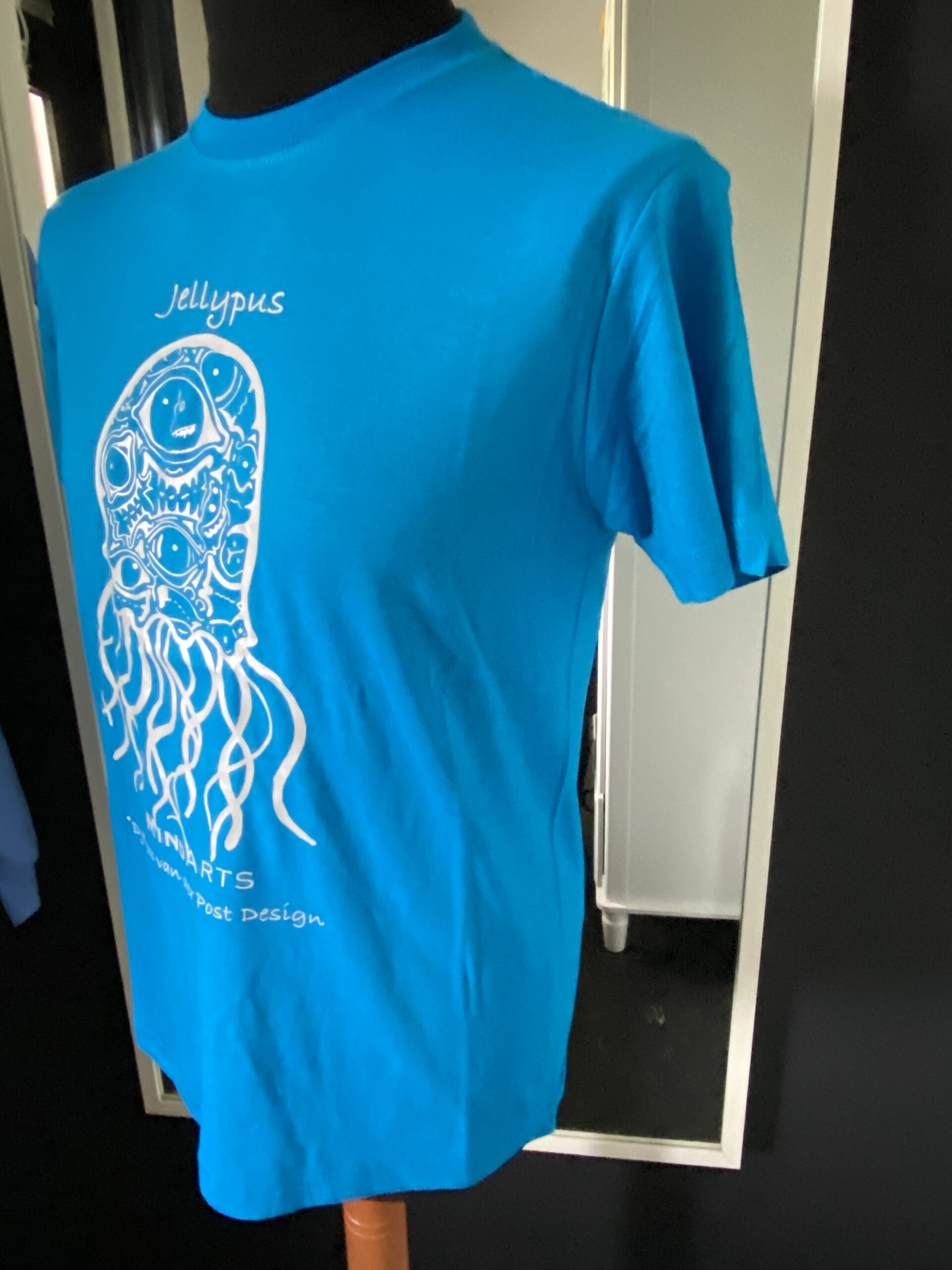 Geïnspireerd door de verhalen van Herman Melville, Jules Verne en door de natuur zelf, creëerde de artiest Djethro van der Post deze Jellypus /kwapus. De Jellypus is een super pearl print en het t-shirt is aqua blauw zoals het water is. Het is een metaal print om een treffende gelijkenis met de glanzende Jellypus uit te beelden in de eigen stijl van Djethro.