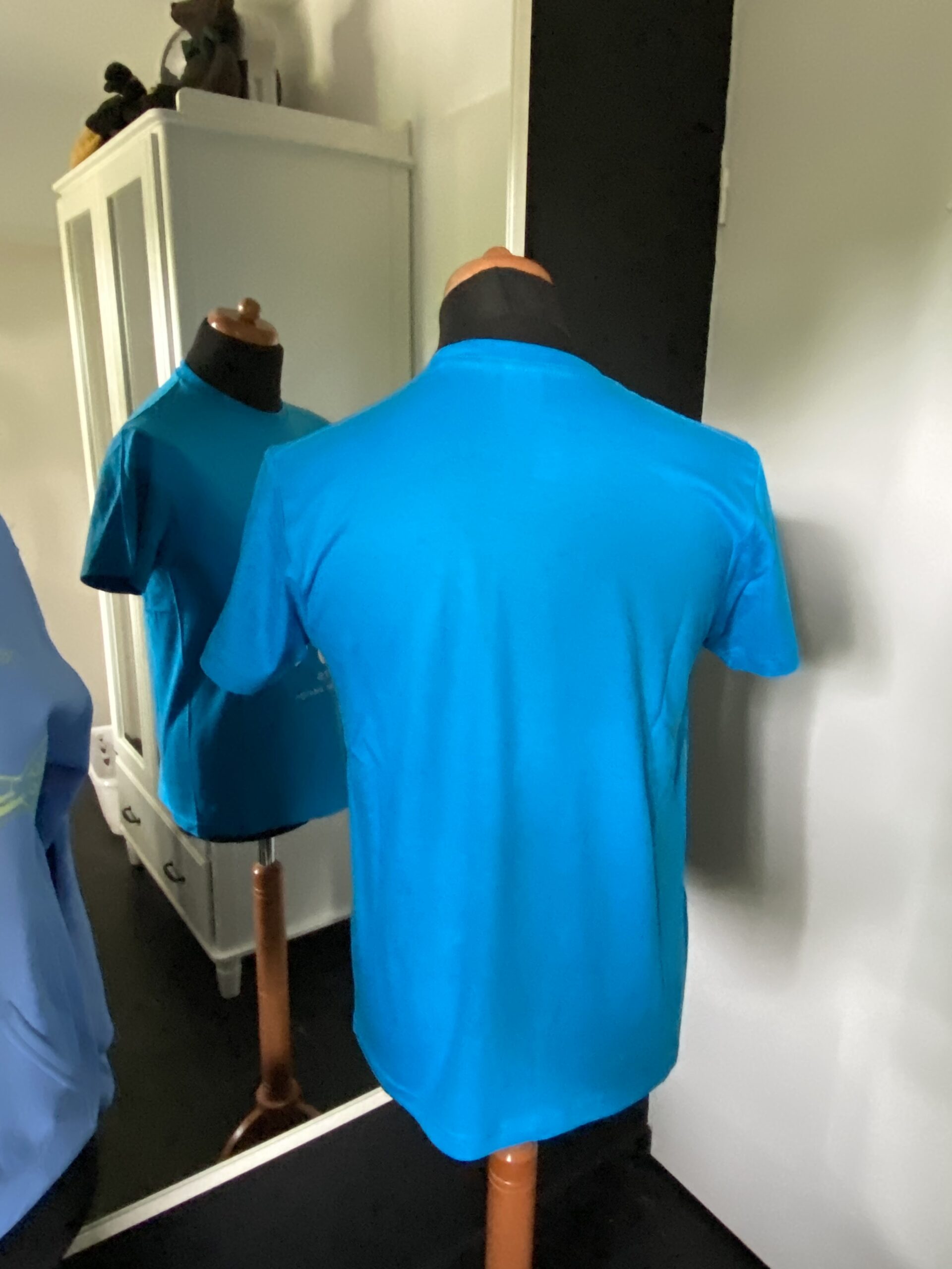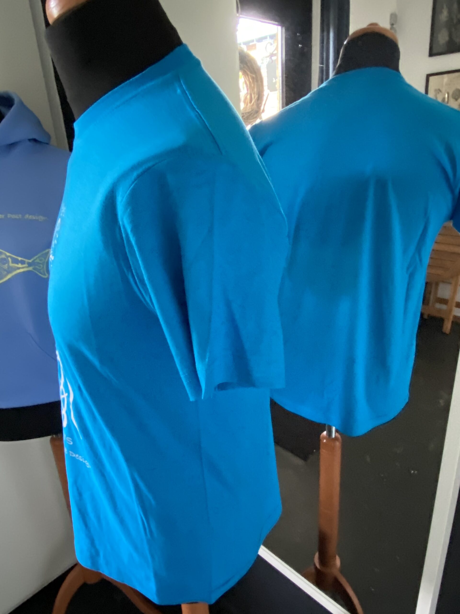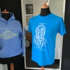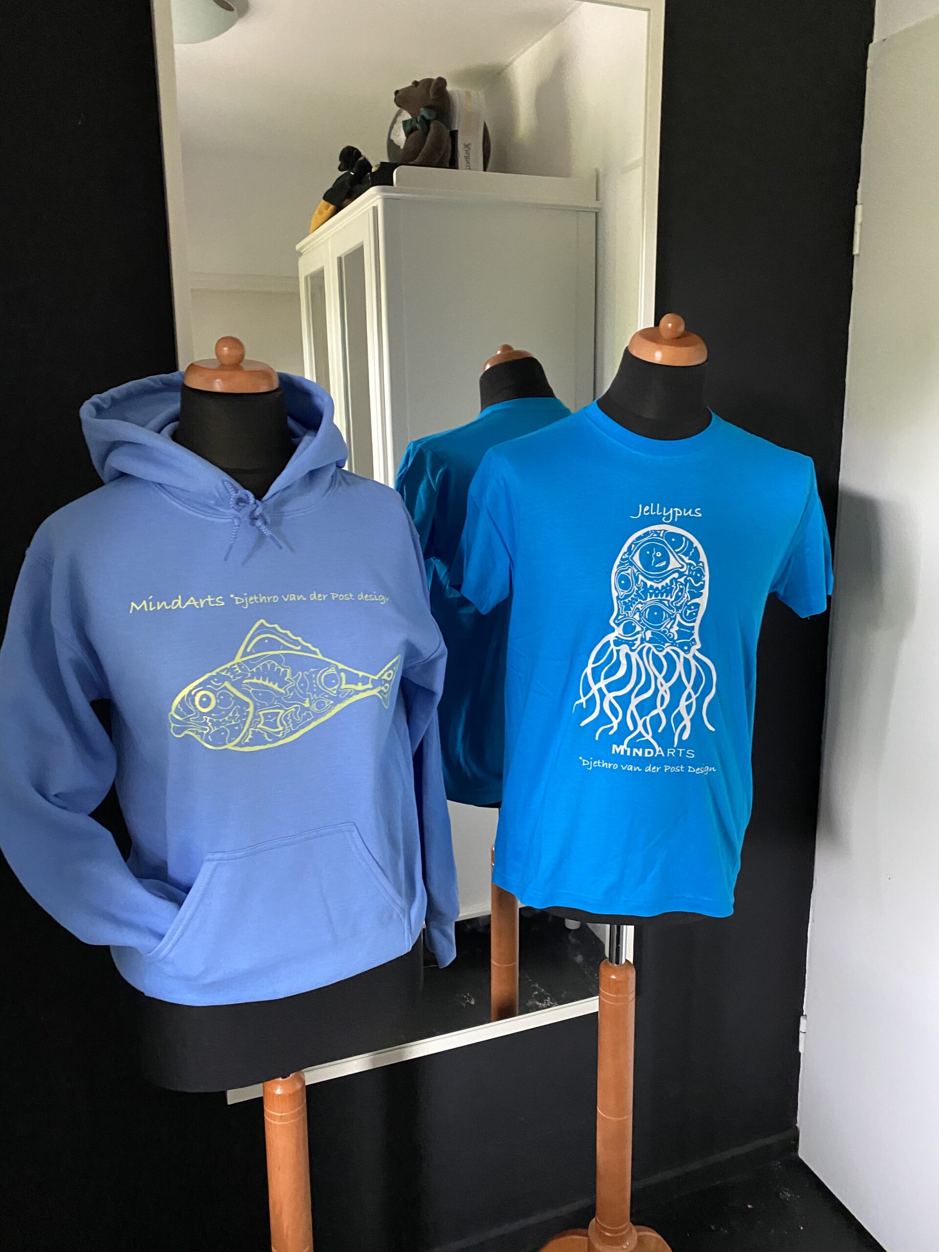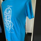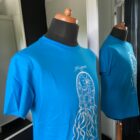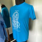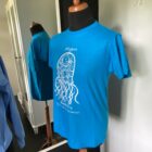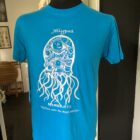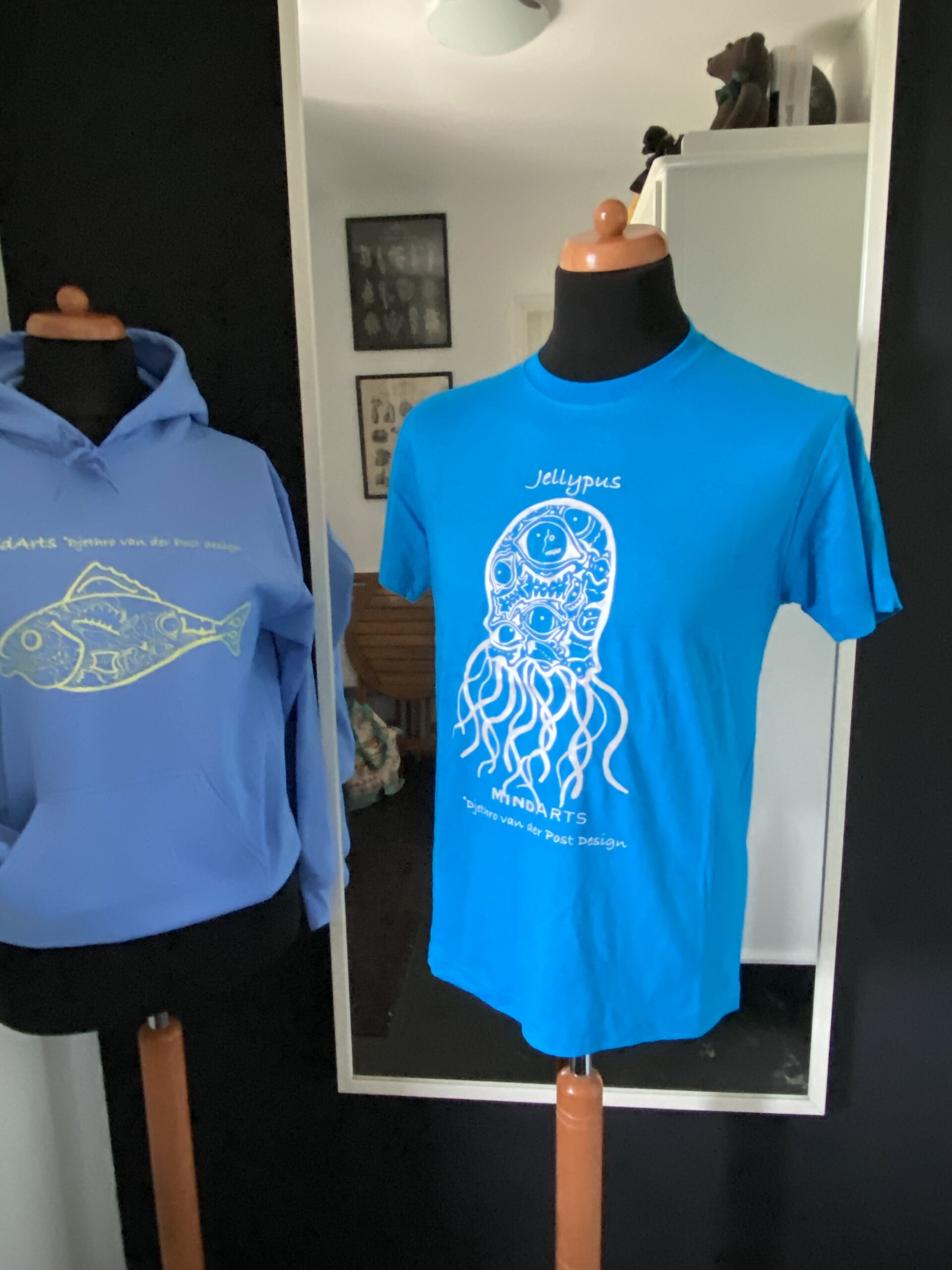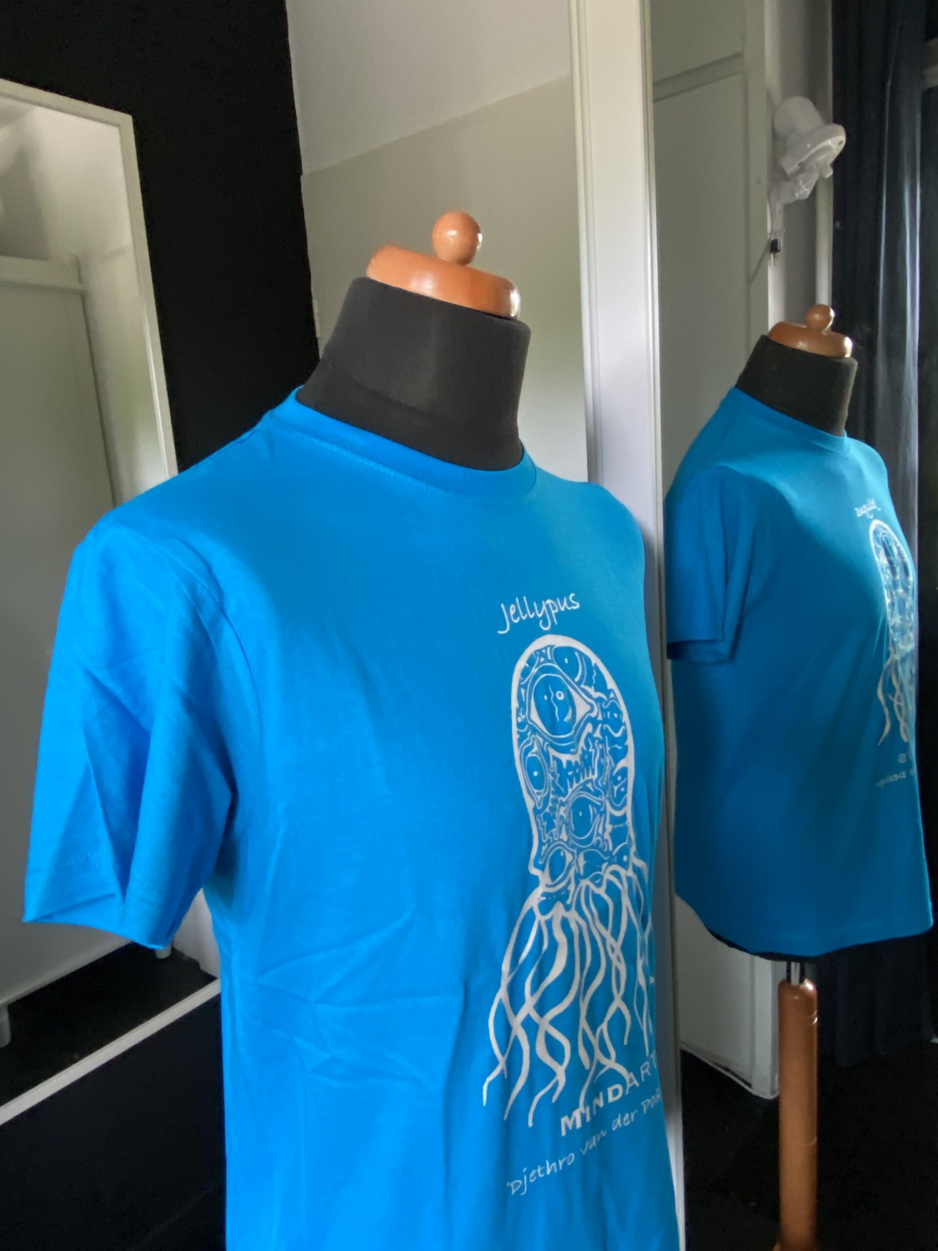 Geïnspireerd door de verhalen van Herman Melville, Jules Verne en door de natuur zelf, creëerde de artiest Djethro van der Post deze Jellypus /kwapus. De Jellypus is een super pearl print en het t-shirt is aqua blauw zoals het water is. Het is een metaal print om een treffende gelijkenis met de glanzende Jellypus uit te beelden in de eigen stijl van Djethro.