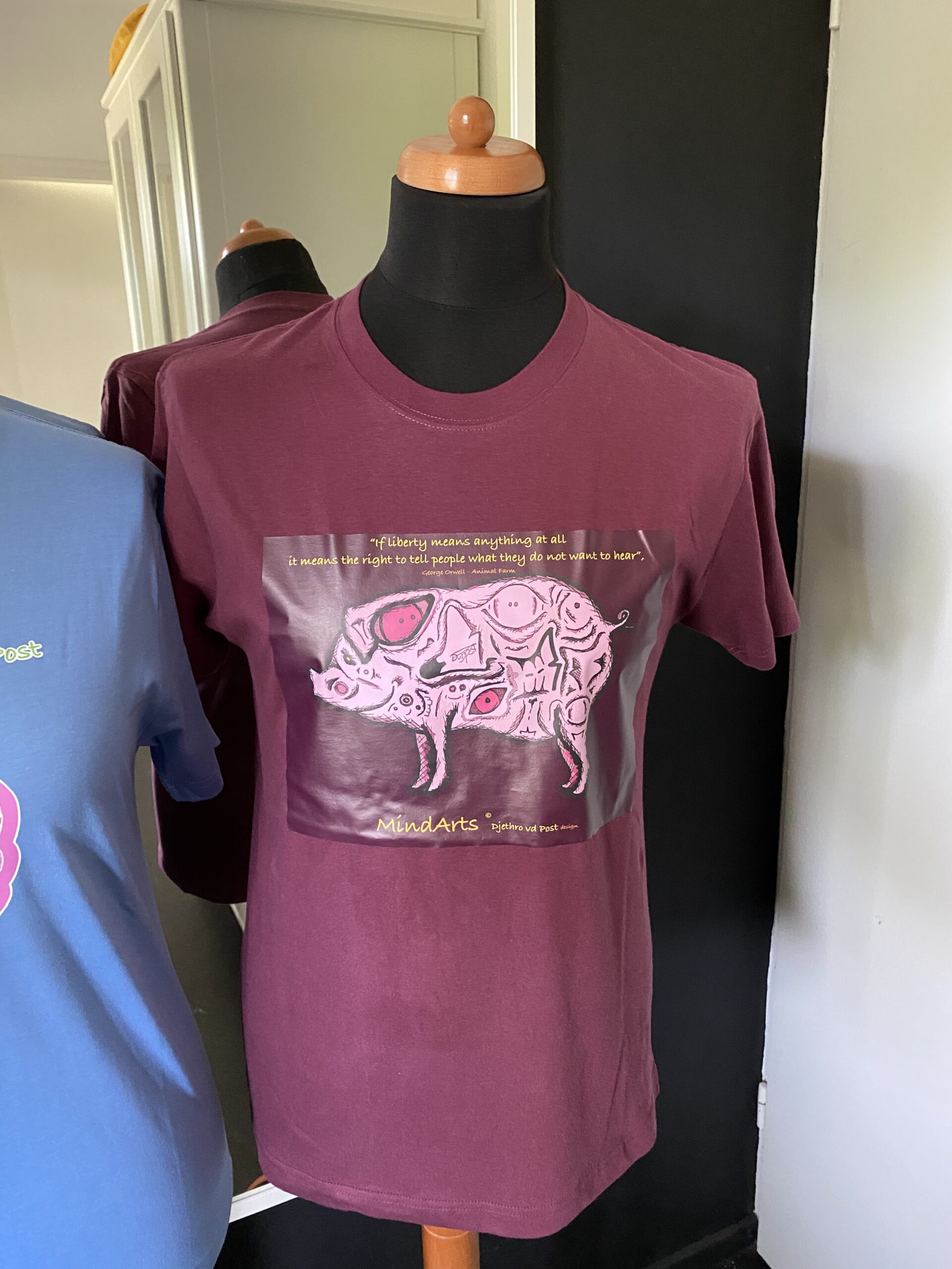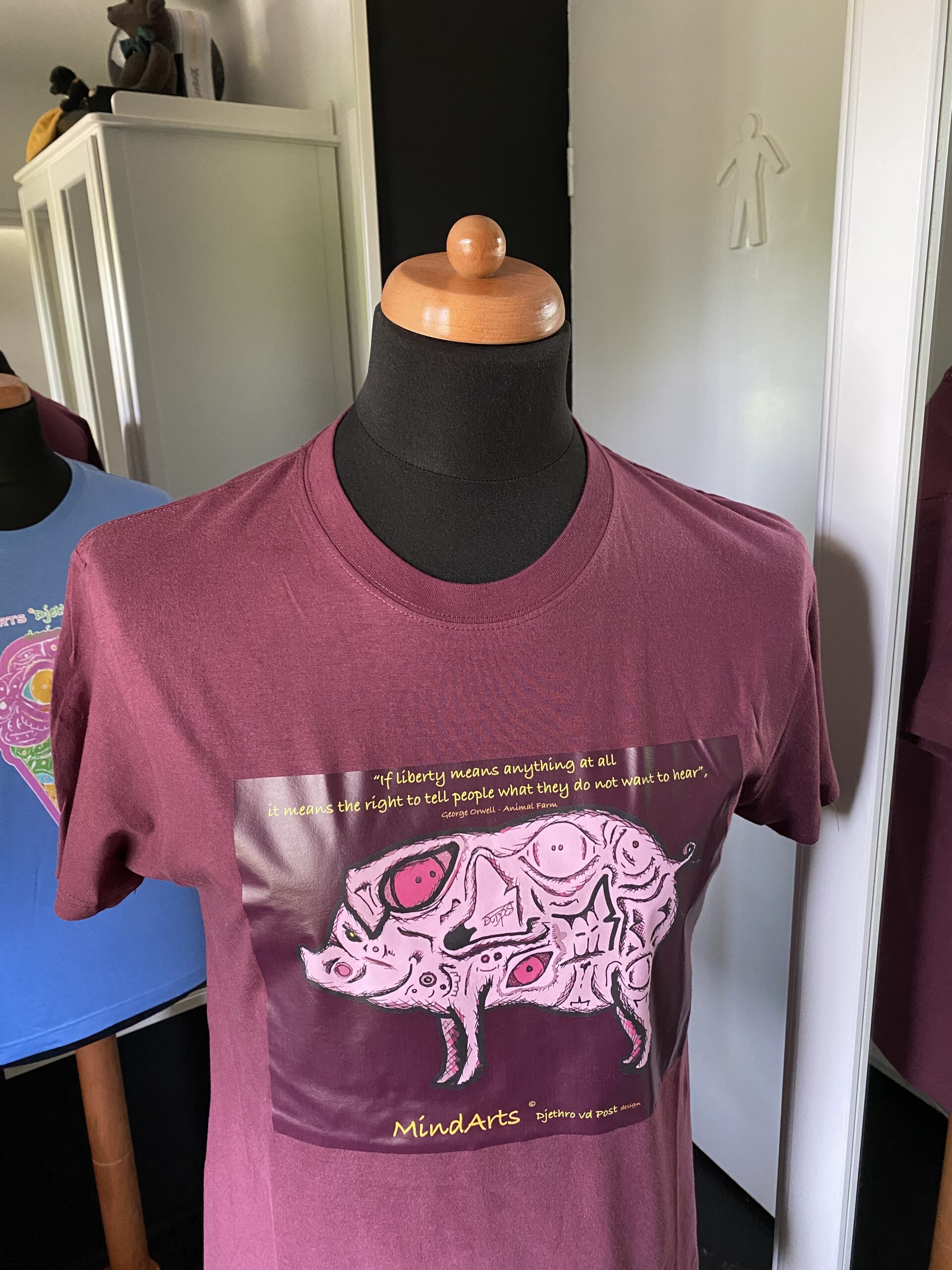In the very recognisable style by Djethro van der Post the Dutch artist a cool and topical shirt at which Orwell’s quotes appear to be of all times. He got inspired by the book “ Animal Farm” by George Orwell. And wanted to capture the atmosphere of the book through the quote. This book is a beacon of Freedom. And how to protect this greater goods together and preserve it.