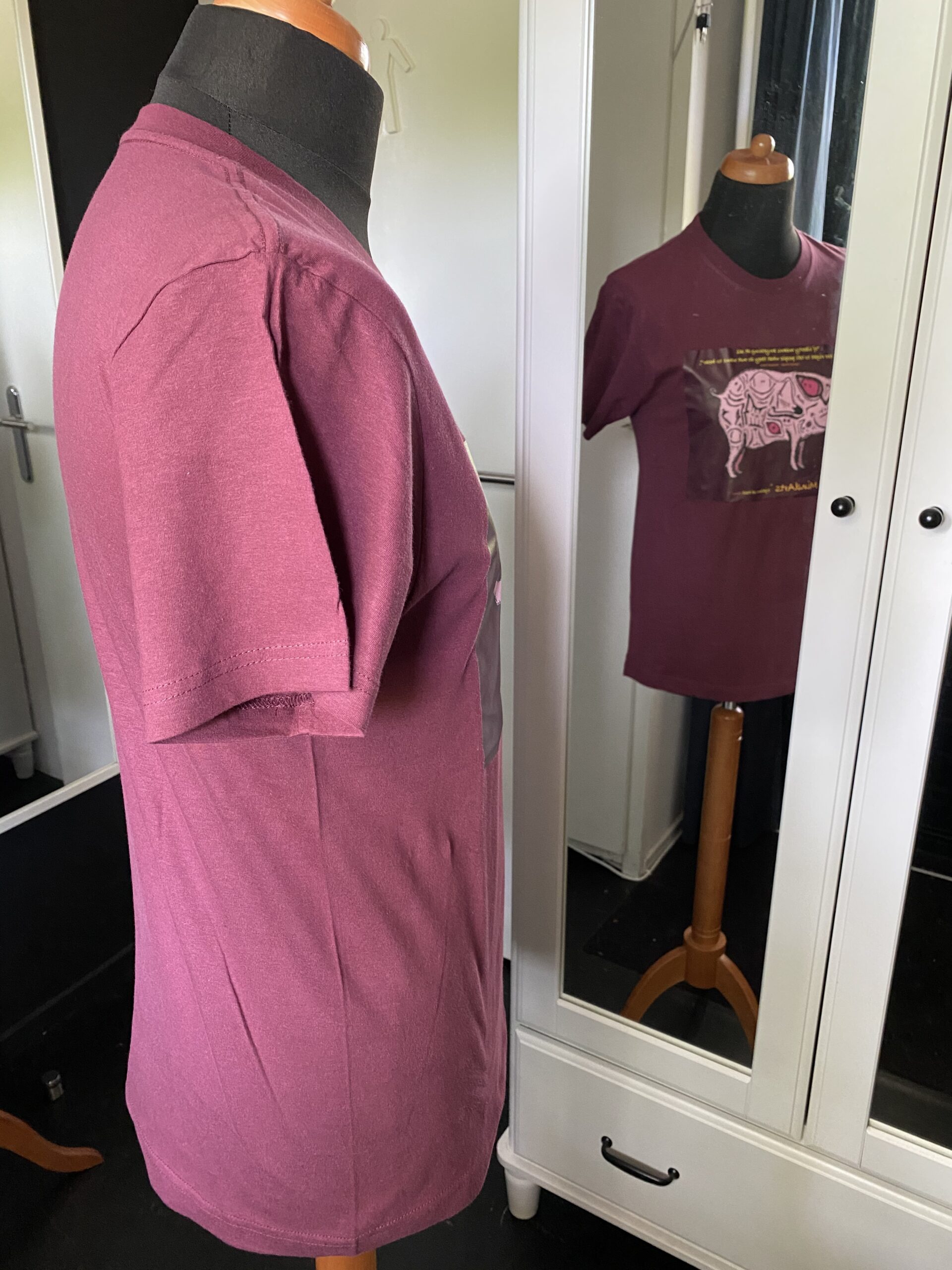 This short sleeve shirt is made of 100% Cotton and feels very soft. It’s printed with a Orwell quote from the book ,Animal Farm, and underneath a Pig in a recognisable Djethro van der Post design. Attainable in size M,L,XL
