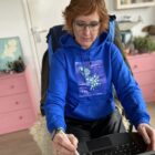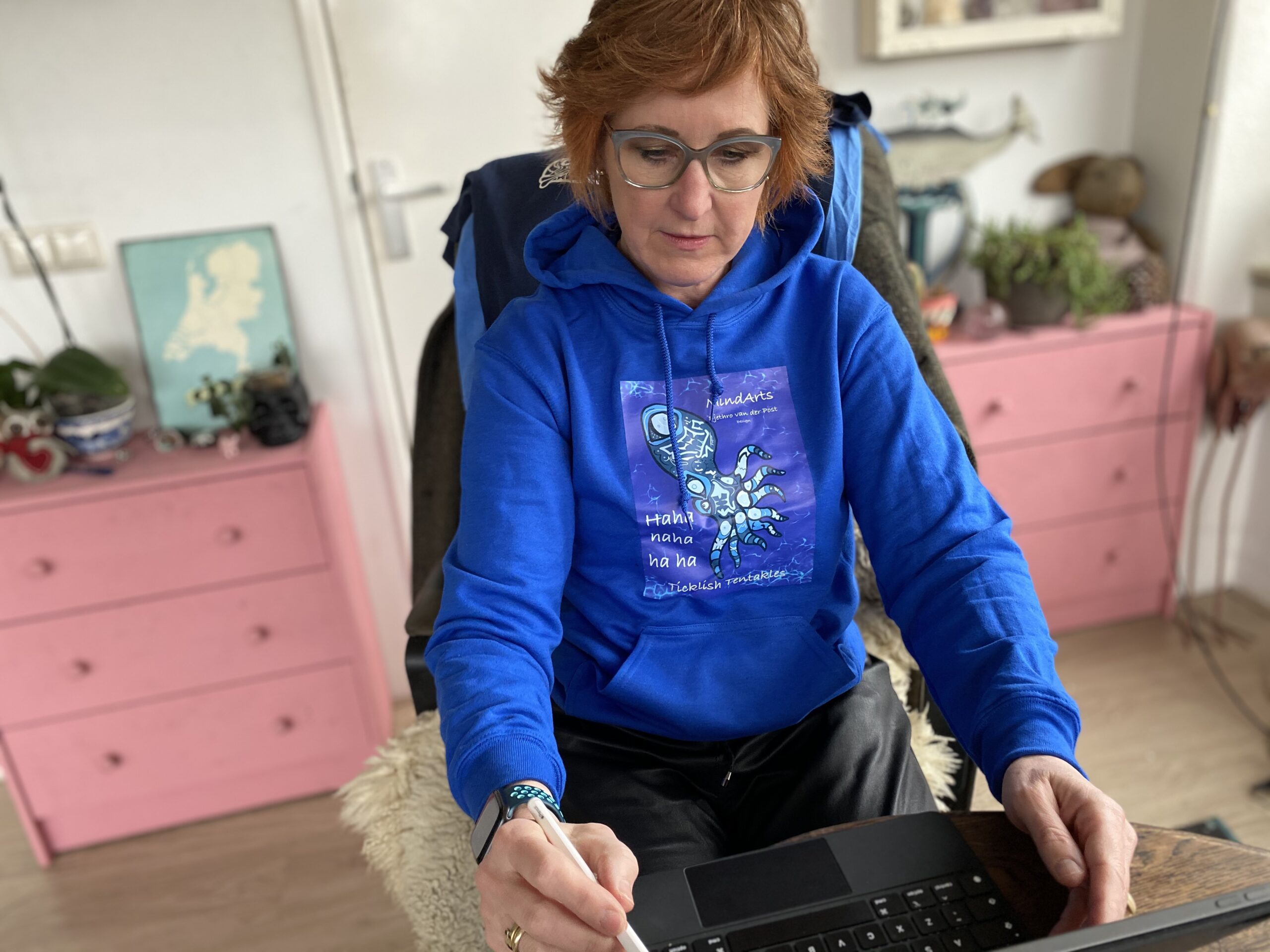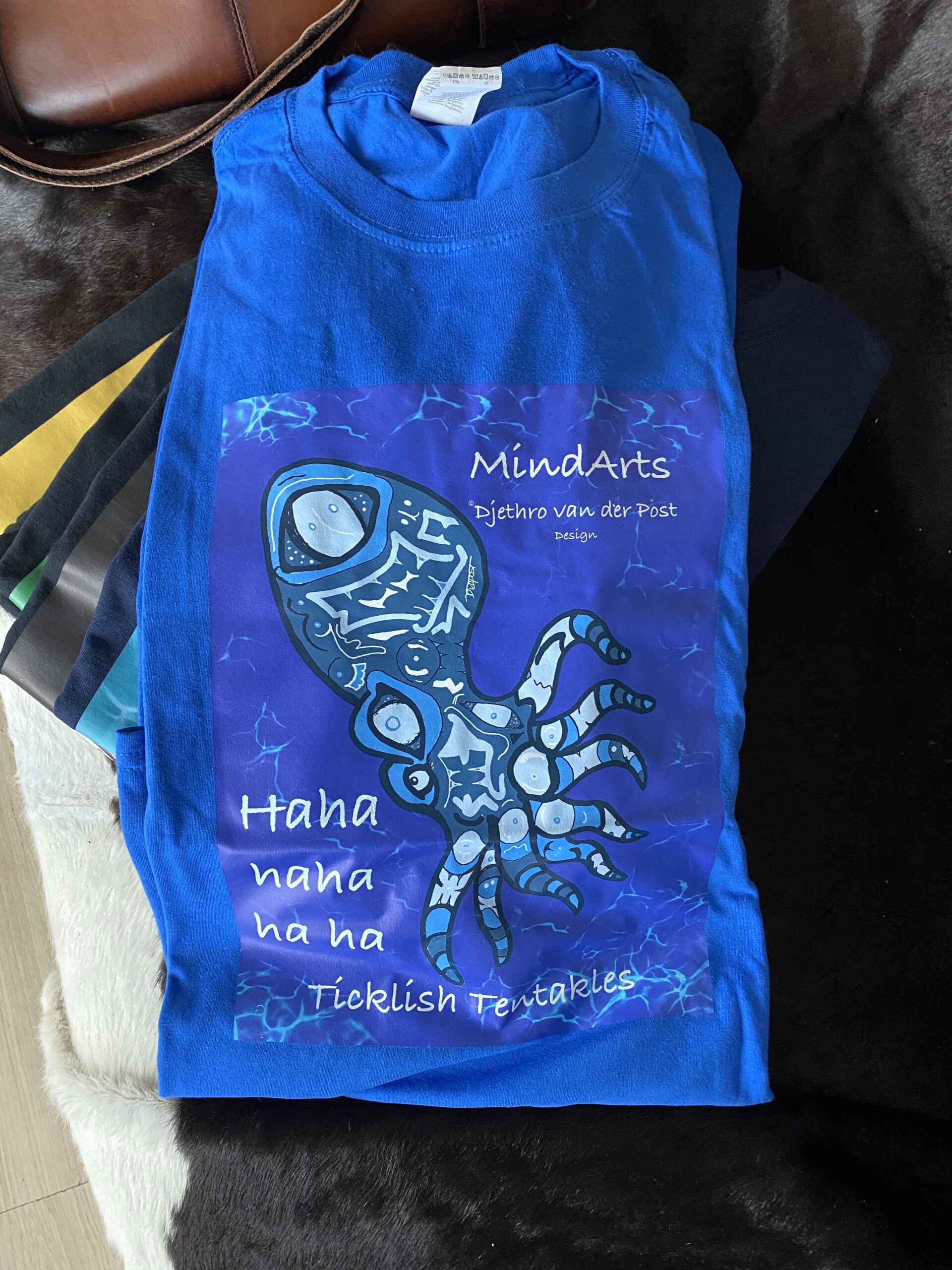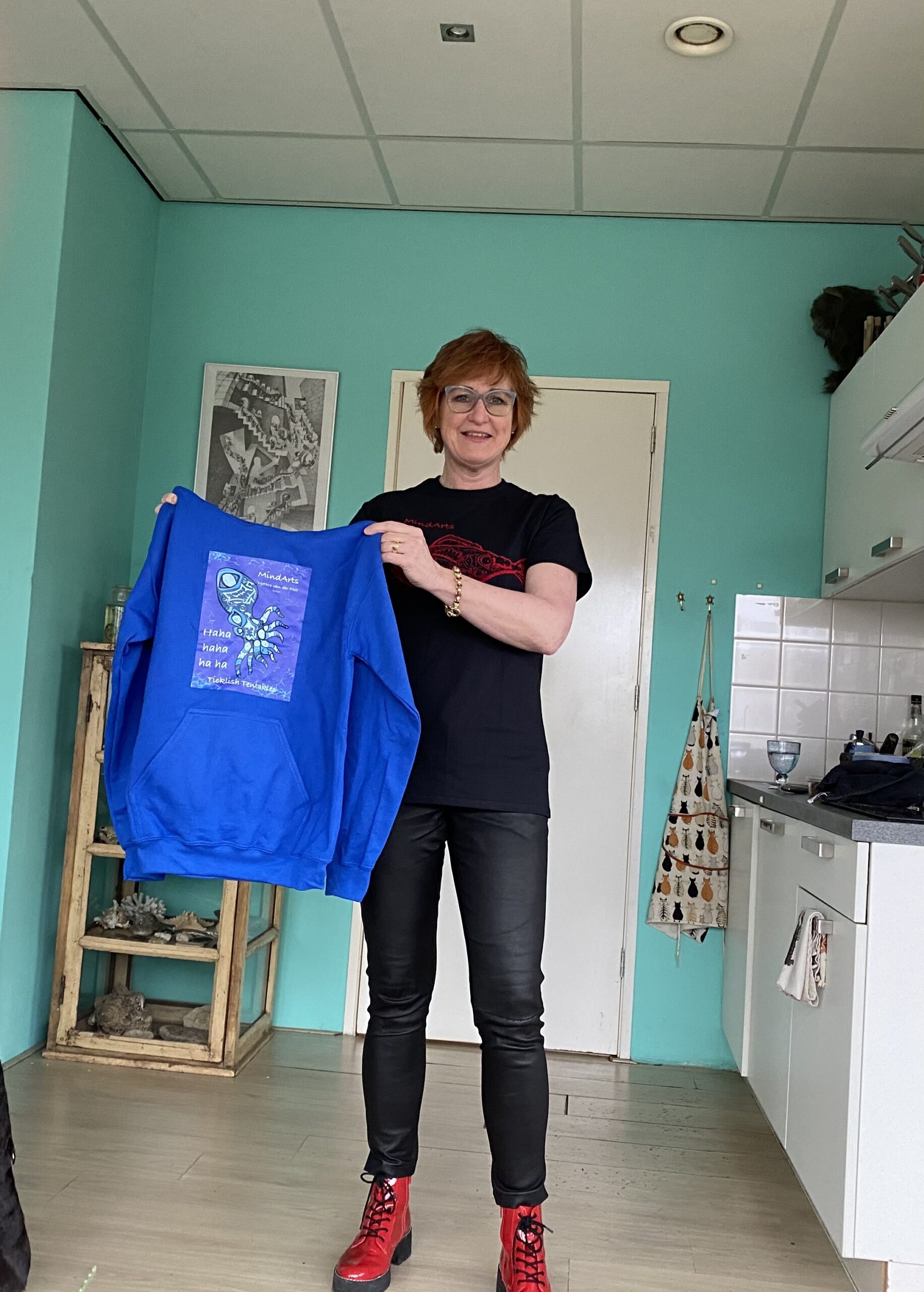 Helder diep blauw, heavy blend katoenen shirt met capuchon. Een echte Djethro van der Post design. Diep zee life op zijn best, fantasievol. Geïnspireerd door Herman Melvilles boek “Moby Dick”