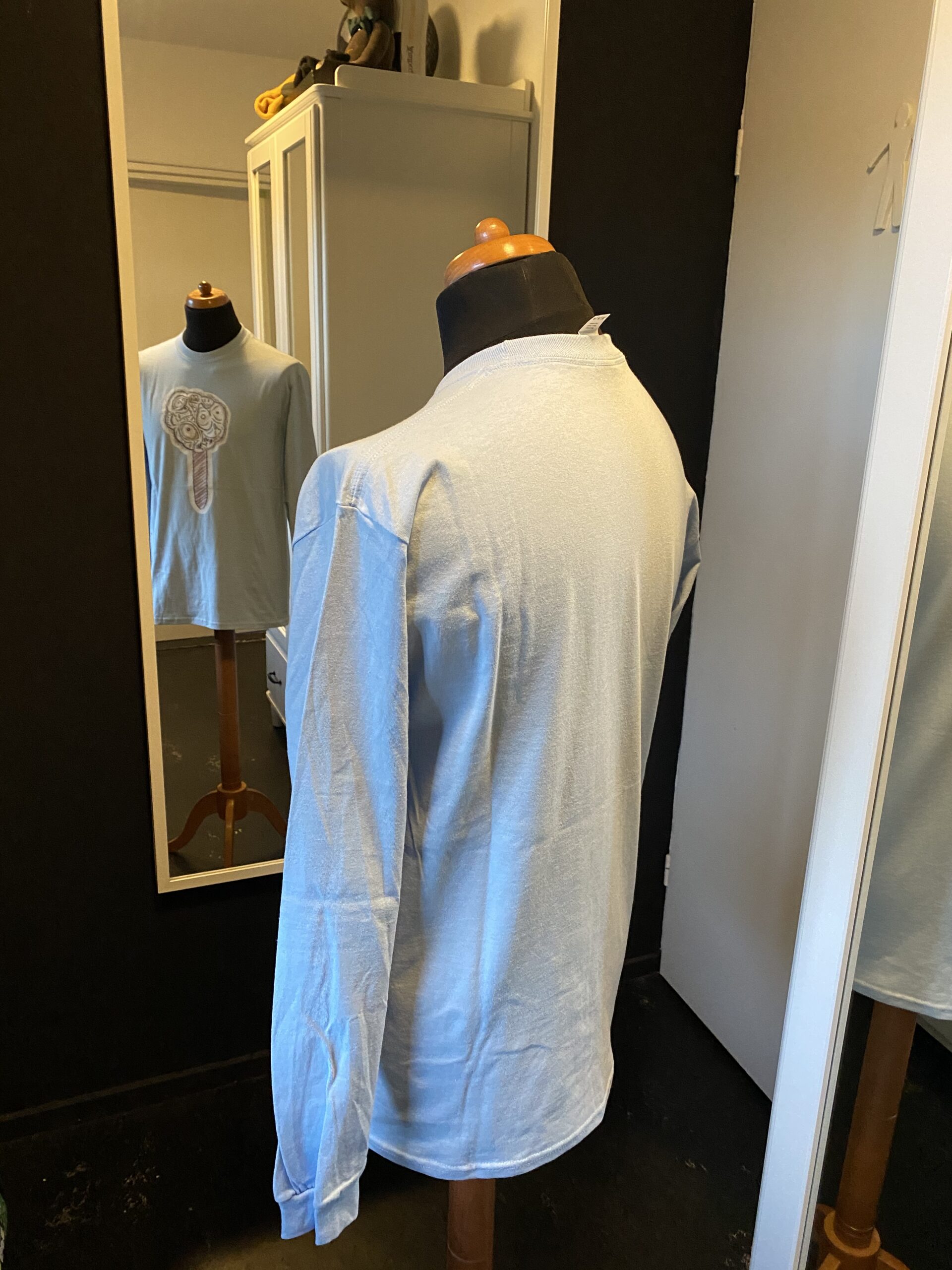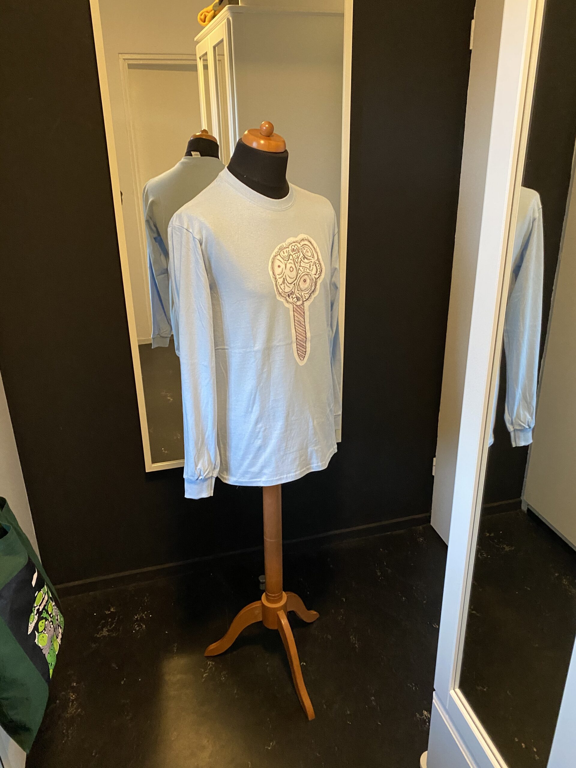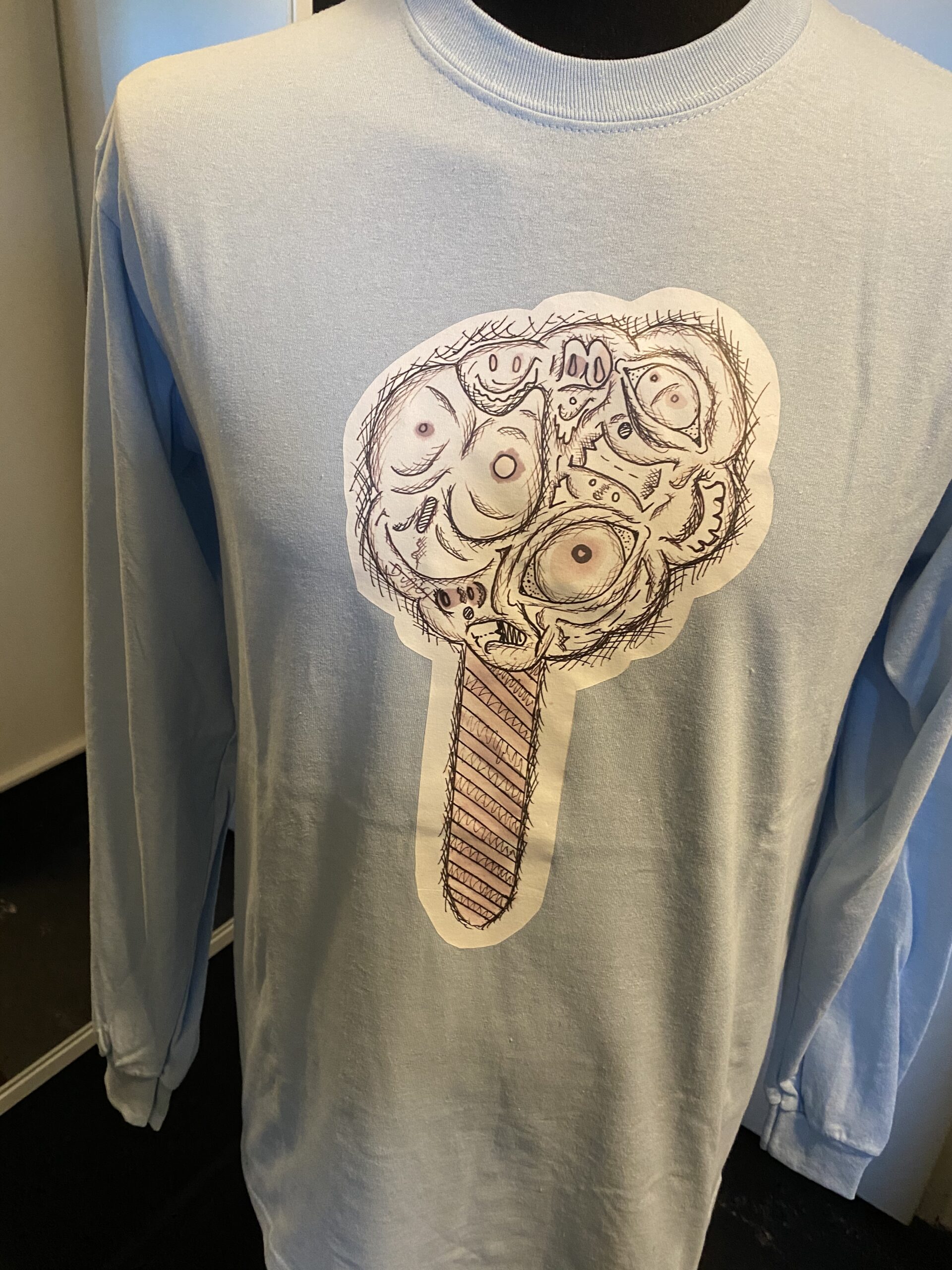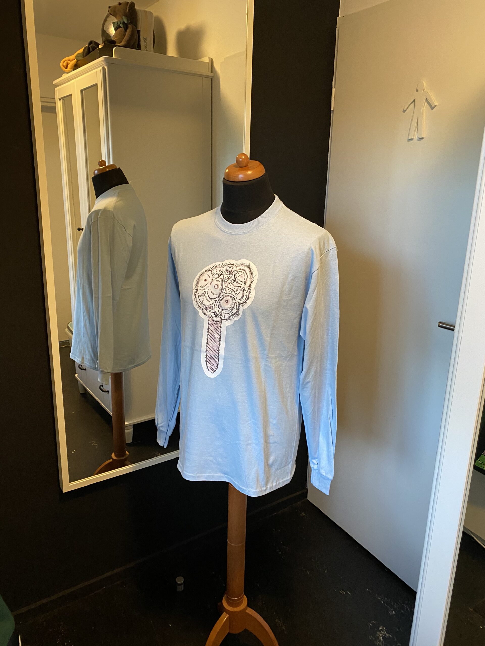 A light blue shirt with an super duper relaxed Candy Cotton print on the front. The Dutch artist Djethro van der Post made the design.