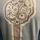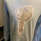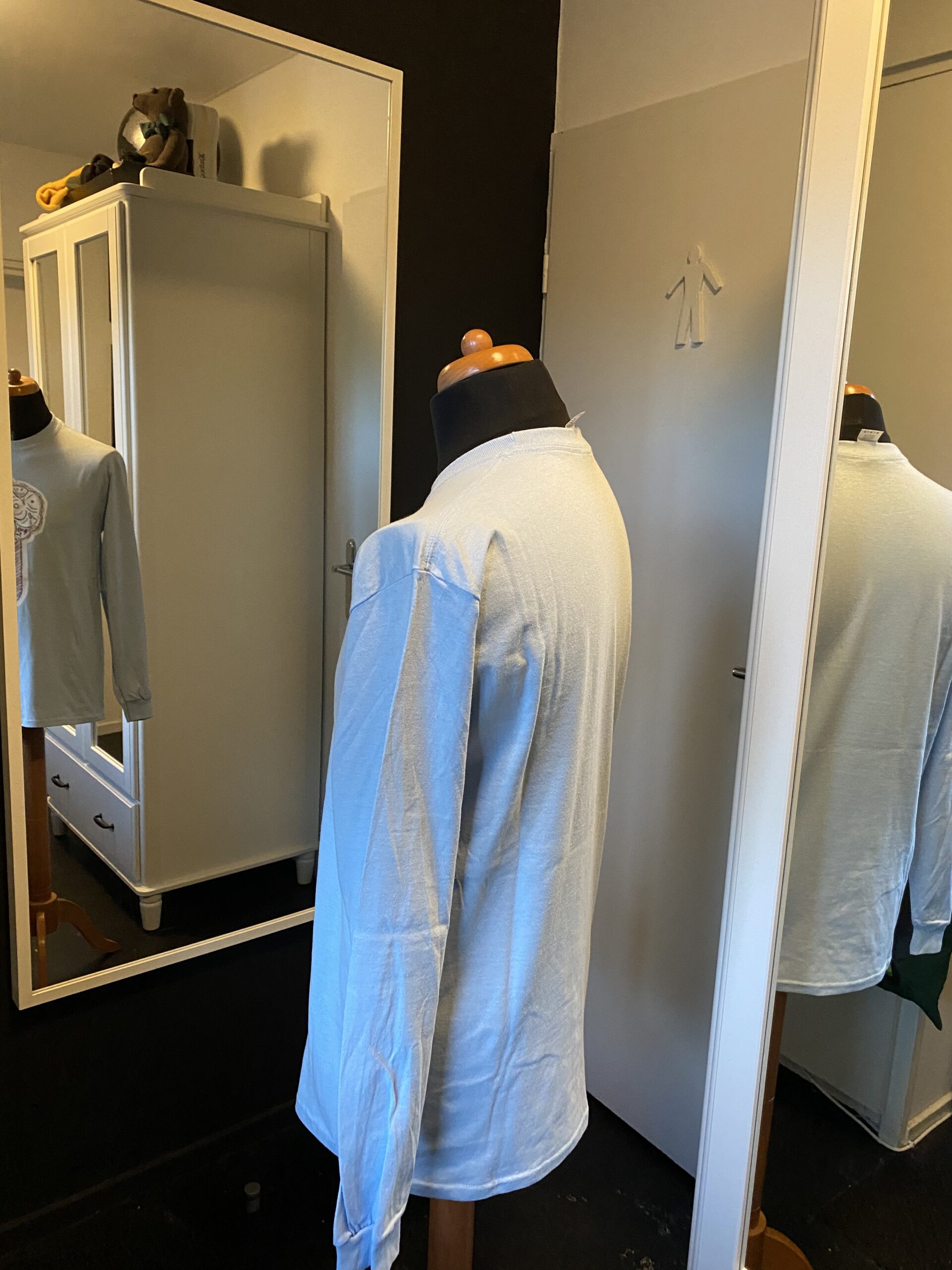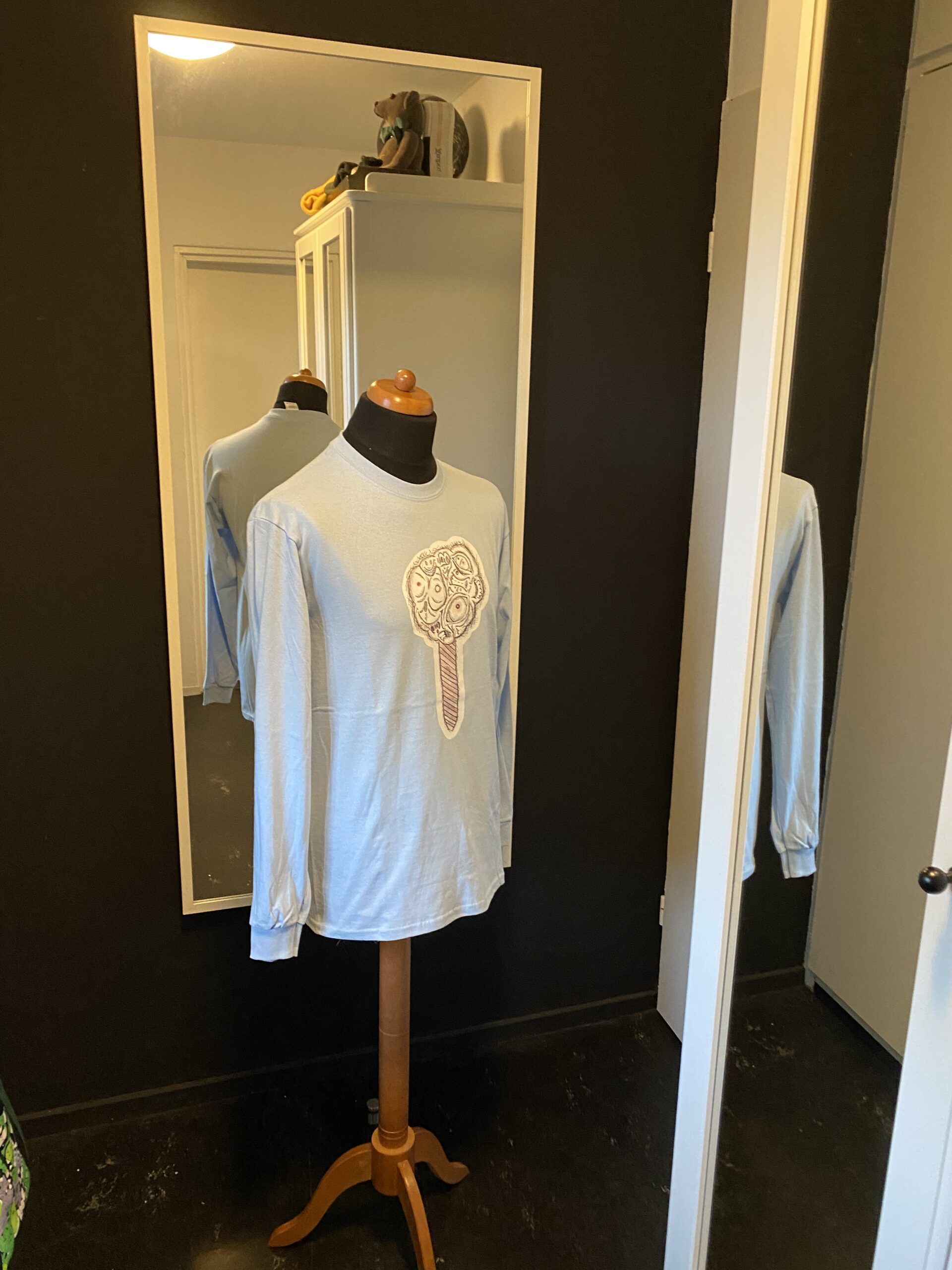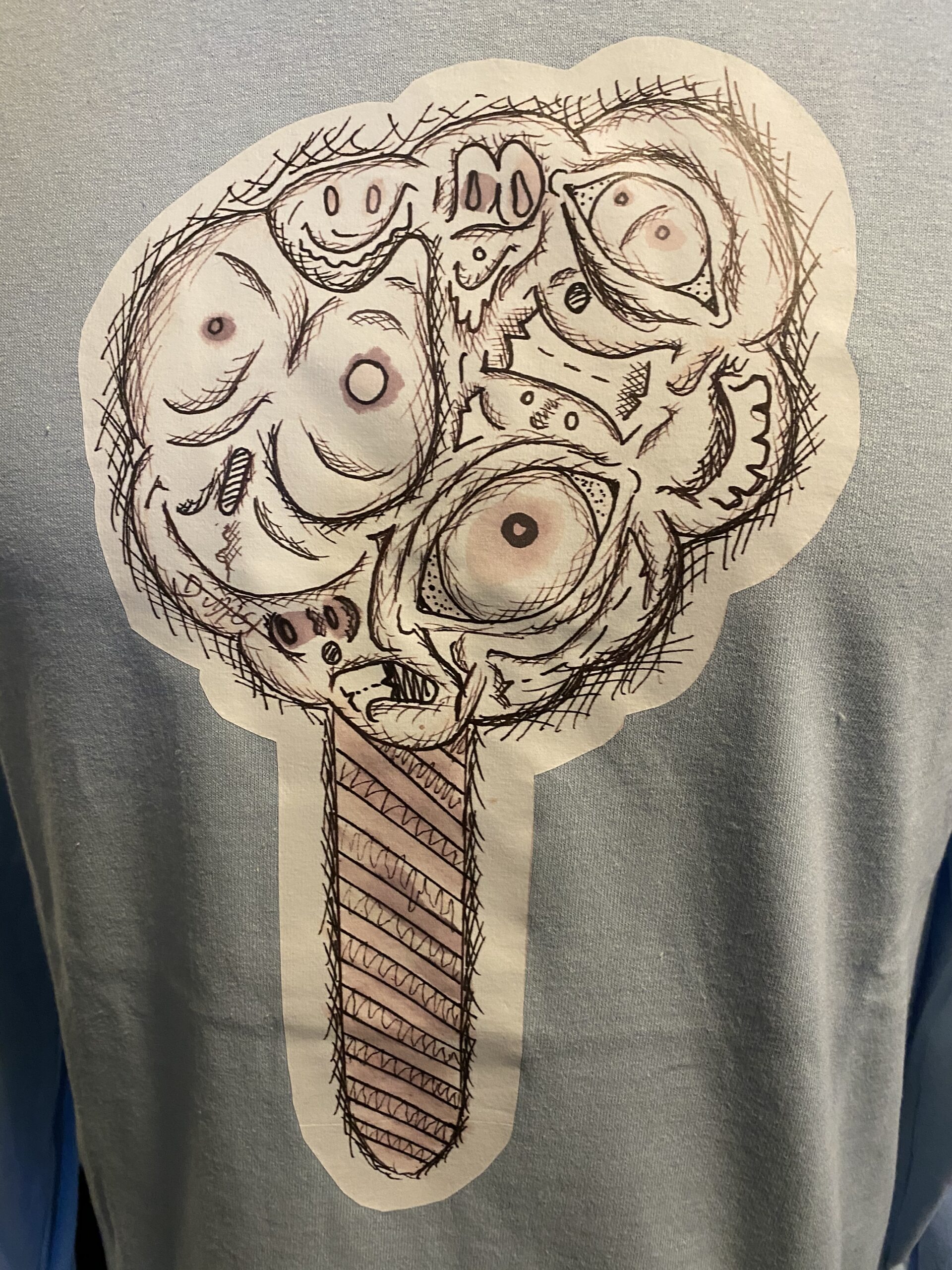 A light blue shirt with an super duper relaxed Candy Cotton print on the front. The Dutch artist Djethro van der Post made the design.