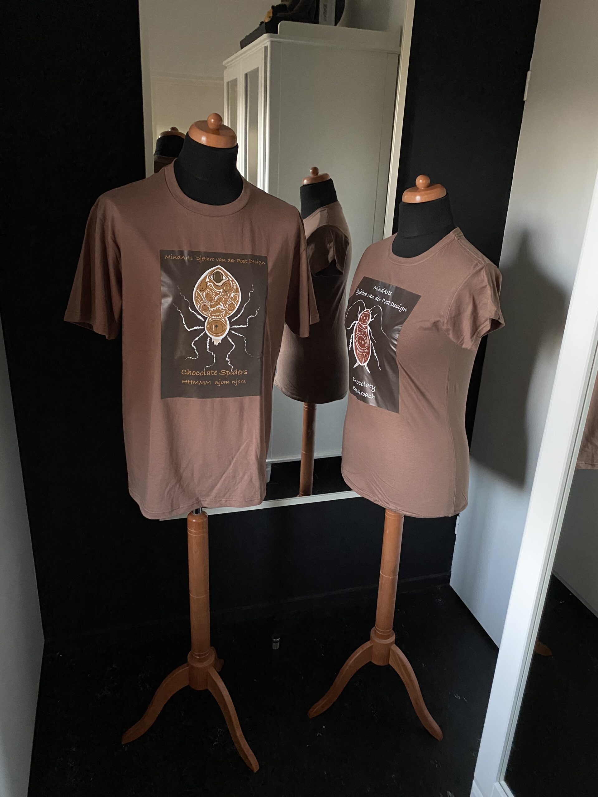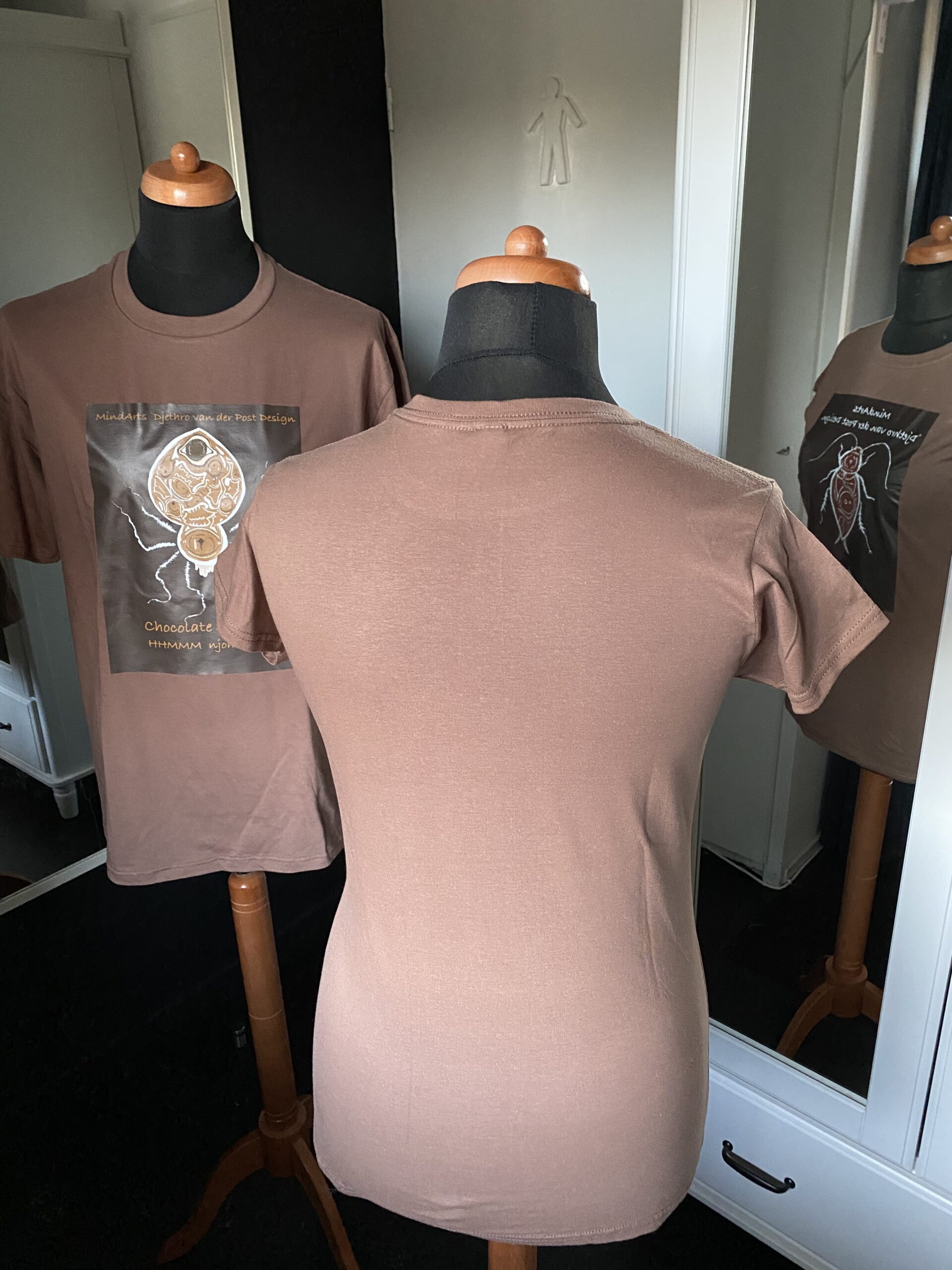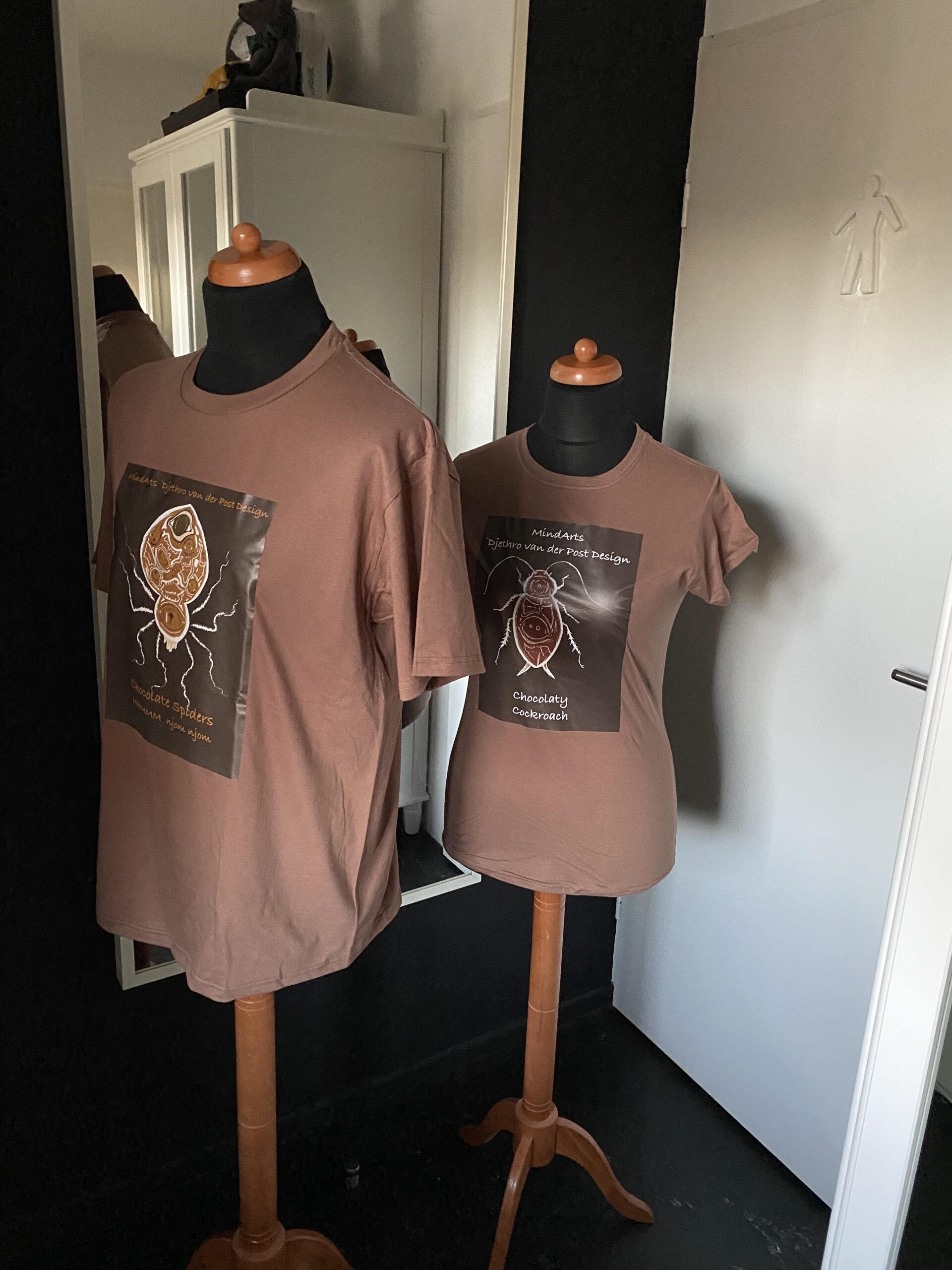 Dit is een chocolade bruin shirt met korte mouwen van 100 % katoen. Wearable Arts met een “ Chocolaty cockroach” print van MindArts design. In de maten M, L, XL.