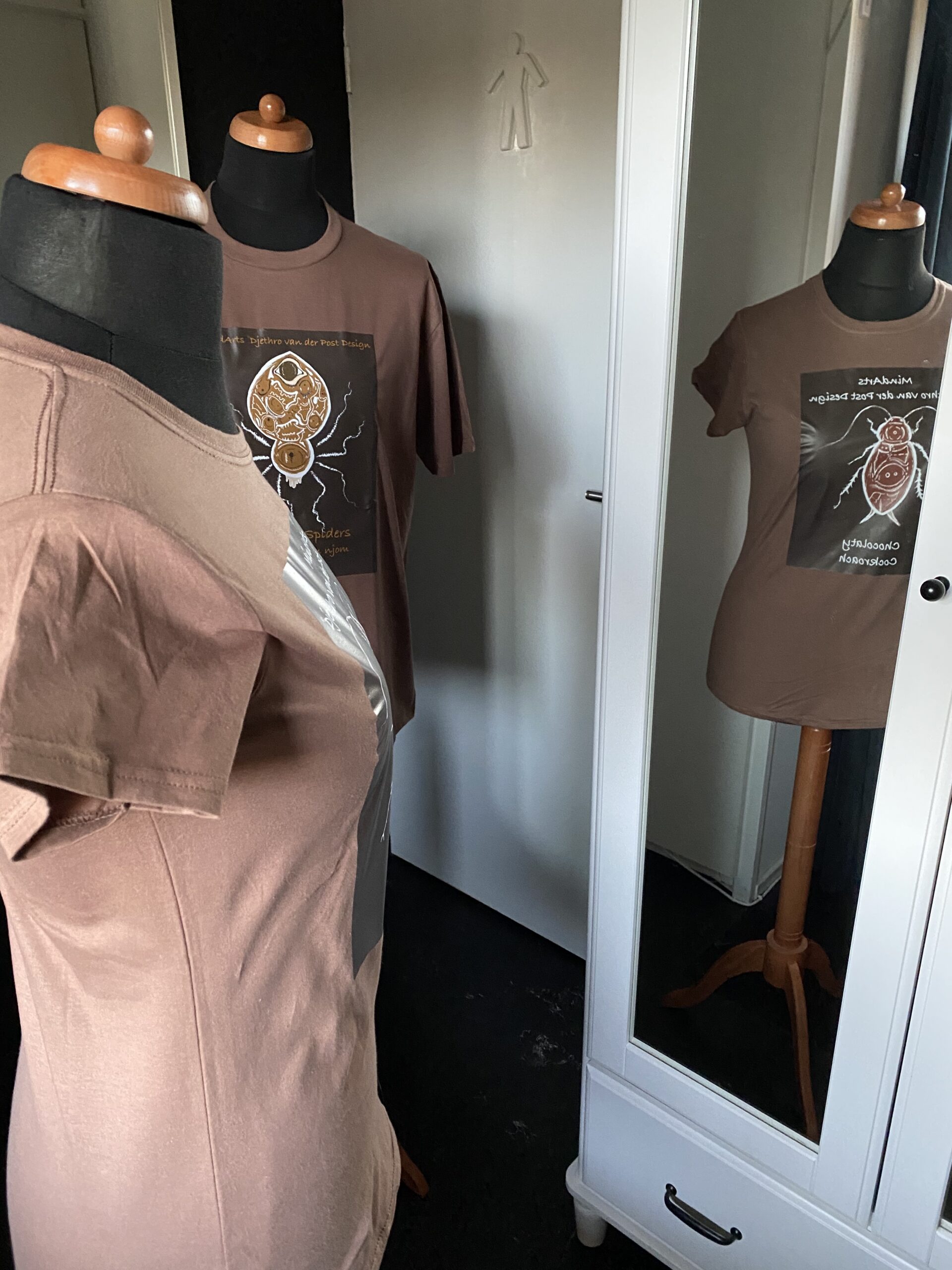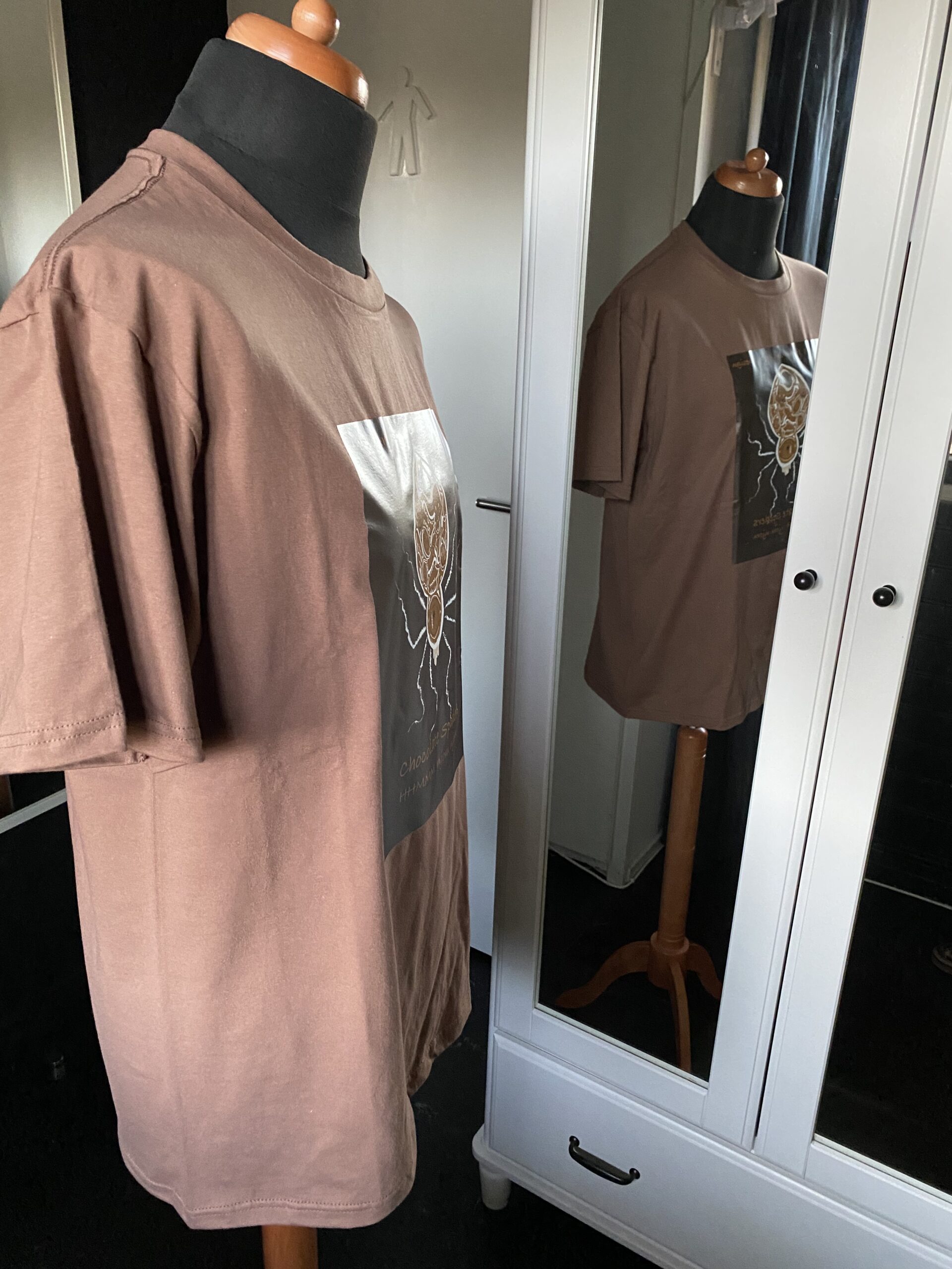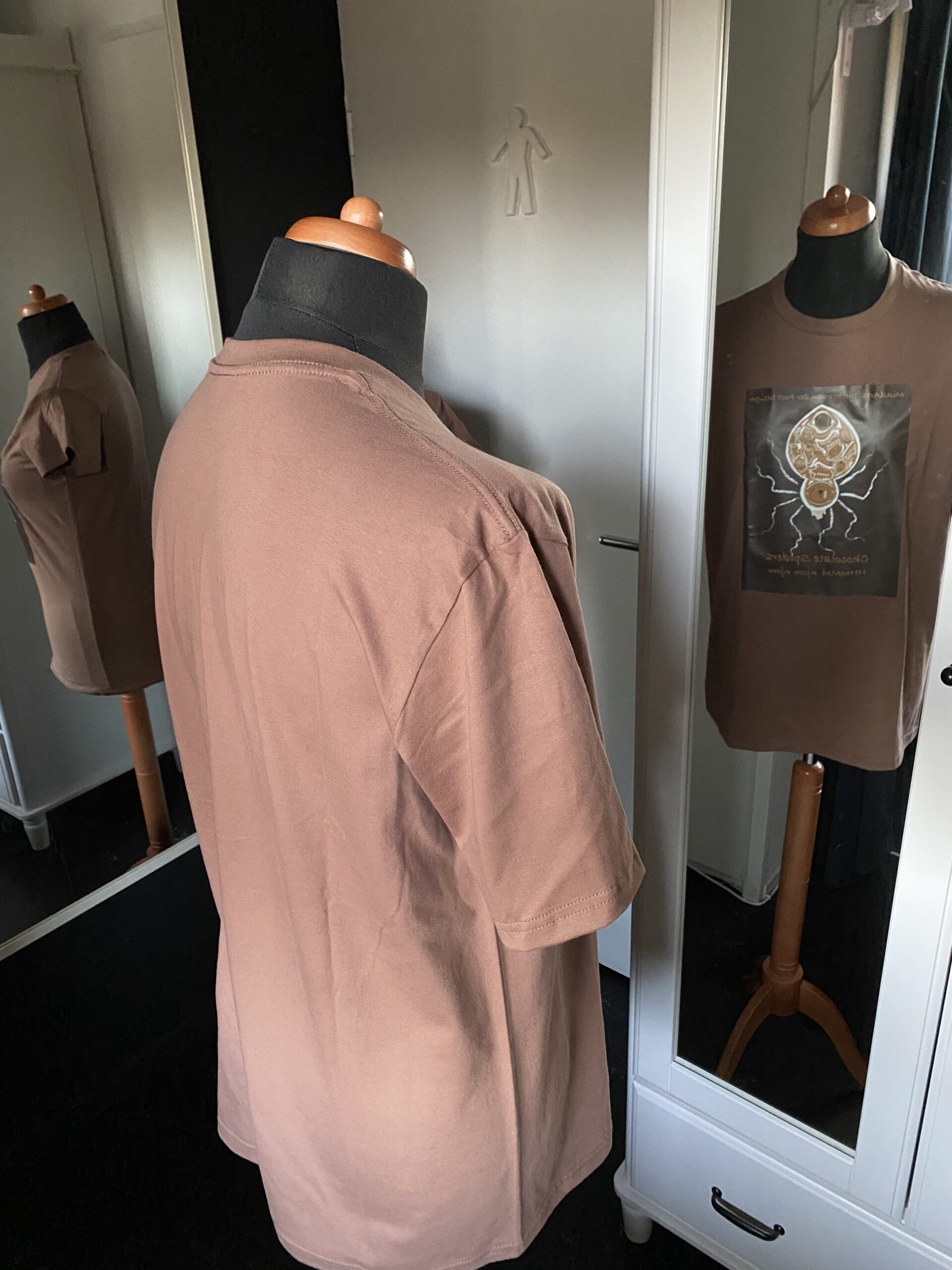 Dit is een chocolade bruin shirt met korte mouwen van 100 % katoen. Wearable Arts met een “ Chocolaty cockroach” print van MindArts design. In de maten M, L, XL.