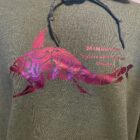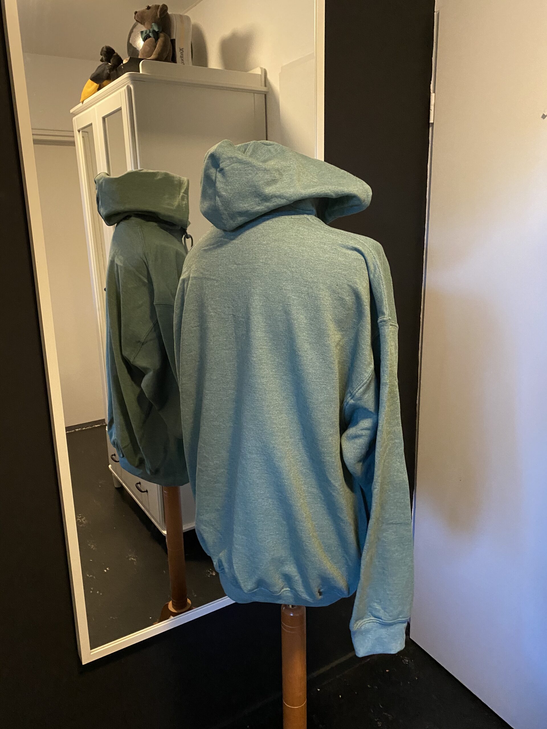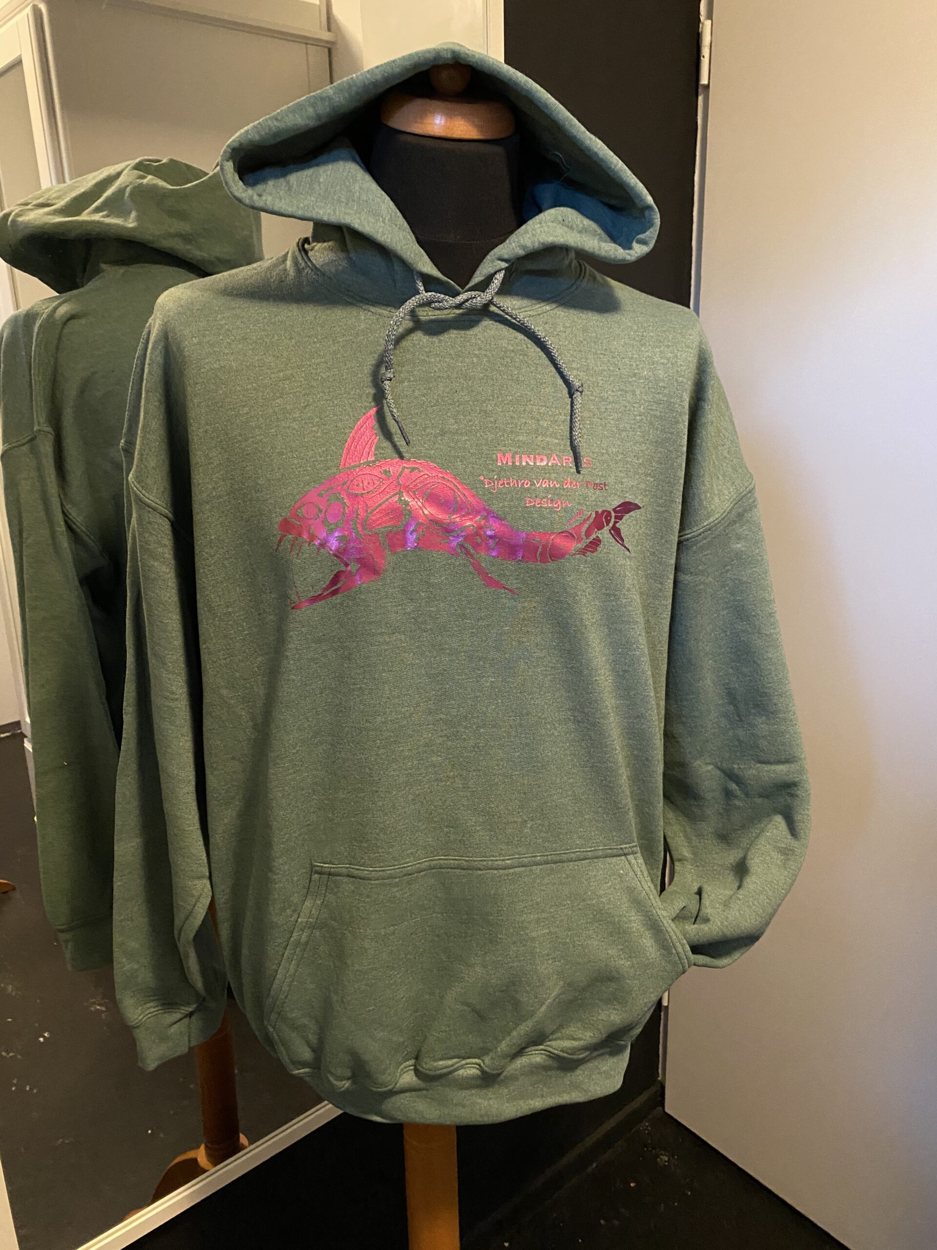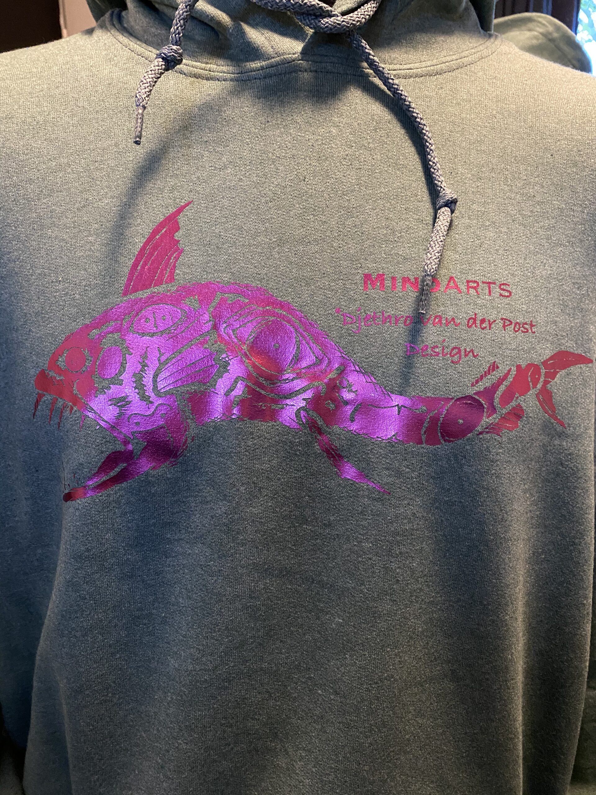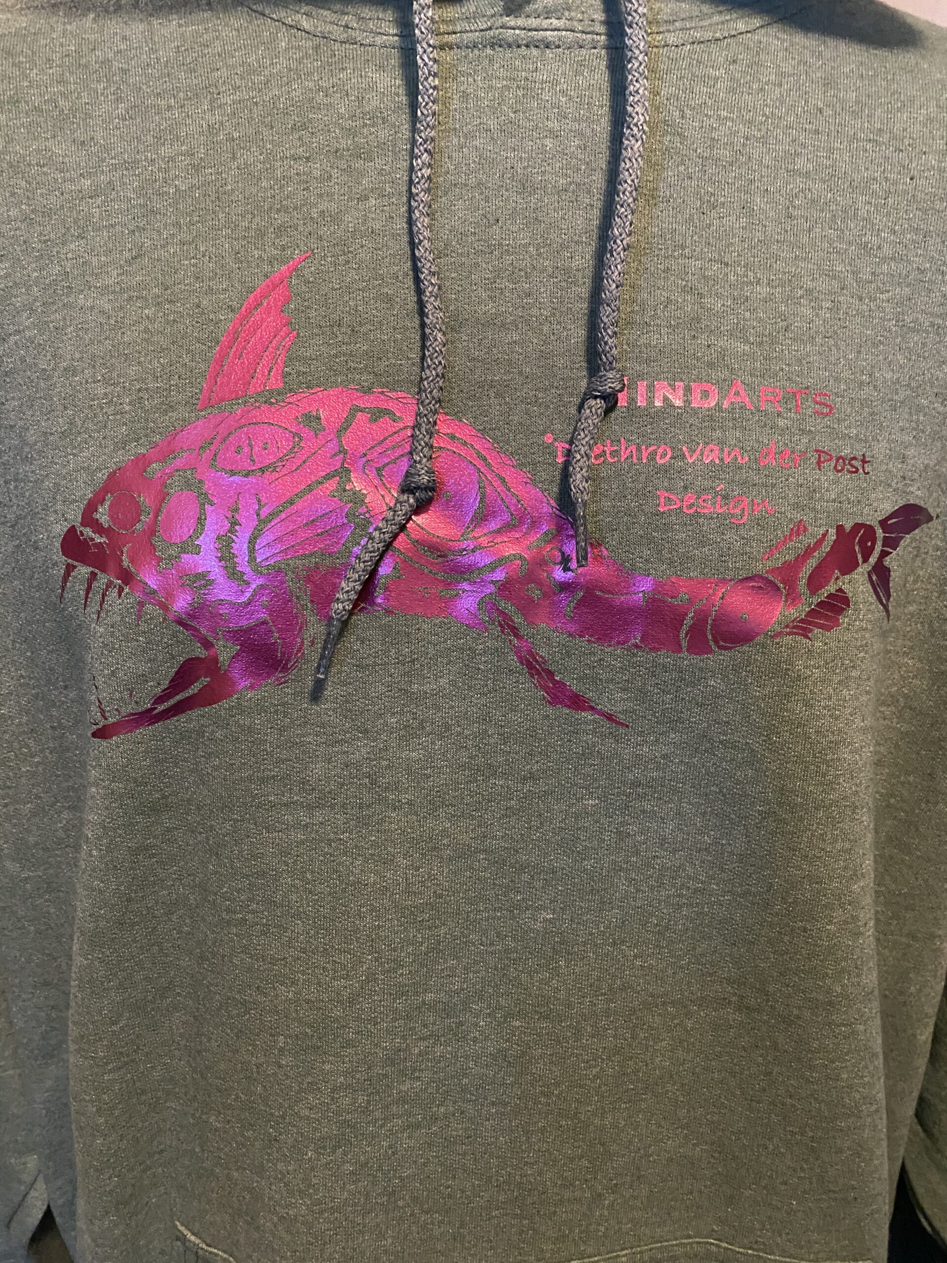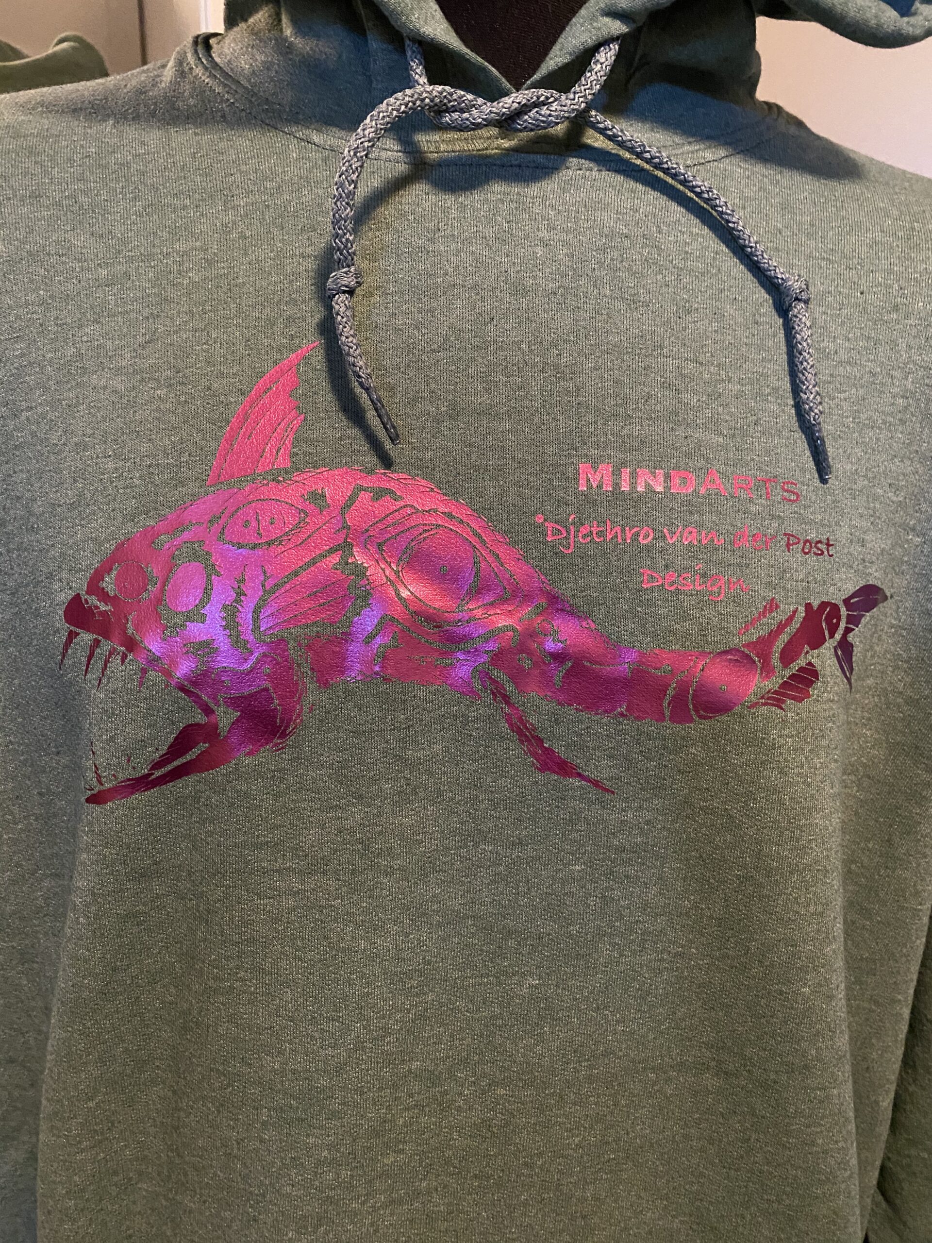 This is a long sleeve, hooded sweatshirt of a high quality “ Heavy Blend Cotton” On it a metallic print of a deep sea fish. Design by Djethro van der Post. In size S, M, en XL