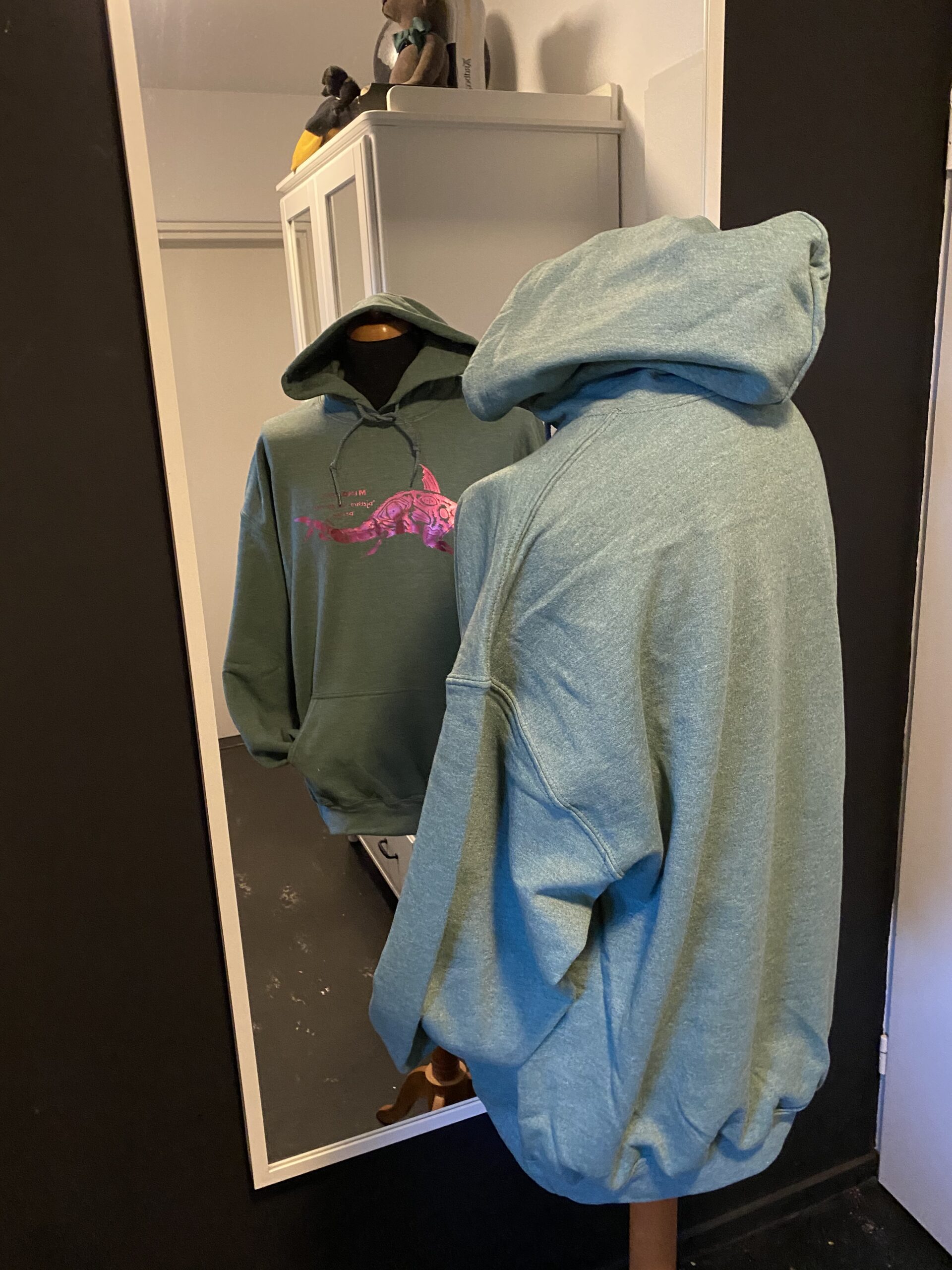 Dit is een sweatshirt met lange mouw en capuchon van een hoge kwaliteit “Heavy Blend Cotton”. Met een metallic print van een diepzee vis. Van de hand van Djethro van der Post. In de maten  S, M, en XL