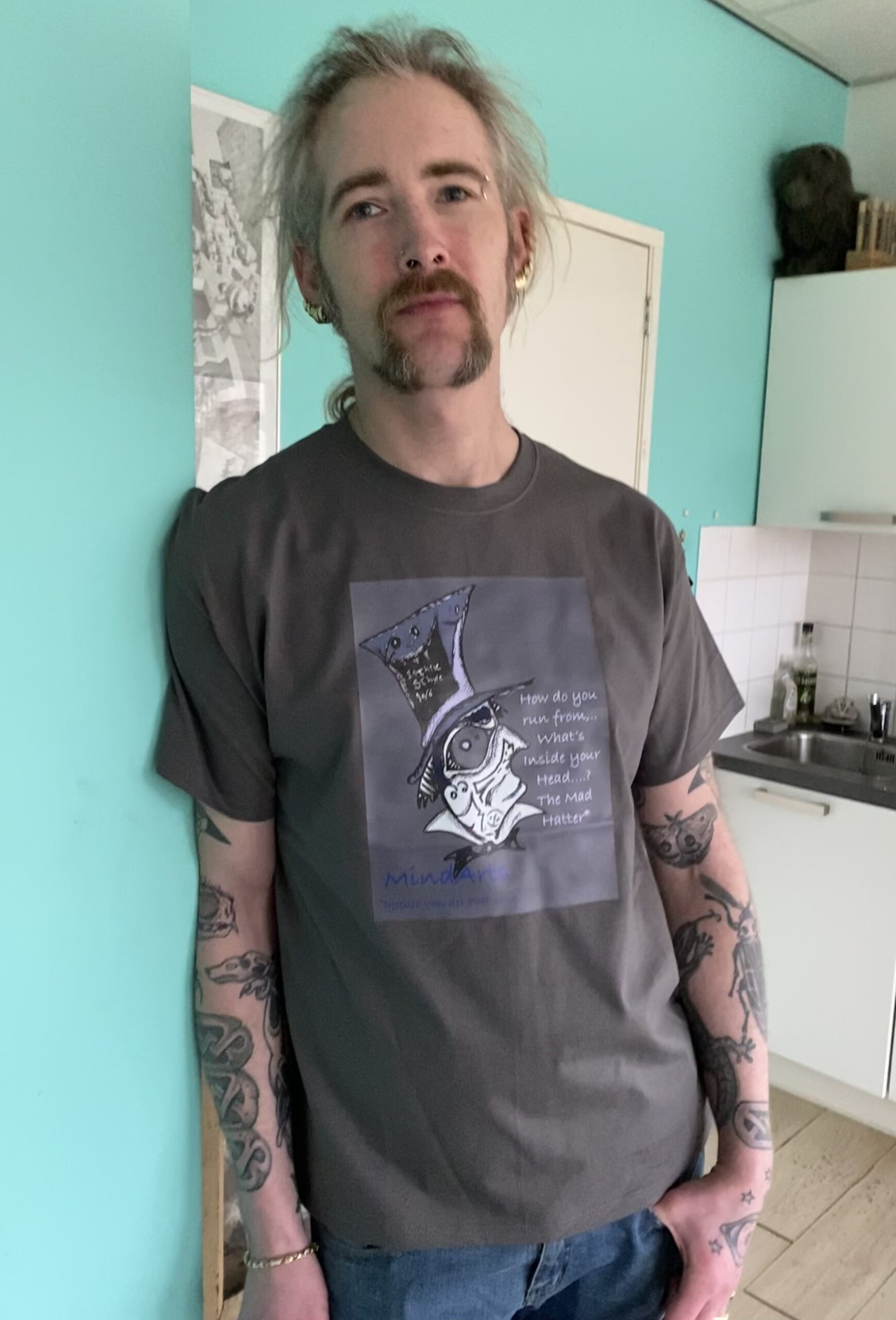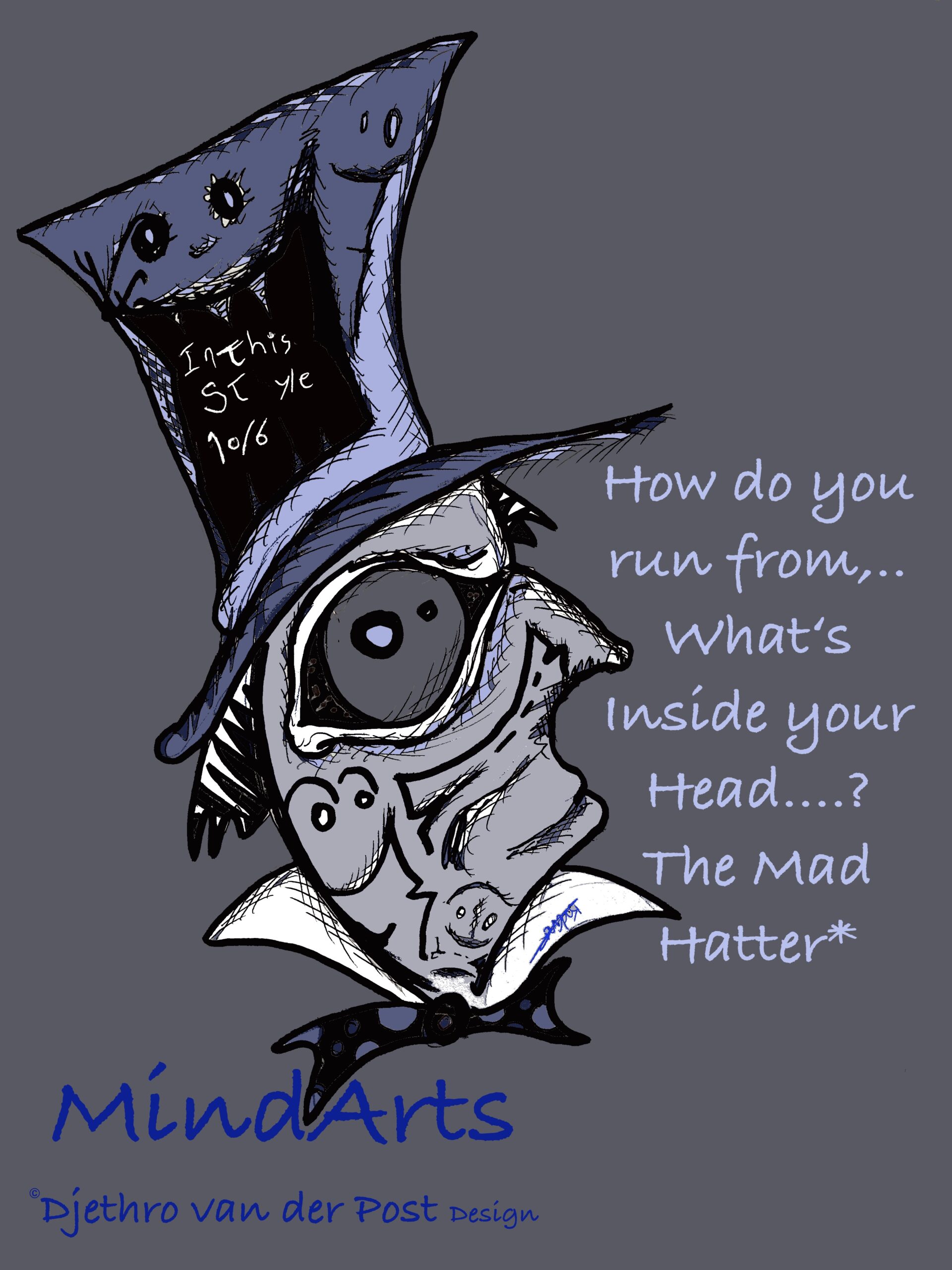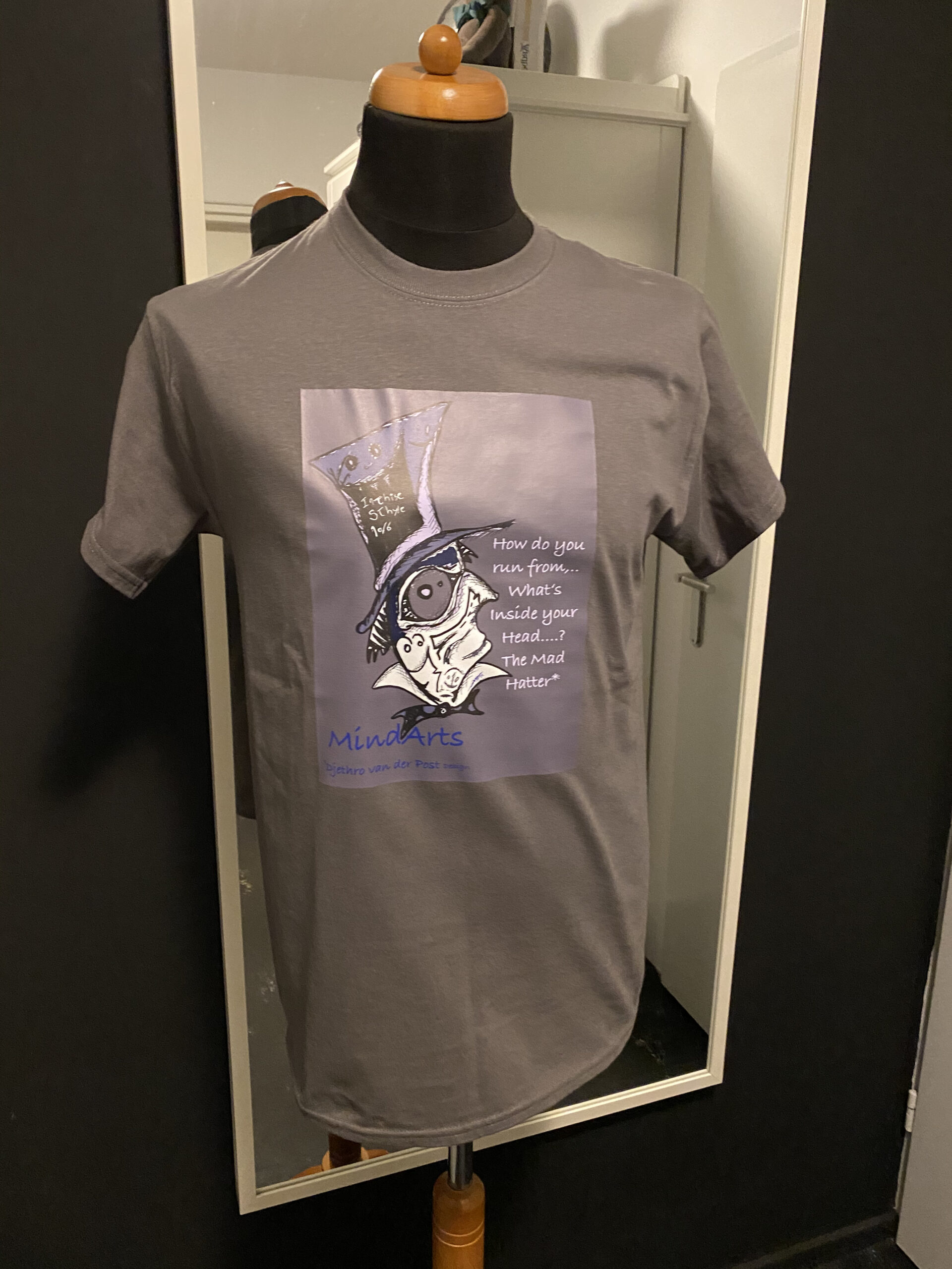 Wearable Arts, geïnspireerd op de verhalen van Lewis Carroll van de Mad Hatter. Een ontwerp in grijs blauwe kleuren, zoals ook de verhalen van de schrijver eigen en gewaagd zijn. Geheel eigen, met een herkenbare Djethro van der Post twist.