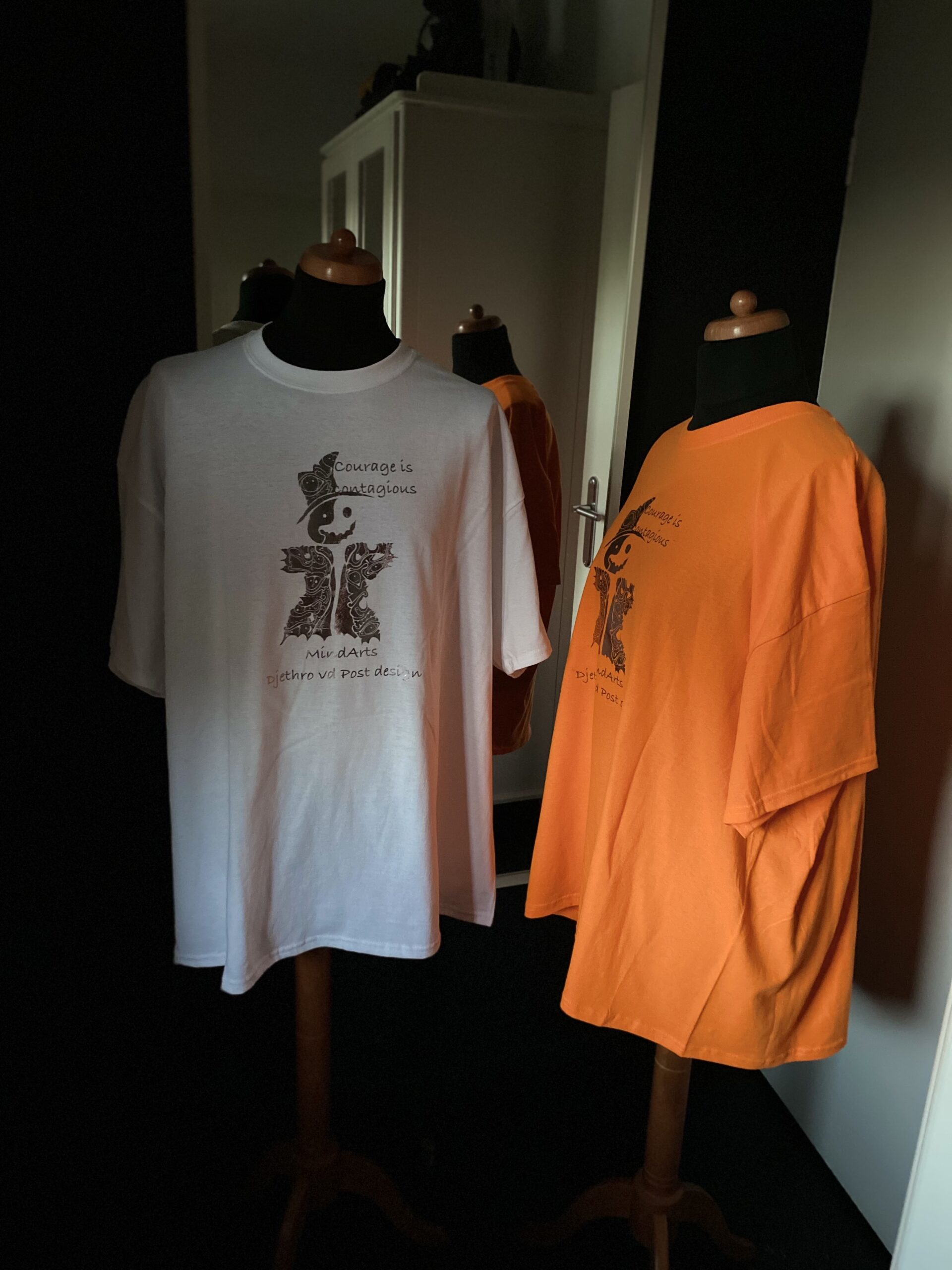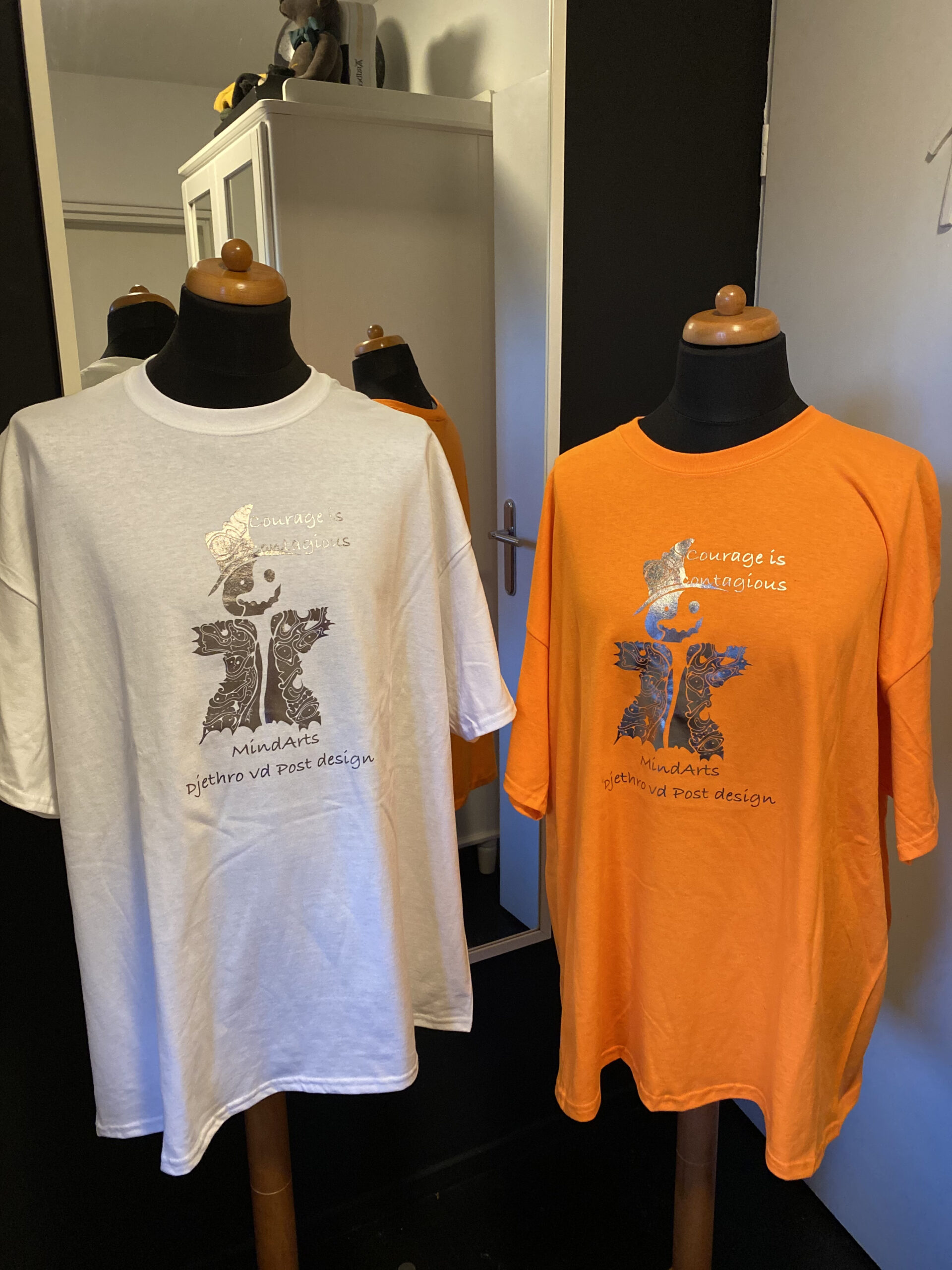 Dit shirt heeft een print met een verbeelding van een geest. Deze geest staat voor angst. Angst is besmettelijk, als iedereen bang is neem je gemakkelijk mensen mee in de angst. Voor ons is het van belang dat Moed, Courage, even besmettelijk is. Als je er met elkaar voor gaat en je angst overwint, kun je samen groots worden. En elkaar een hart onder de riem steken.
