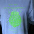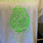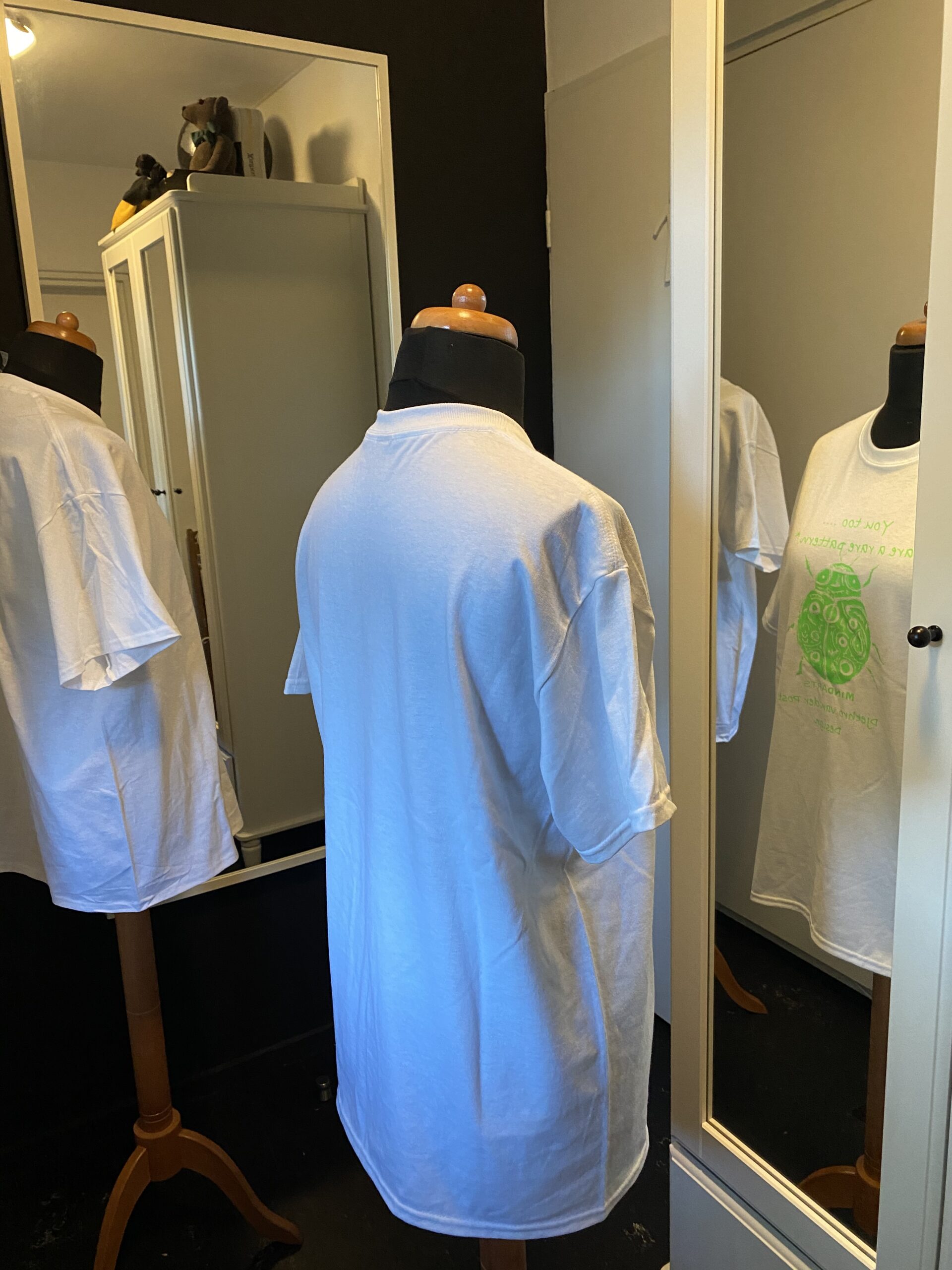 White cotton short sleeves shirt printed with a bright green neon ladybug. In size L