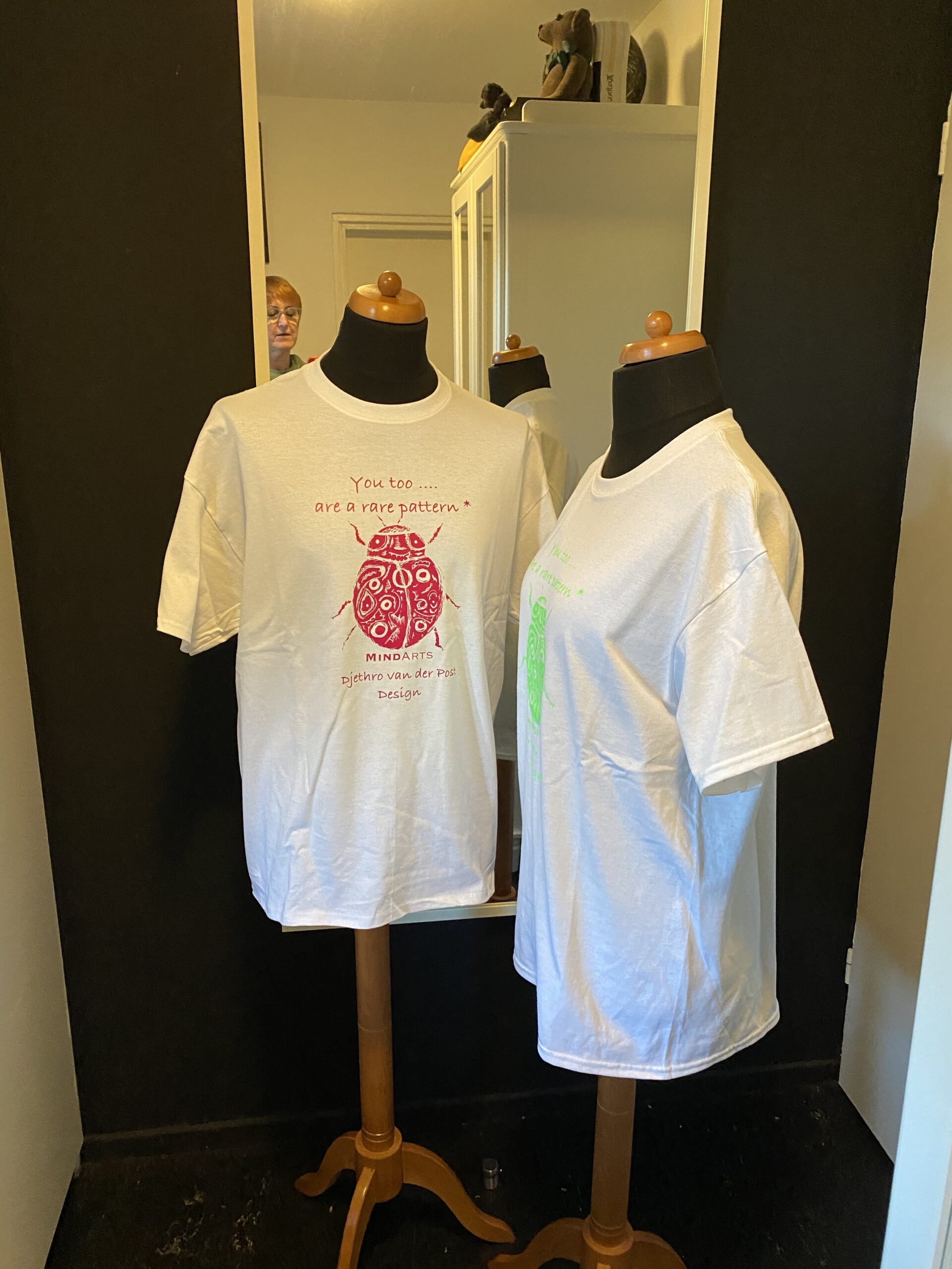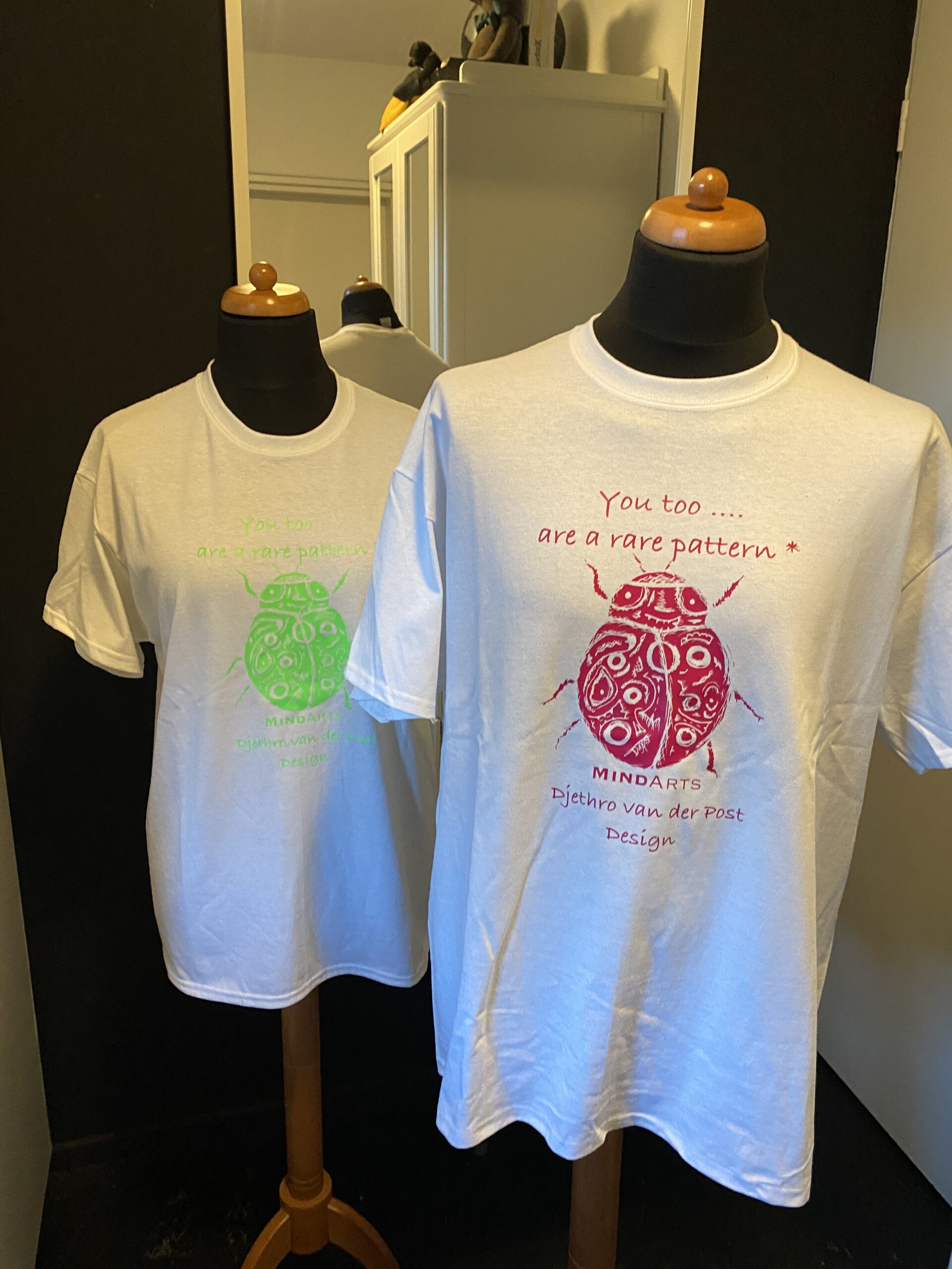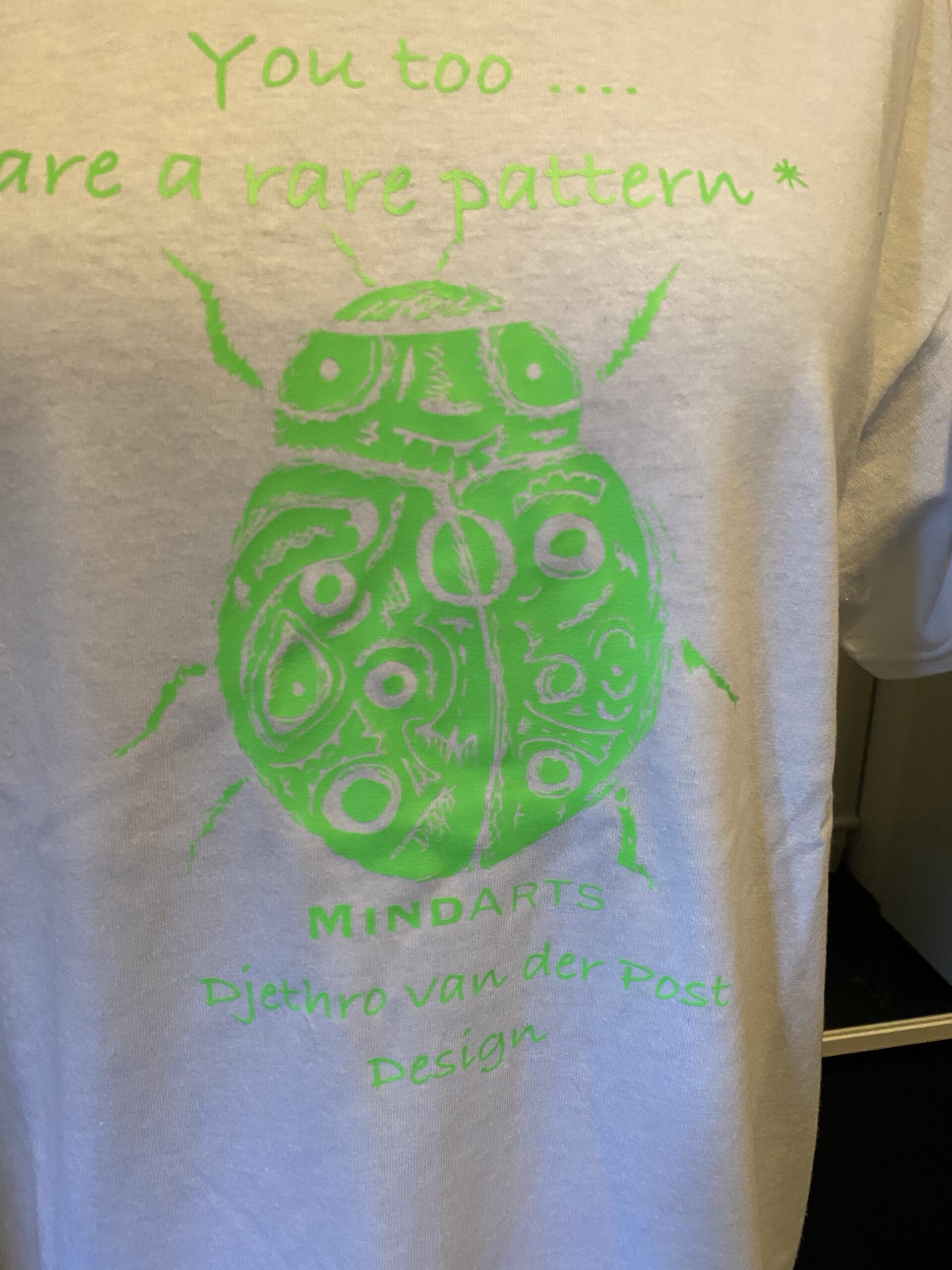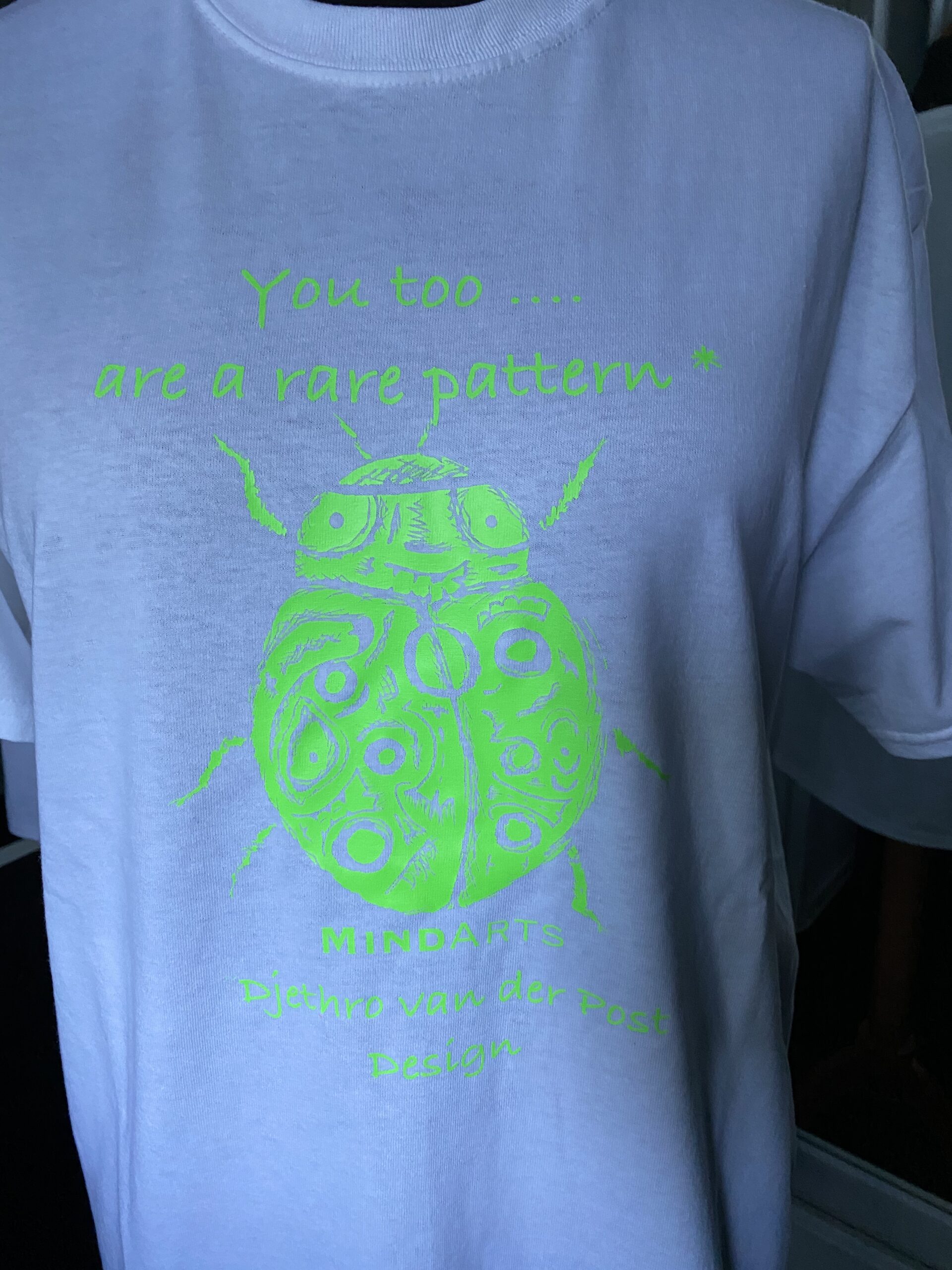 This shirt has a ladybug’s print in a bright neon colour. With above the tekst “You too are a rare pattern”. It gladly is. Everybody is unique. And dances to their own merry tune. That’s what makes it beautiful. Each with a own completion in addition to each other. Djethro got inspired by nature and the works of Coralie Bickford-Smith.