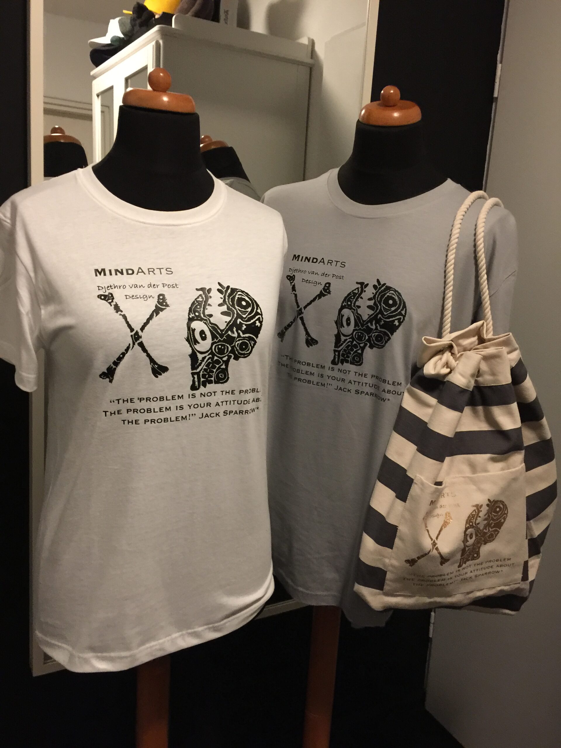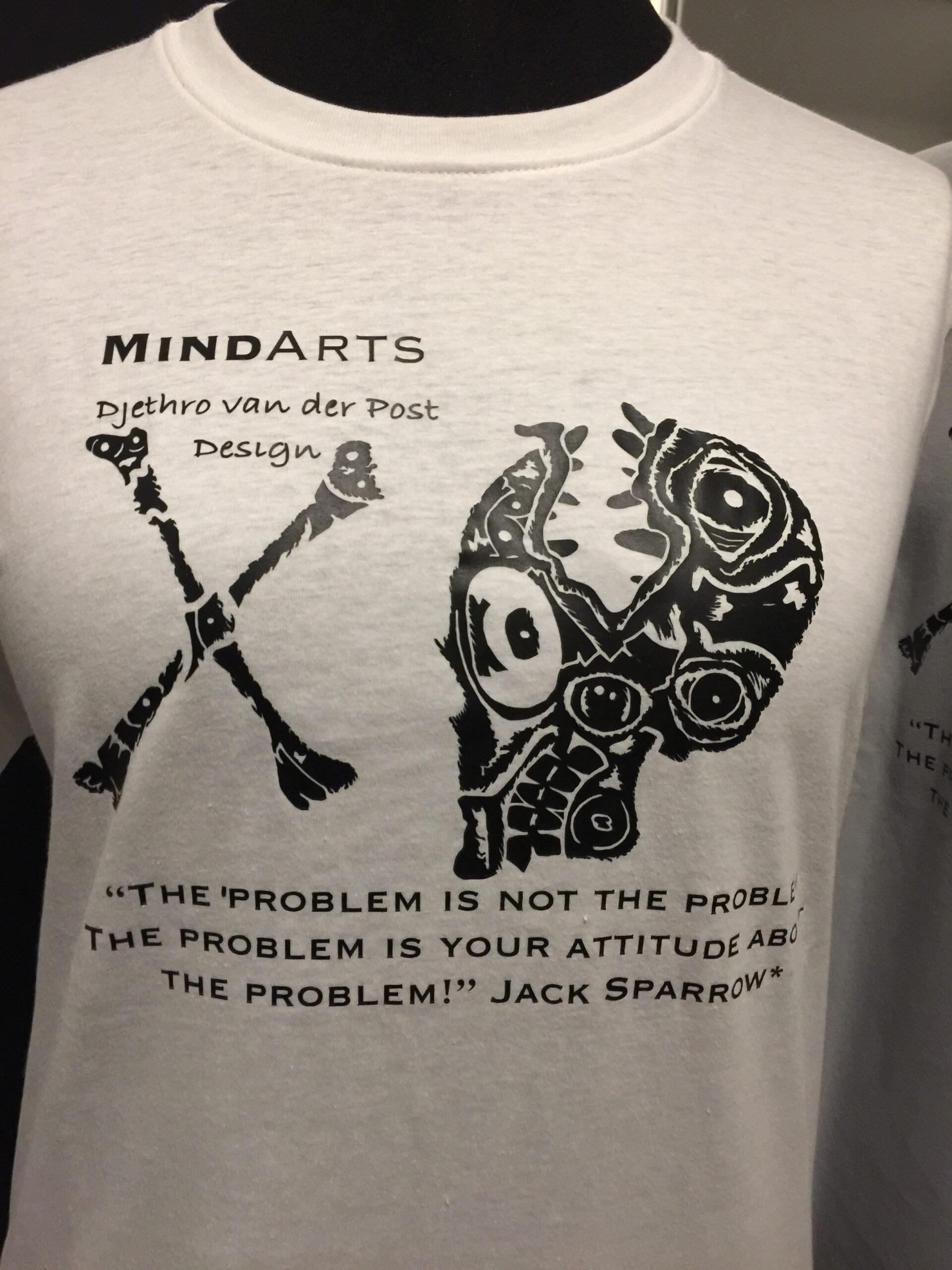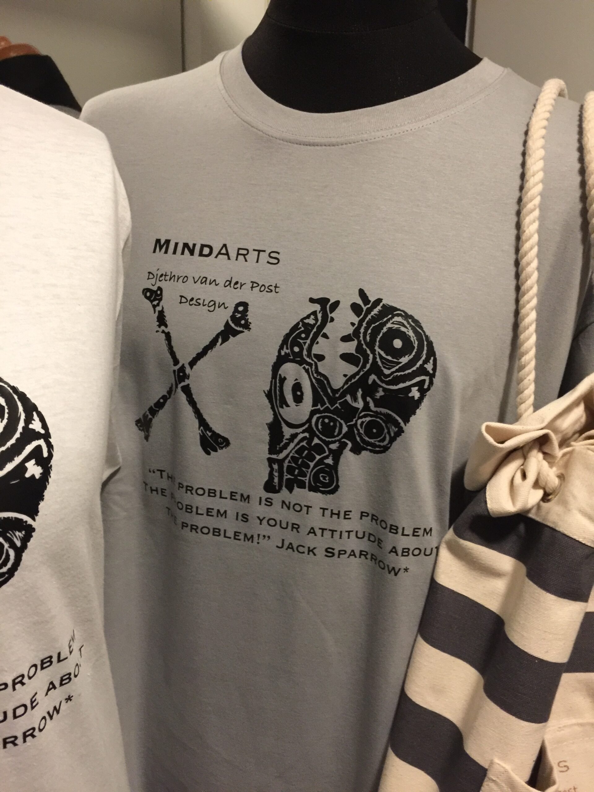 Inspired by the stories Treasure Island and Pirates of the Caribbean, Djethro van der Post made a Pirate design in his recognisable style. Especially the colourful words from Captain Jack Sparrow triggered many thoughts and ideas. An enlightening quote for readers. Printed in treasury black. Ahoy… Don’t forget searching for truest treasures in life. And we can tell you “ Not all treasures are Gold and Silver….”